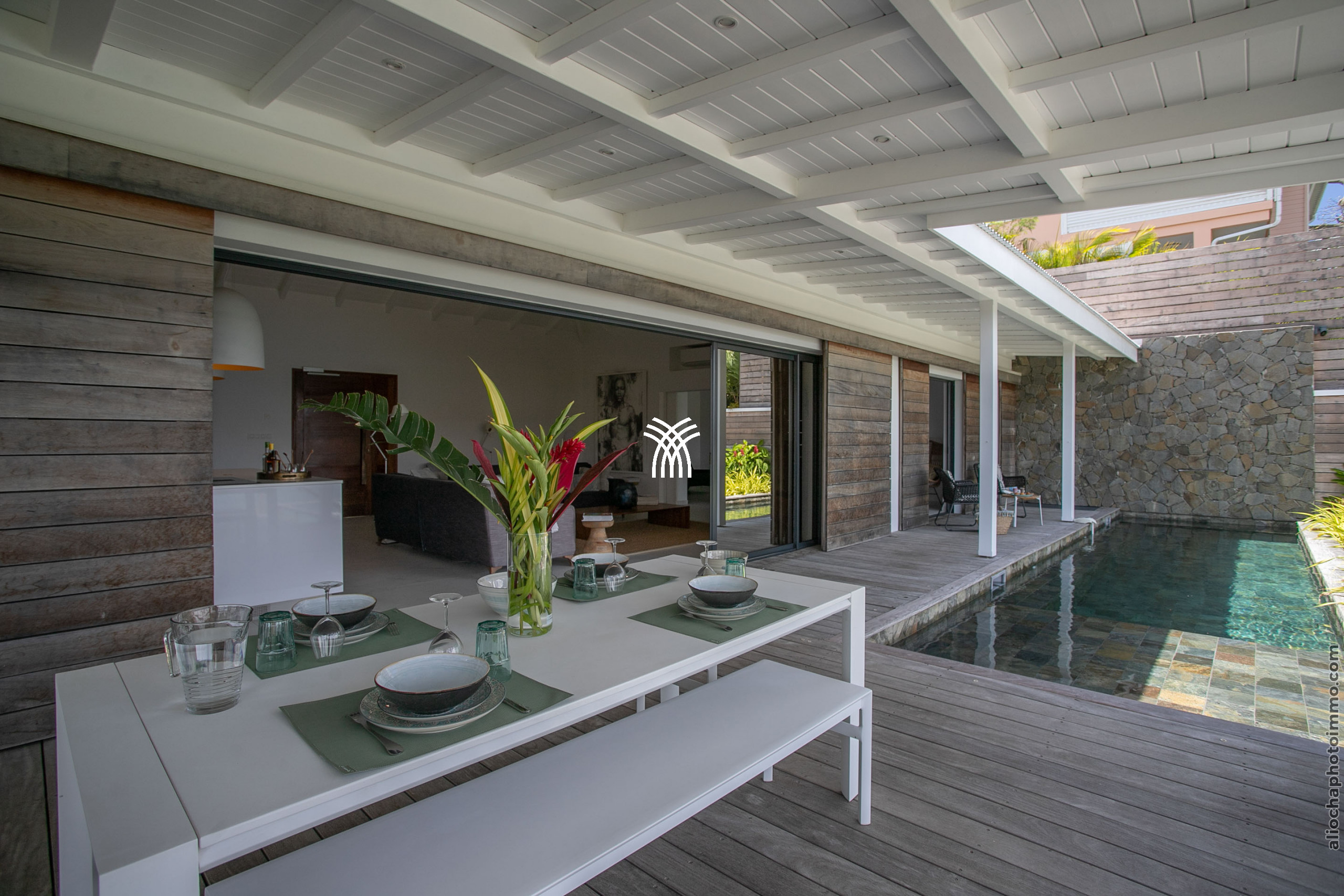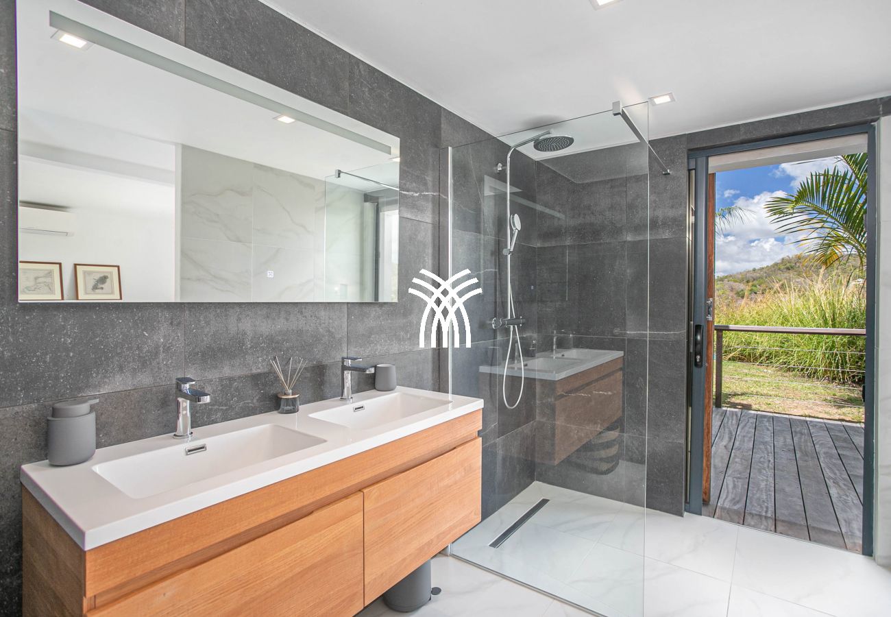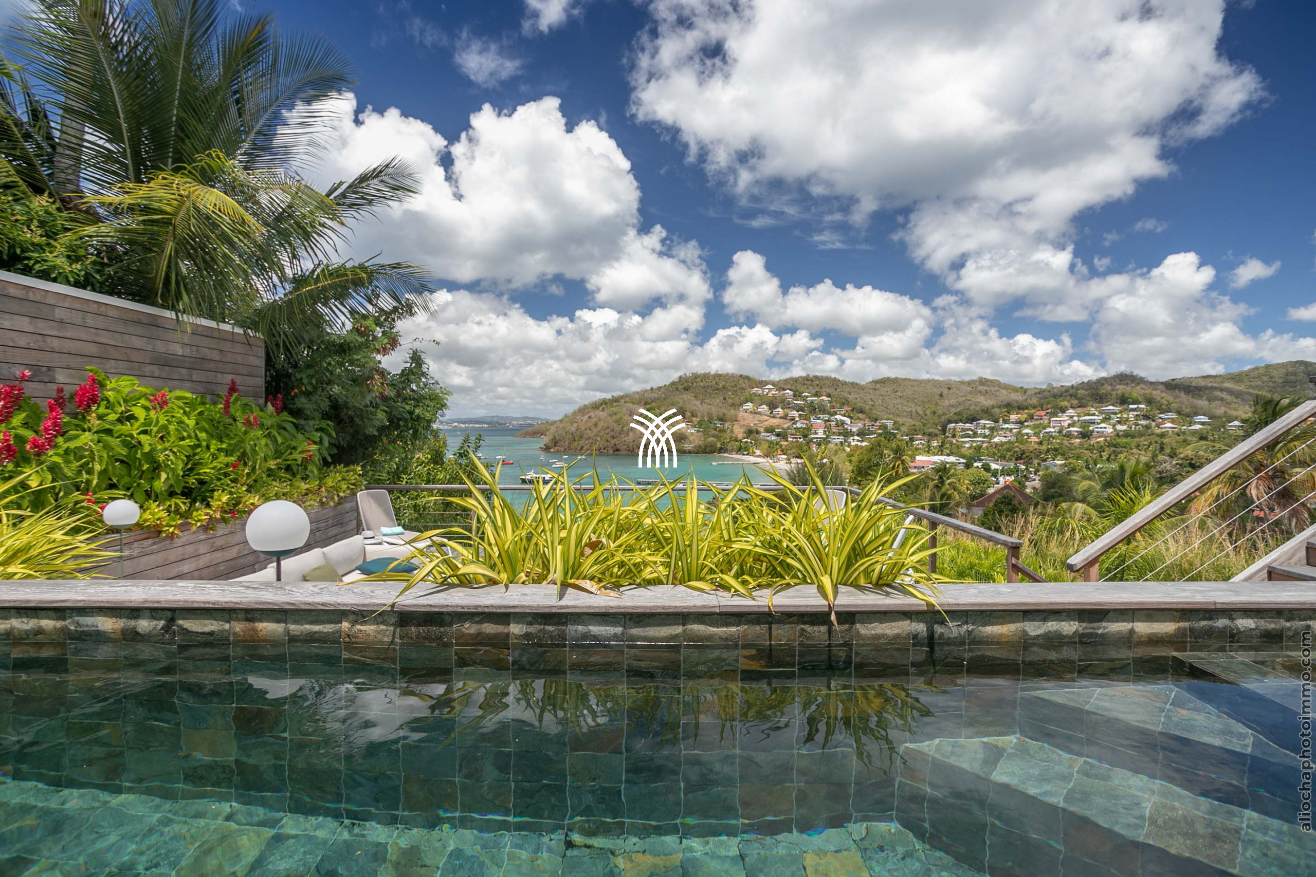 The villa's spacious terrace overlooks the sea, providing an ideal setting to enjoy the mild climate of Martinique. The 11-meter by 3-meter swimming pool, designed as a lap pool, adds an extra touch of luxury. You can share your meals outdoors in this modern and refined space while admiring the spectacular view.
