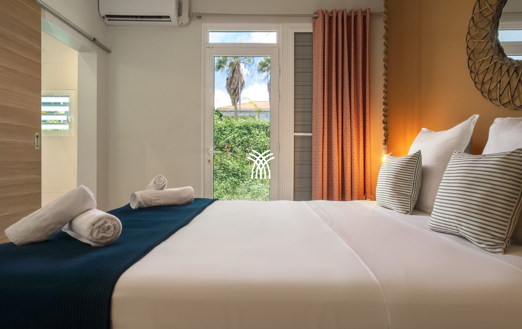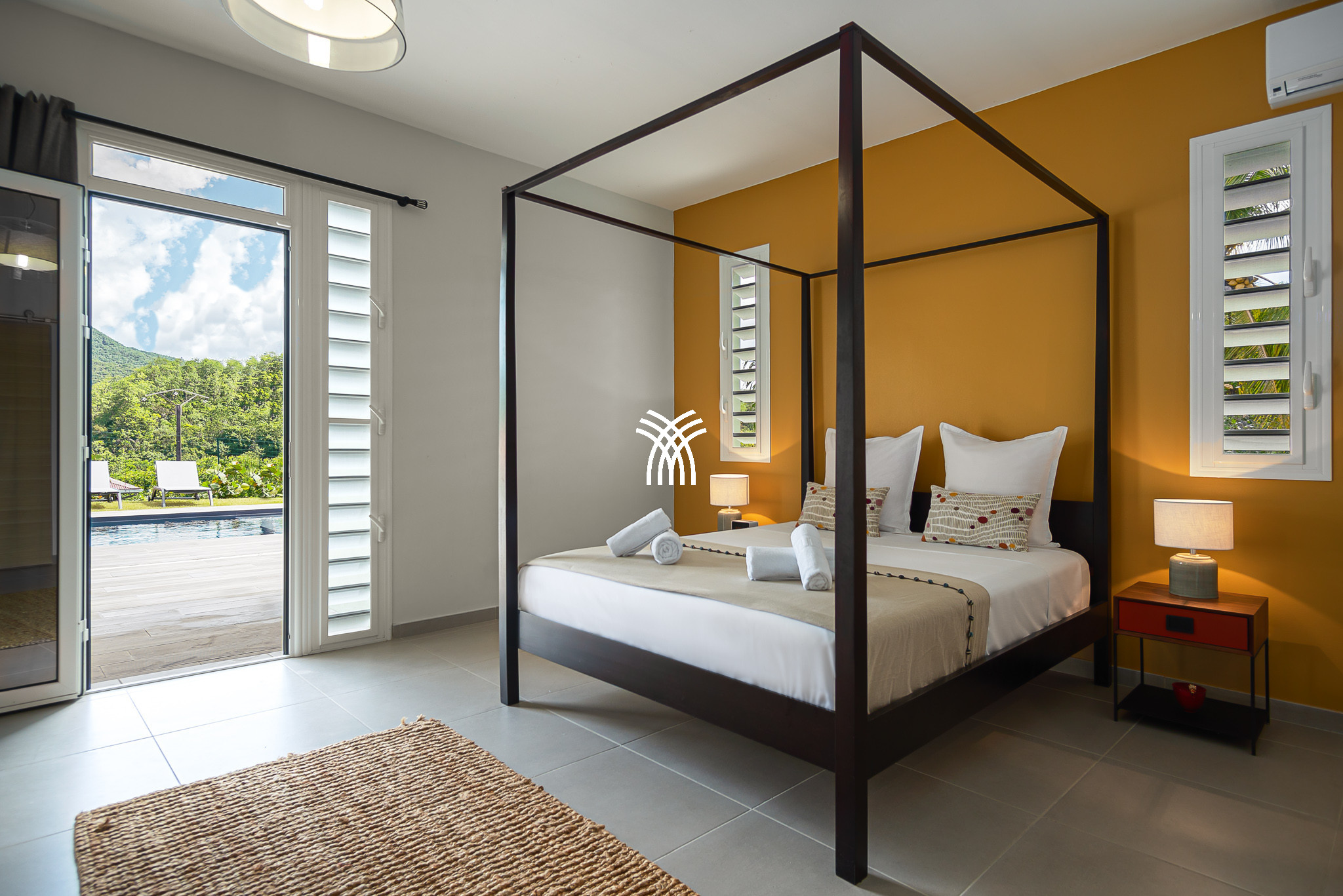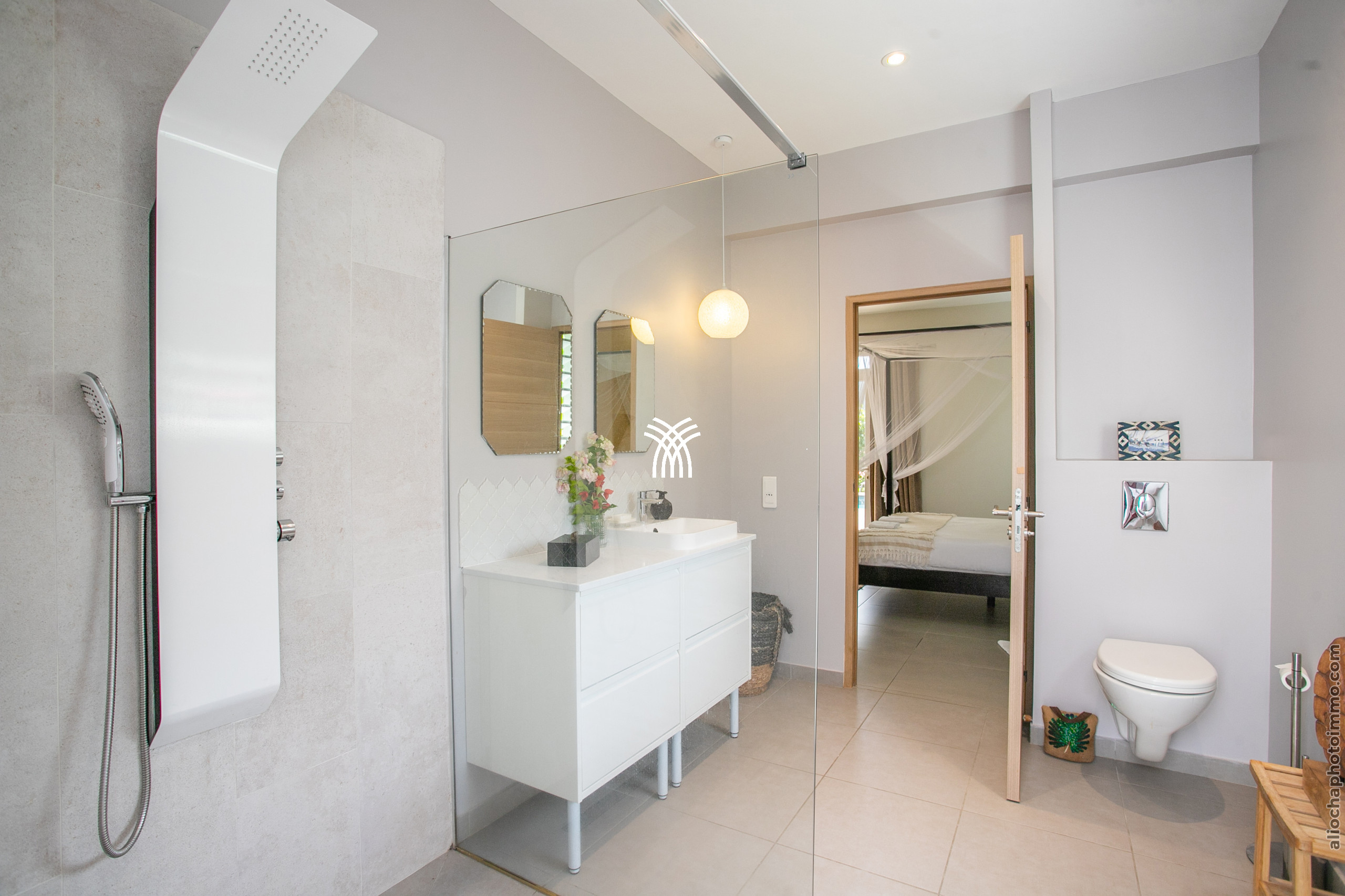 The villa has four comfortable rooms, including a superb master suite with a private bathroom and outdoor shower, a true tropical signature. The other rooms, decorated in elegant shades of ochre, blue, orange, or water green, invite personalised moments of relaxation. Two additional bathrooms and an adjoining washroom ensure optimal comfort for family or friends stays. Every detail has been designed to meet the standards of a luxury villa rental in Trois-Îlets, with complete equipment, generous volumes, and a refined atmosphere.