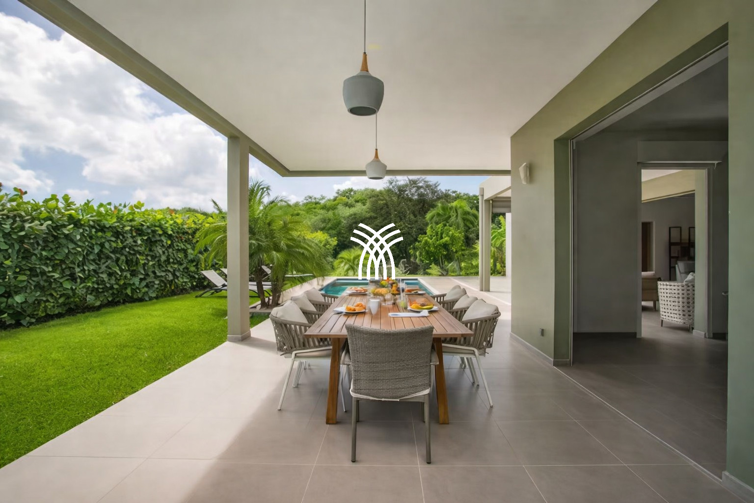 Designed on a single level to fully enjoy the tropical climate and natural light, Villa Jana unfolds vast open spaces where the interior and exterior become one. The large bay windows extend the living room and kitchen towards the terrace and private pool, creating an indoor-outdoor atmosphere typical of the most beautiful luxury villa rental properties in Martinique. The contemporary architecture harmoniously blends with natural tones, soft materials, and surrounding vegetation to offer a soothing ambiance, conducive to relaxation.