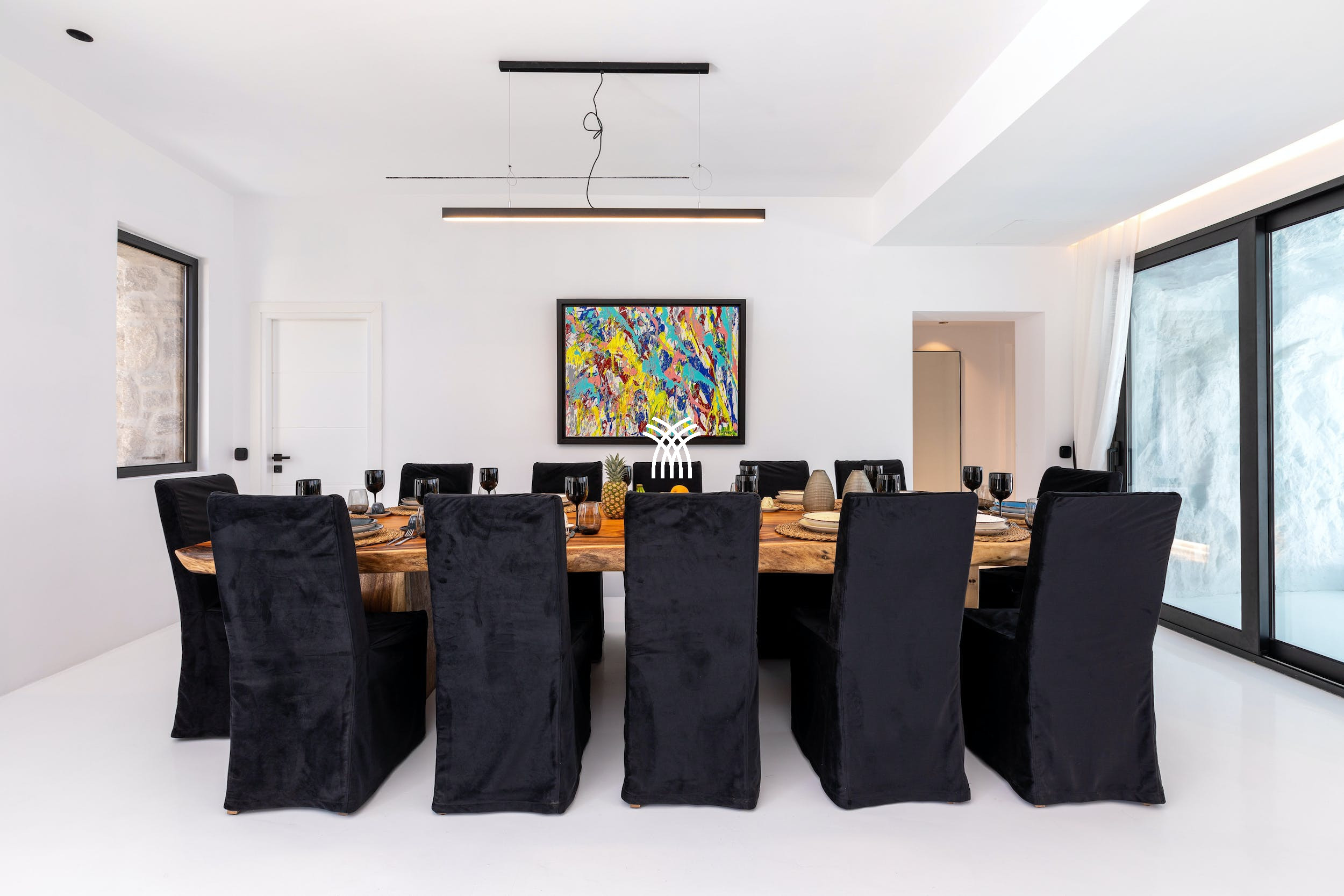 Elegant outdoor spaces include a generous lounge area perfect for sunset cocktails and a shaded veranda with a grand dining table for twelve, ideal for al fresco meals under the stars. Inside, the villa showcases iconic Mykonos style with soaring ceilings, pale wood beams, and crisp whitewashed walls enhanced by polished cement floors and contemporary luxury amenities.