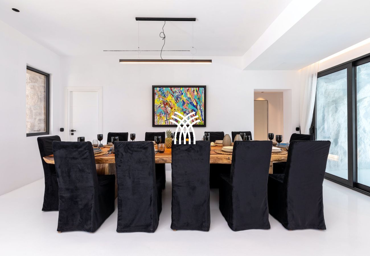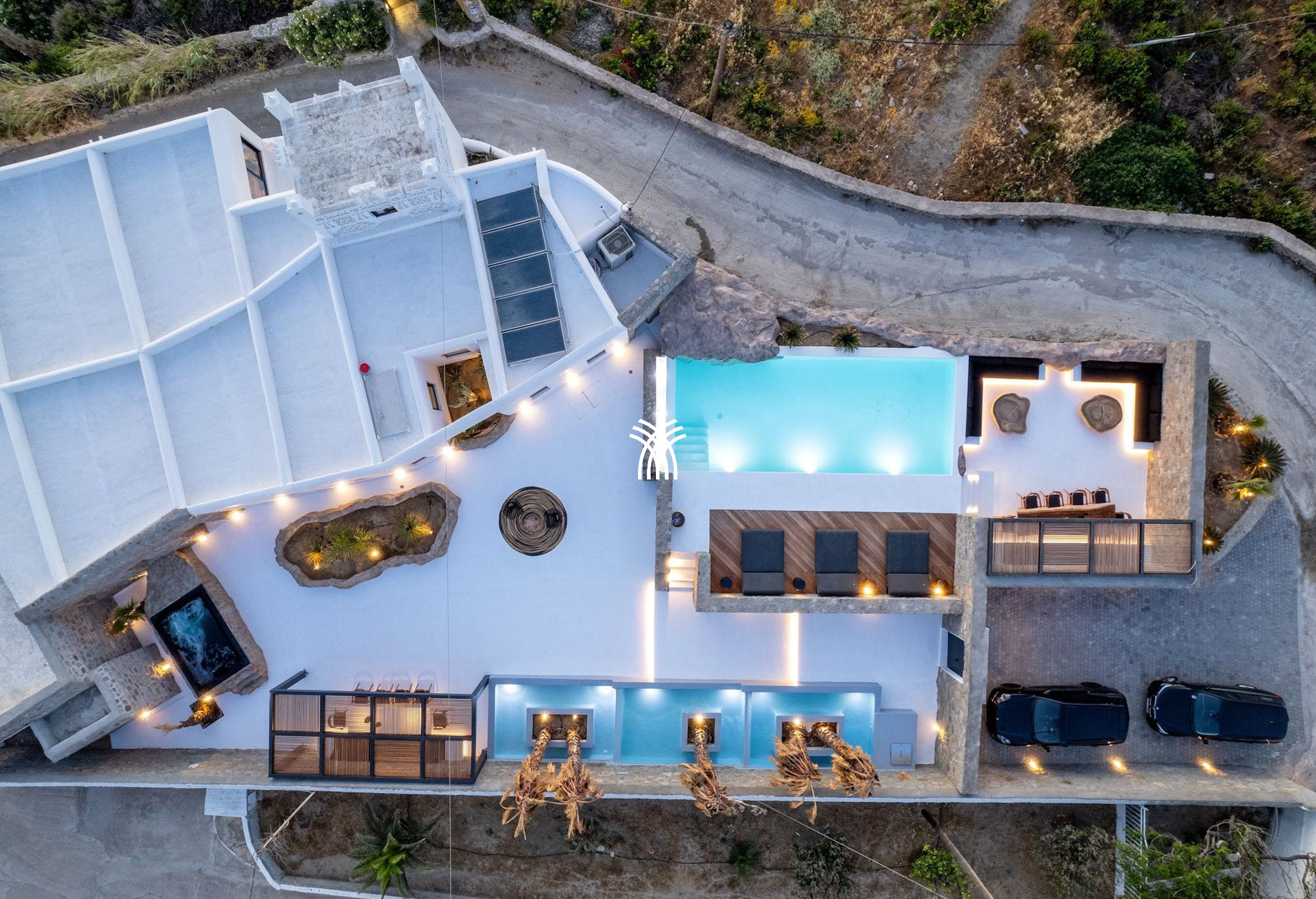Designed for those who seek refined tranquility, Villa Delano accommodates up to thirteen guests in absolute comfort. The architecture marries natural stone with sleek white render, creating a rustic yet modern ambiance that harmonizes with its stunning natural surroundings. The infinity pool appears to float above the cliffs, merging with the dazzling Aegean Sea on the horizon—a true highlight of this luxury villa rental in Greece.