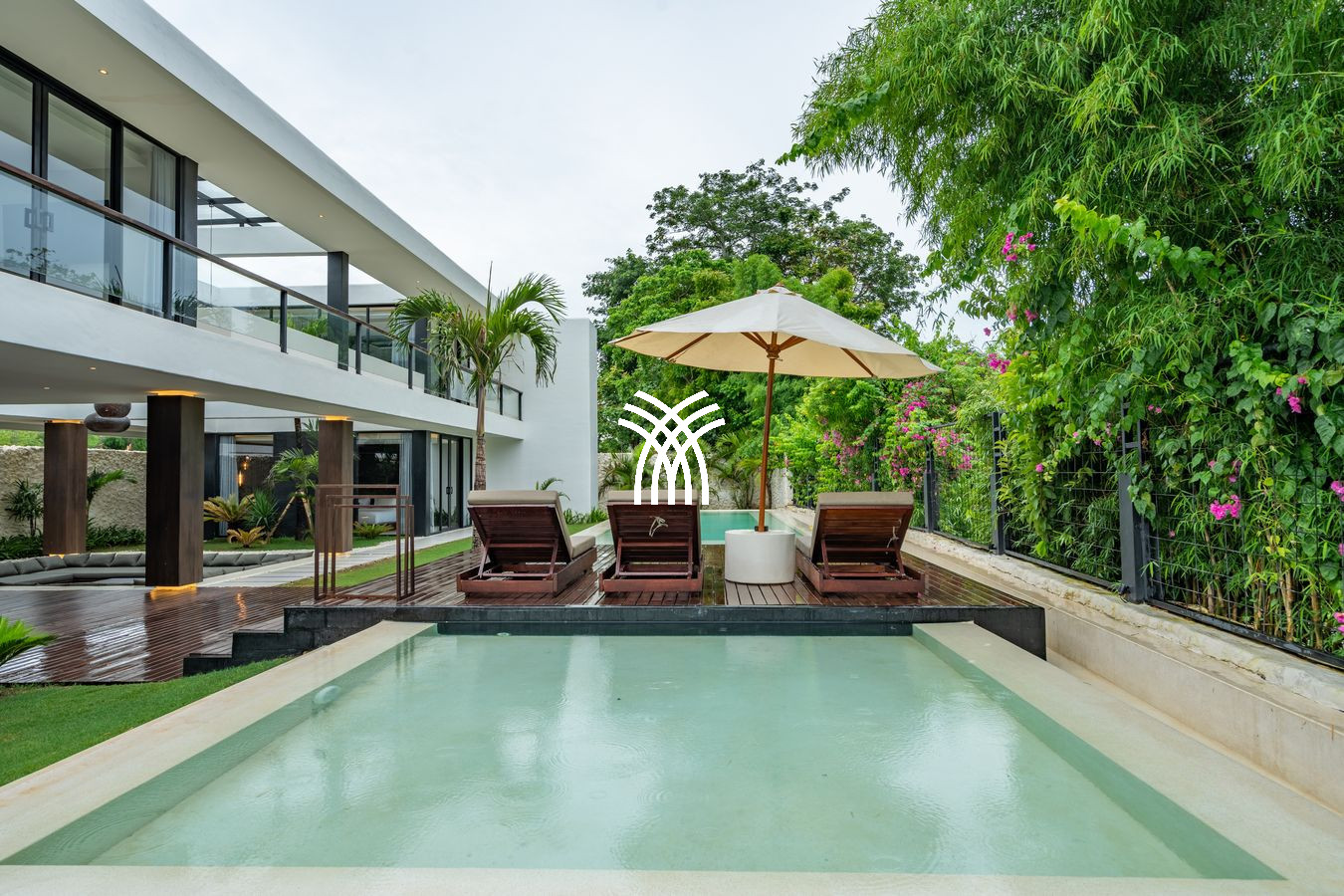 The villa stands out with its immense infinity pool, perfect for admiring the blue hues of the sea and sky, as well as its outdoor jacuzzi and heated cave pool, a true oasis of serenity. The outdoor spaces are designed to offer unforgettable moments: relax on immersed sunbeds, enjoy a dinner under the stars in the sheltered dining area, or let yourself be lulled by the sea breeze from the elegant outdoor lounges.