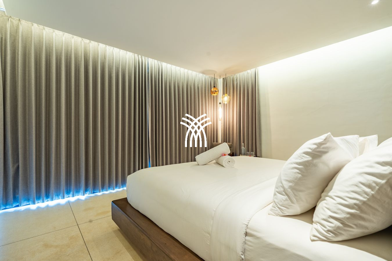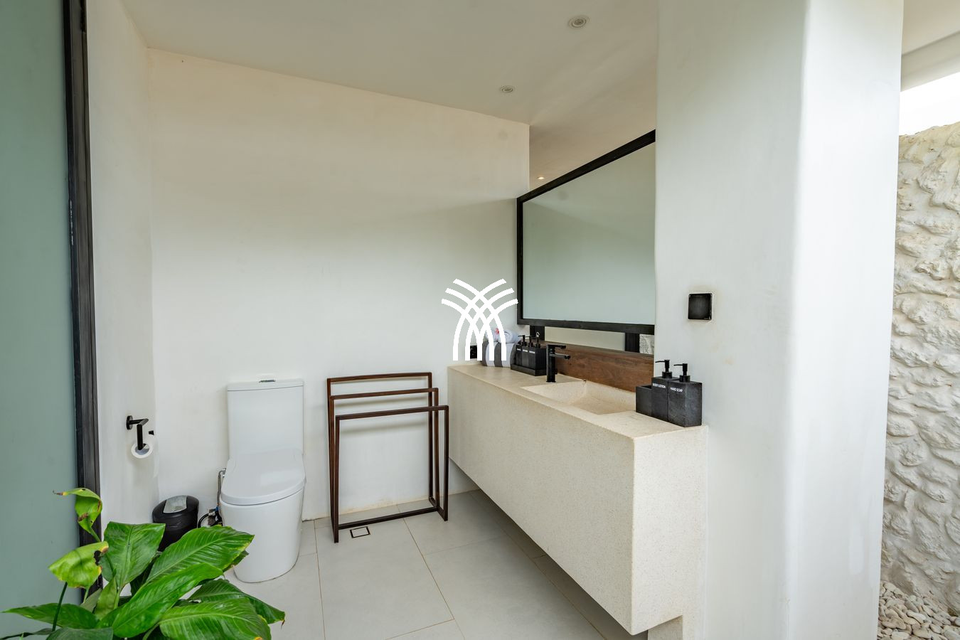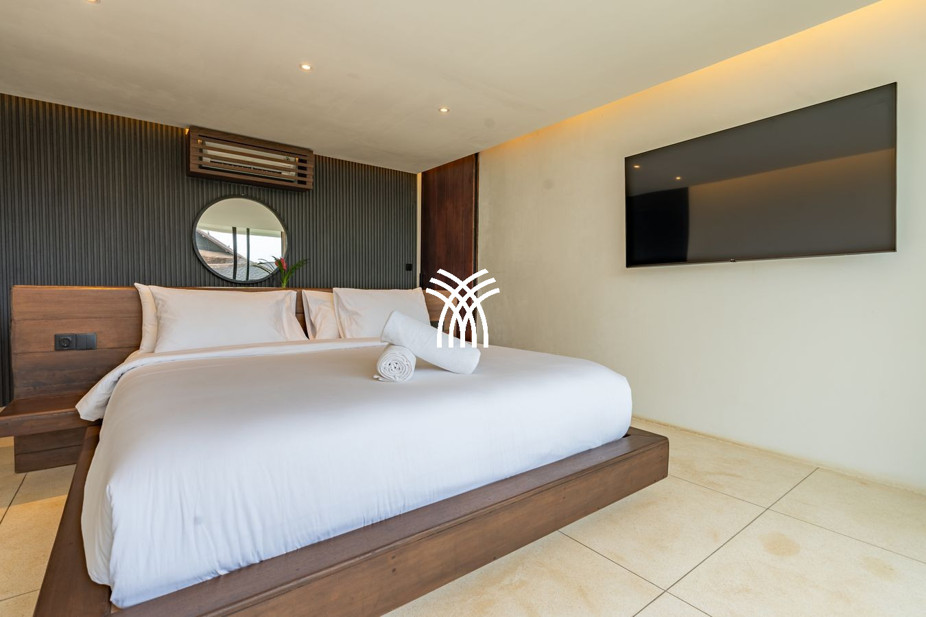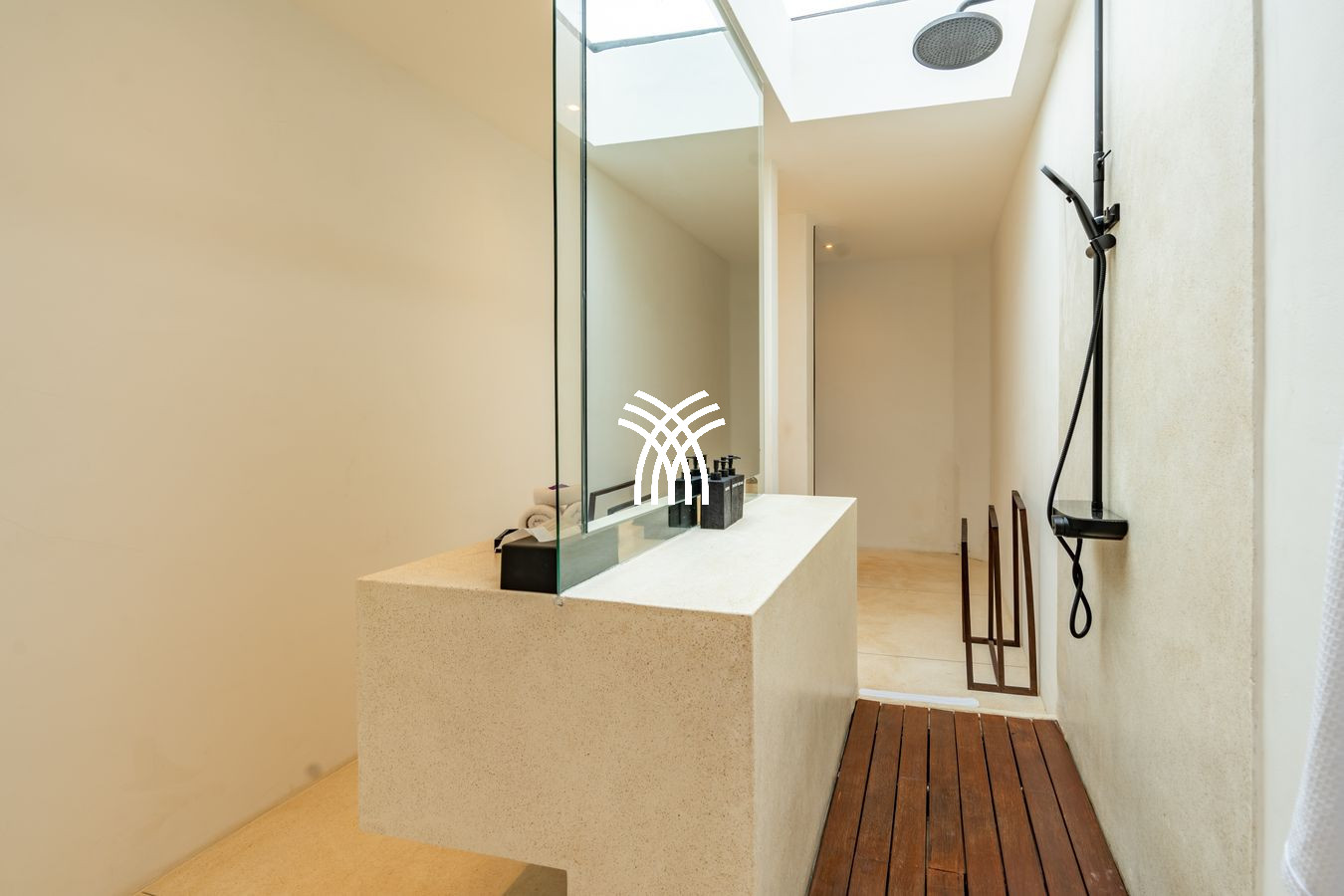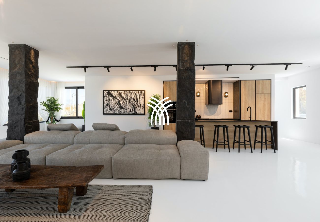 The open-plan living area offers plush seating and spectacular sea views, while the sleek kitchen features glossy white finishes, natural wood accents, and a cozy breakfast nook. The serene guest accommodations span the main house and a separate guest suite, all with dreamy linens, airy interiors, and refined finishes.