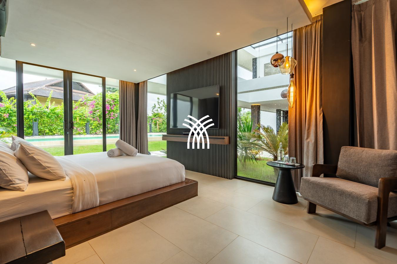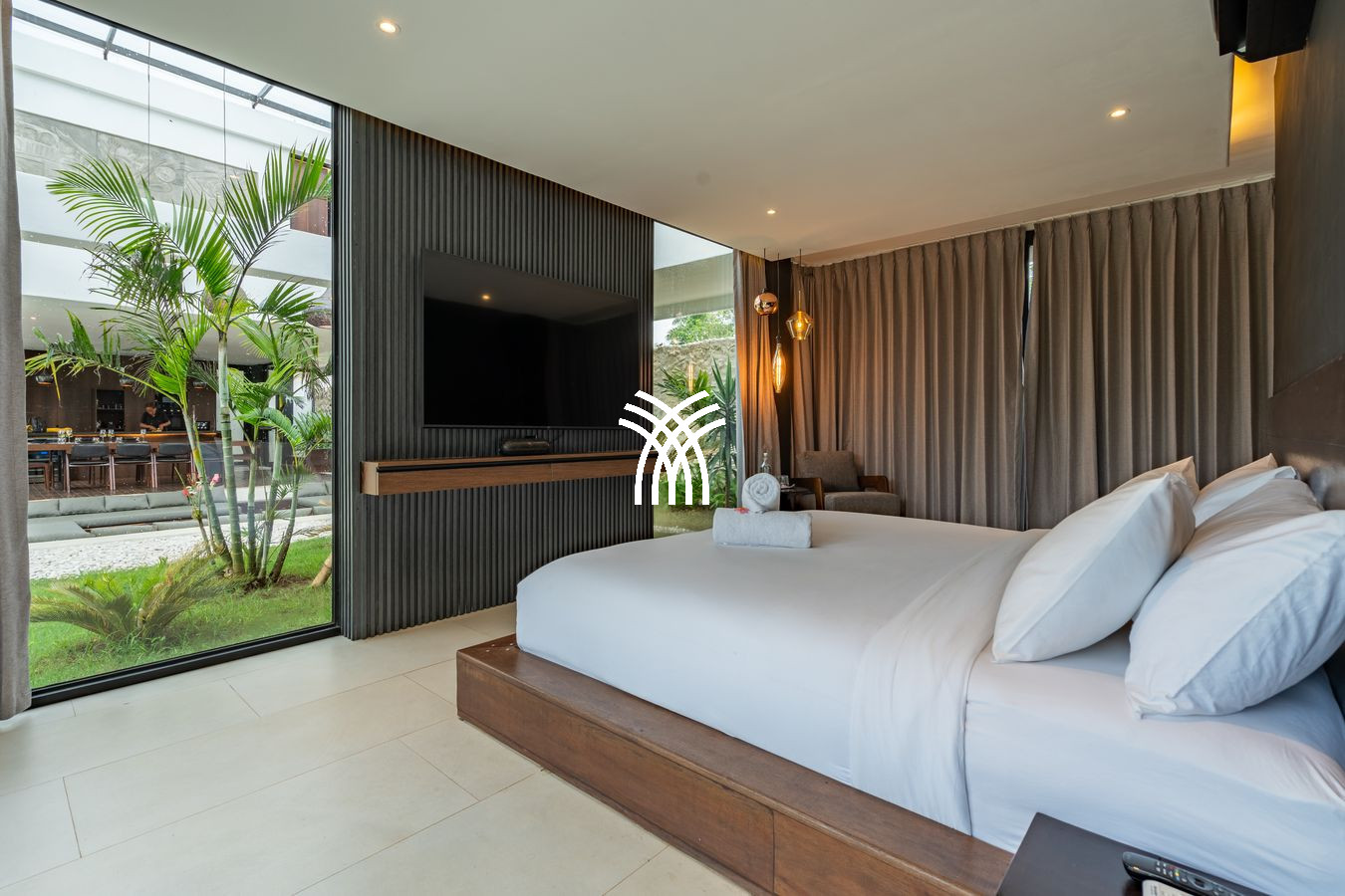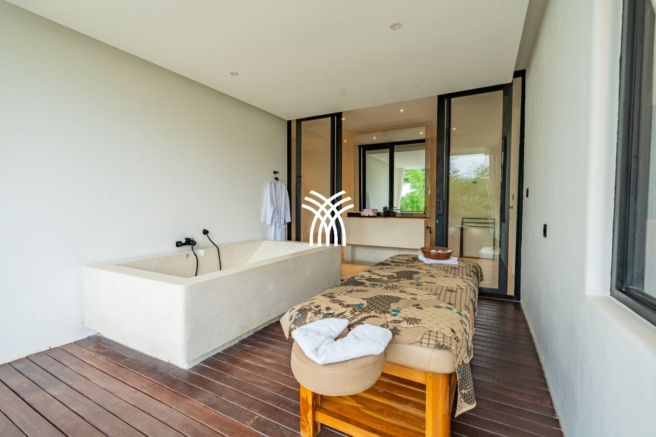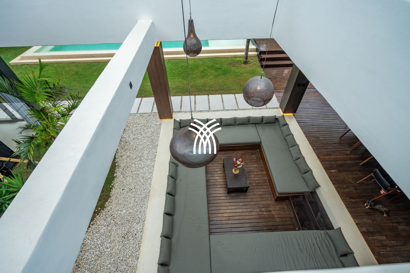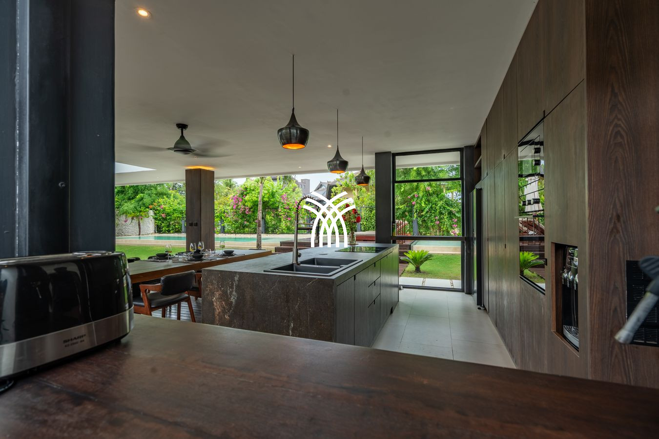 The open-plan living area offers plush seating and spectacular sea views, while the sleek kitchen features glossy white finishes, natural wood accents, and a cozy breakfast nook. The serene guest accommodations span the main house and a separate guest suite, all with dreamy linens, airy interiors, and refined finishes.