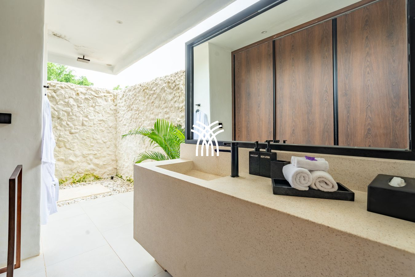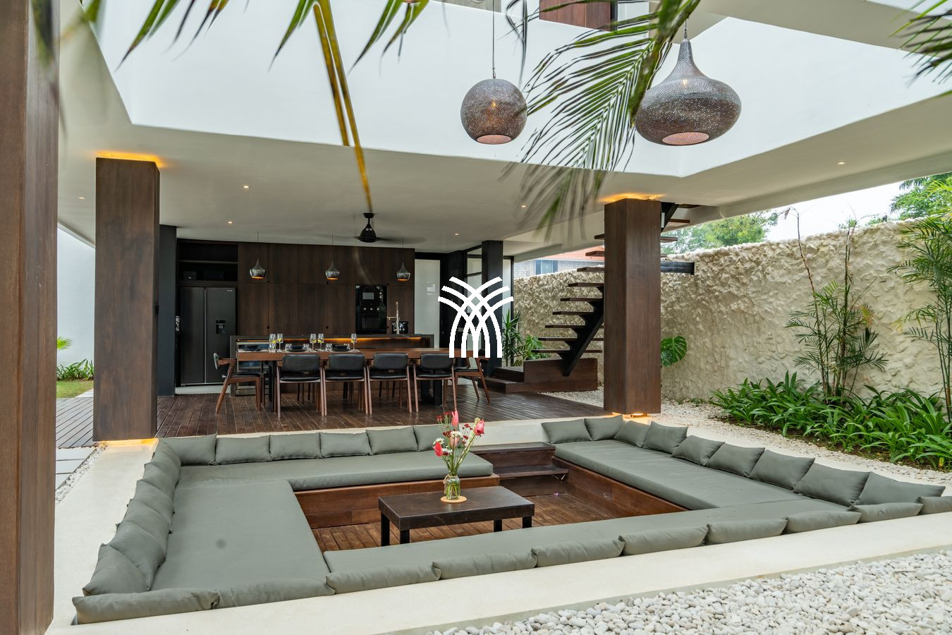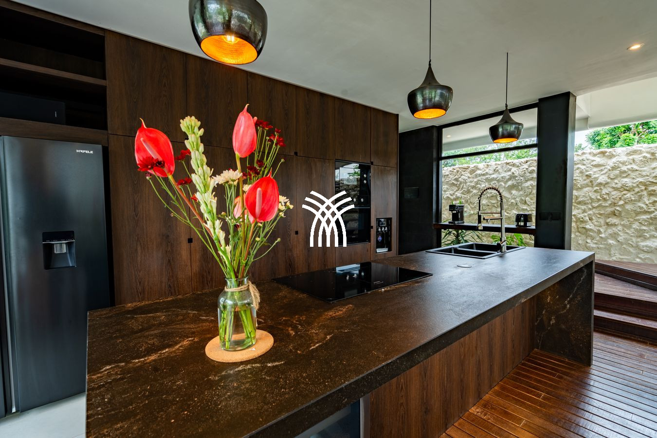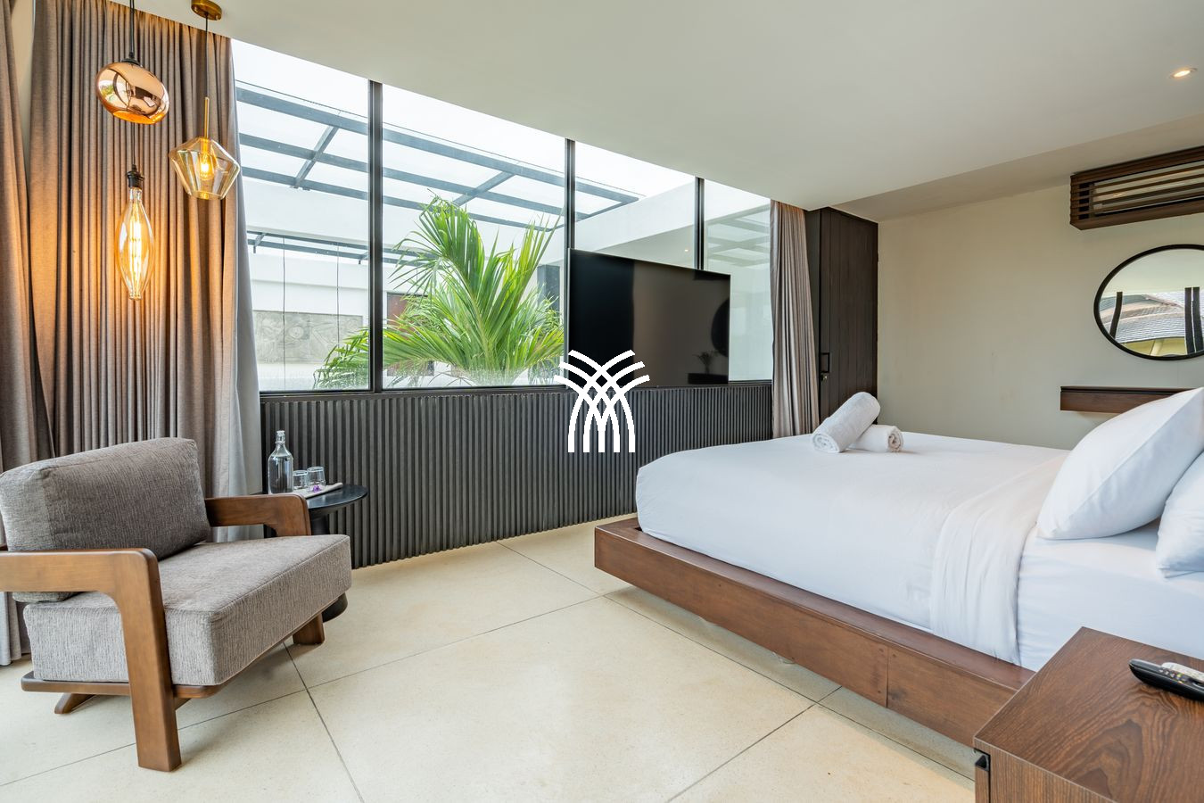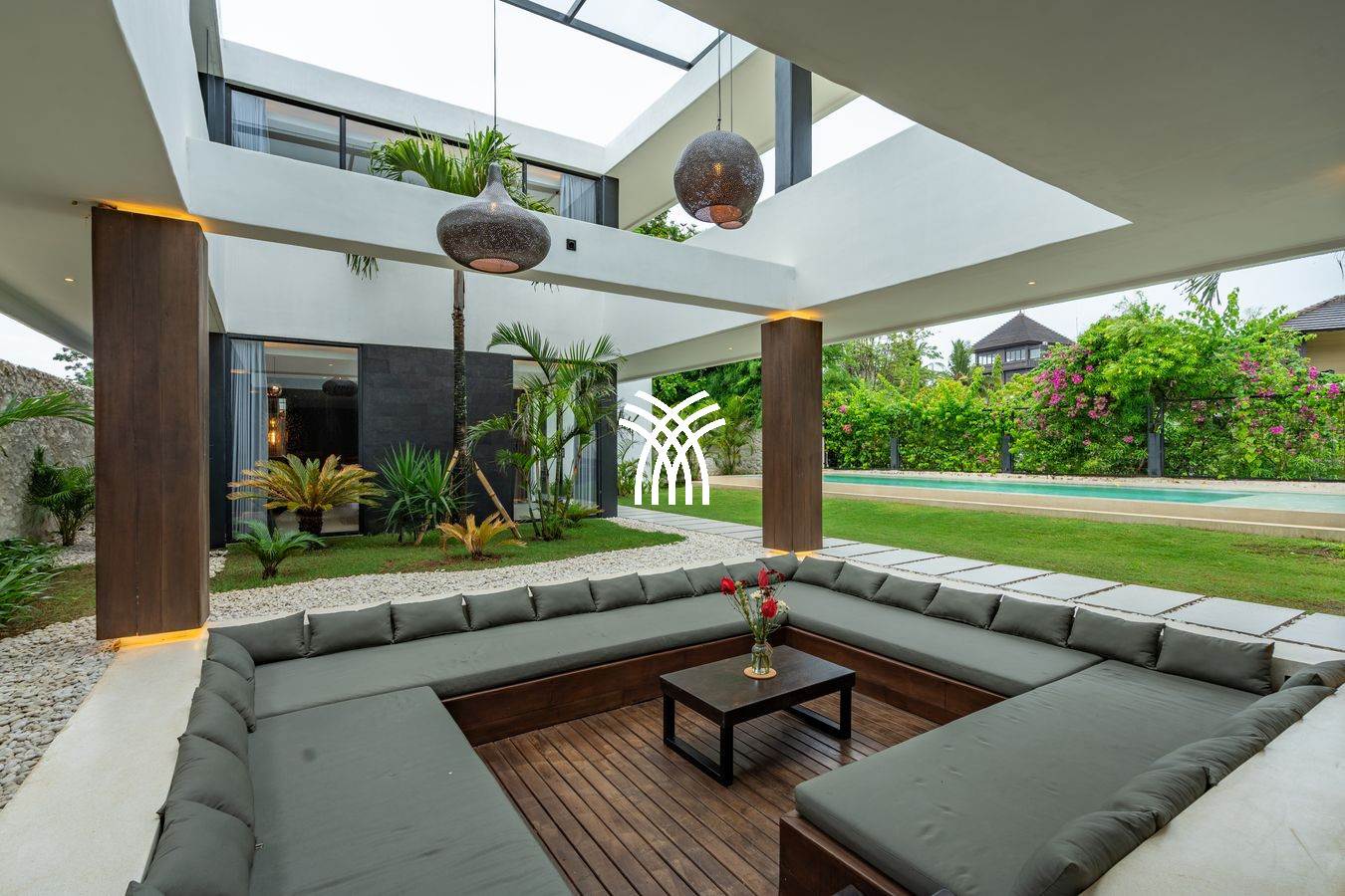 The open-plan living area offers plush seating and spectacular sea views, while the sleek kitchen features glossy white finishes, natural wood accents, and a cozy breakfast nook. The serene guest accommodations span the main house and a separate guest suite, all with dreamy linens, airy interiors, and refined finishes.