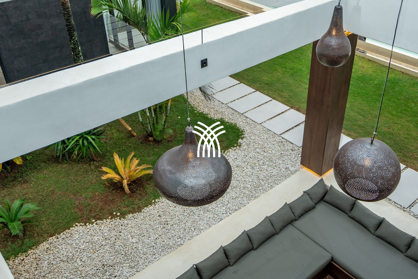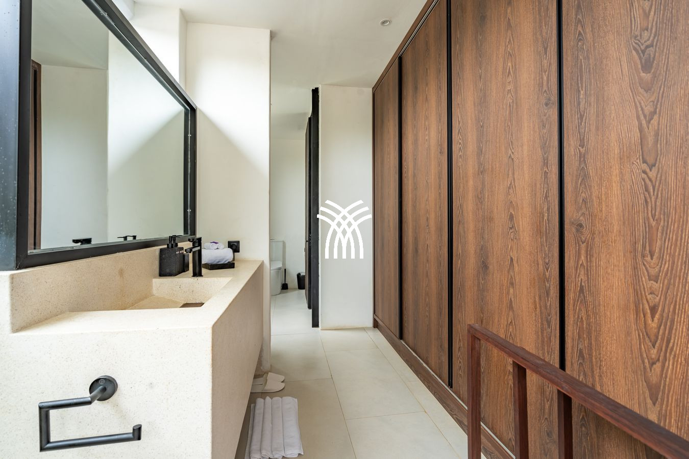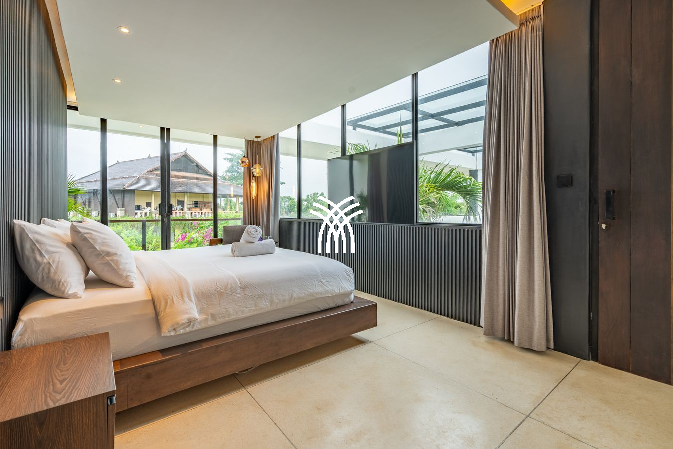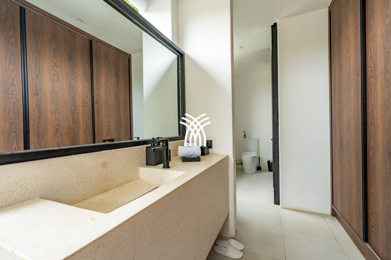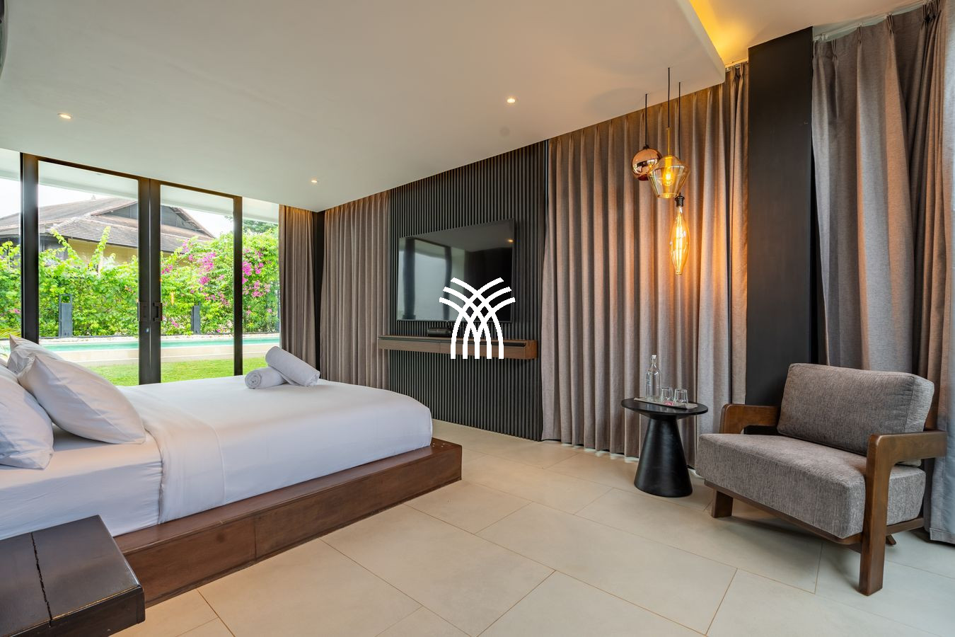 The open-plan living area offers plush seating and spectacular sea views, while the sleek kitchen features glossy white finishes, natural wood accents, and a cozy breakfast nook. The serene guest accommodations span the main house and a separate guest suite, all with dreamy linens, airy interiors, and refined finishes.