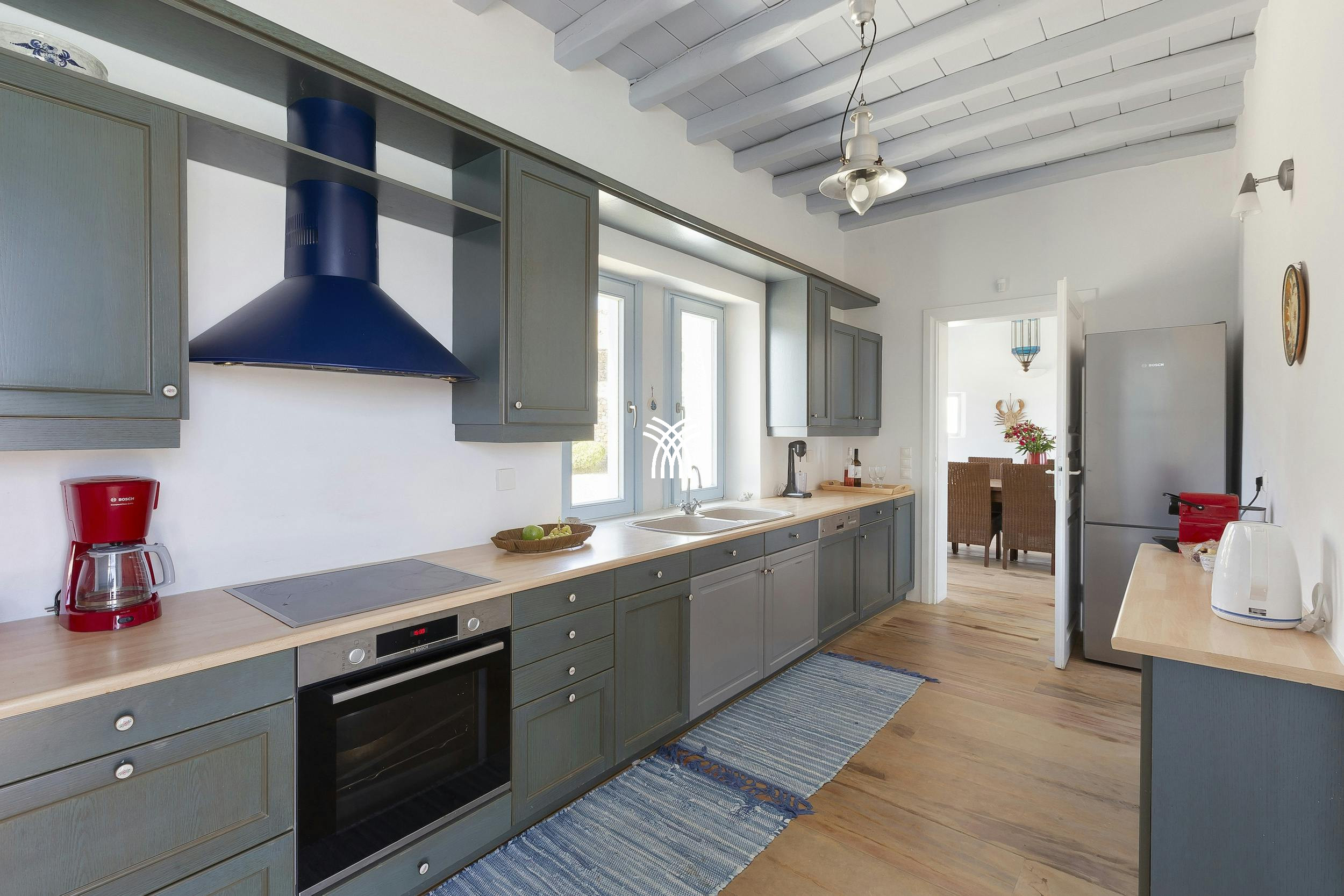 Inside, the villa boasts a spacious living room with plush seating and spectacular views of the pool and Aegean Sea. The fully equipped kitchen caters to all your culinary desires, complemented by a separate laundry and storage area for convenience.