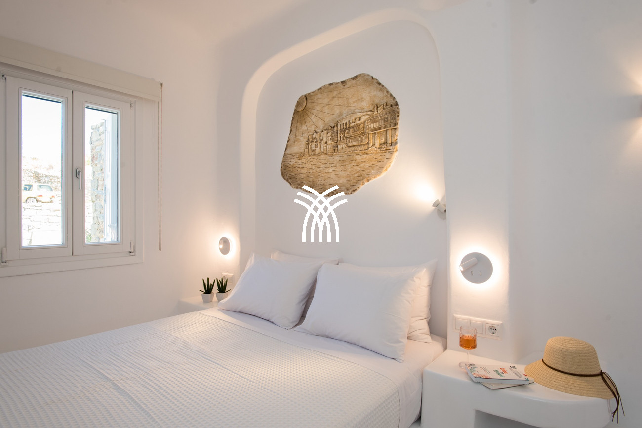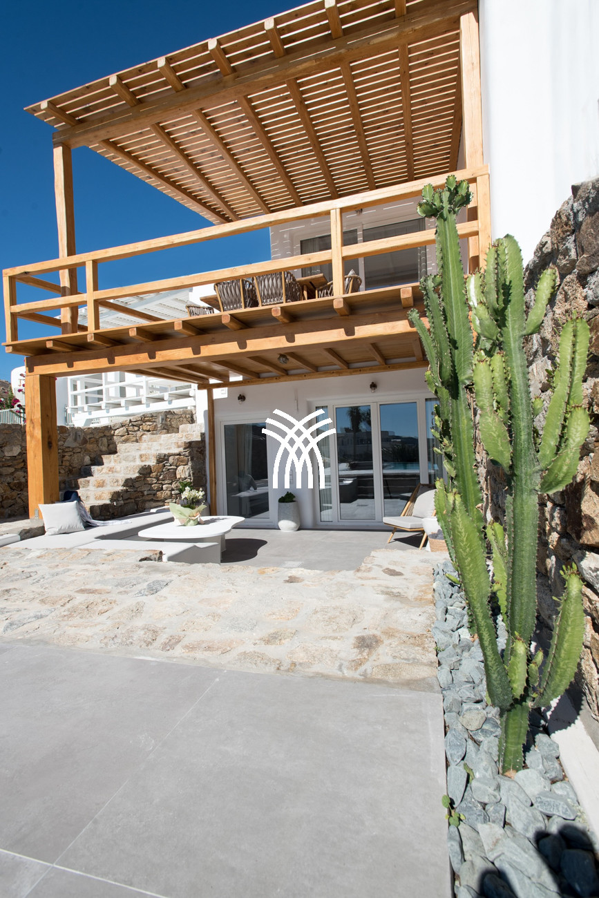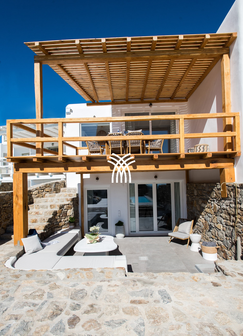 Step outside to immerse yourself in a true Mykonos experience. A heated infinity-edge pool invites you to relax while gazing at the island’s iconic windmills. A seven-seater heated jacuzzi offers the perfect spot for sunset views, while the expansive sun terraces and shaded lounges create inviting spaces for quiet reflection or lively gatherings. An outdoor dining area and fully equipped bar enhance the experience, making every meal a celebration under the open sky.