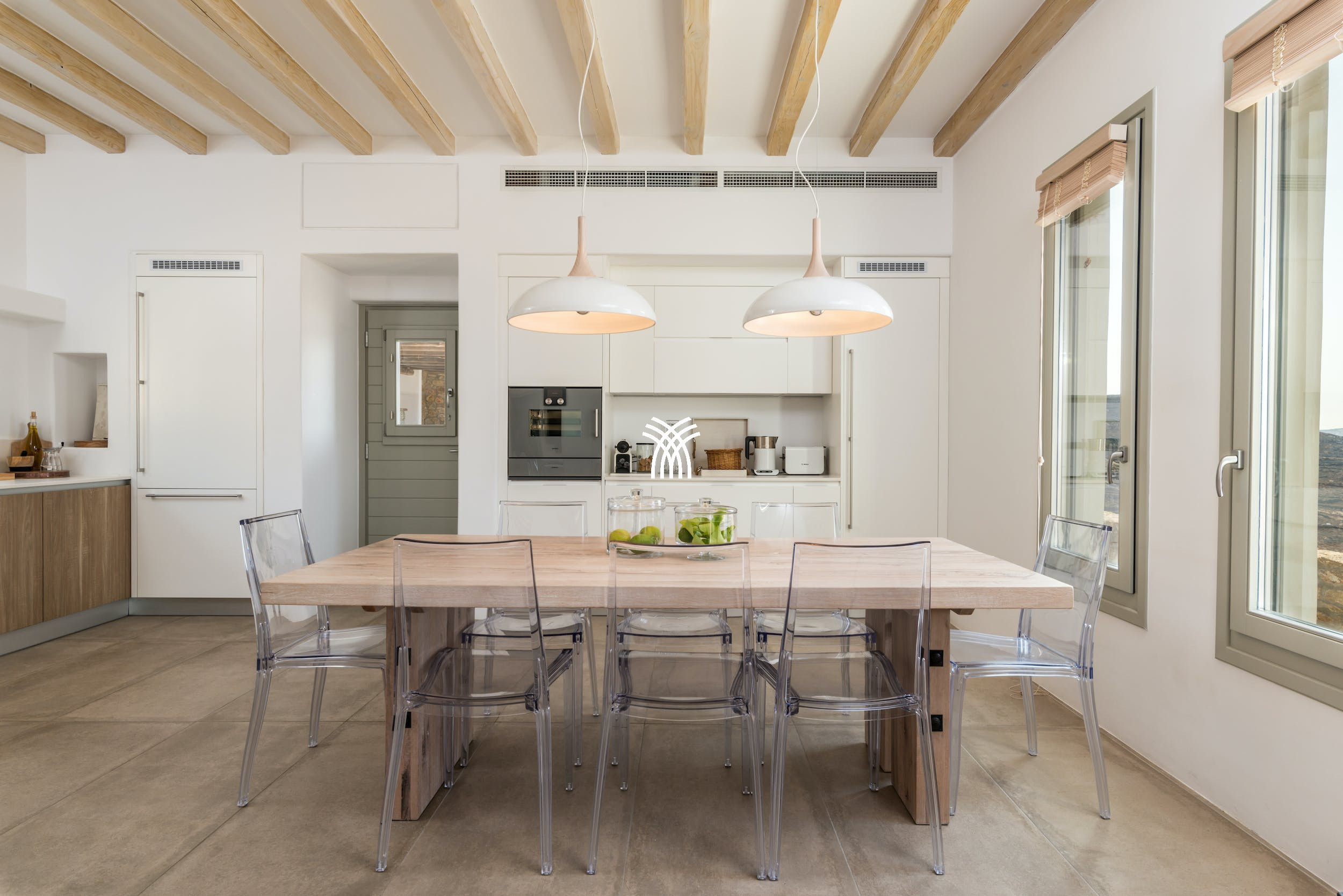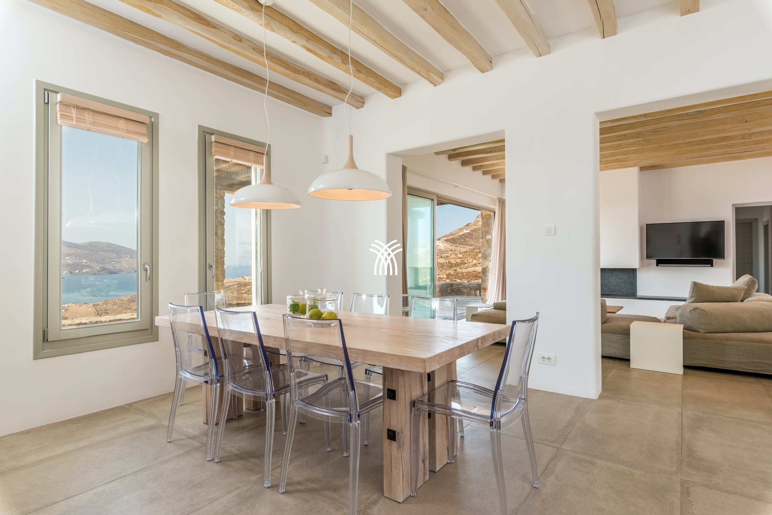 Elegant outdoor spaces include a generous lounge area perfect for sunset cocktails and a shaded veranda with a grand dining table for twelve, ideal for al fresco meals under the stars. Inside, the villa showcases iconic Mykonos style with soaring ceilings, pale wood beams, and crisp whitewashed walls enhanced by polished cement floors and contemporary luxury amenities.