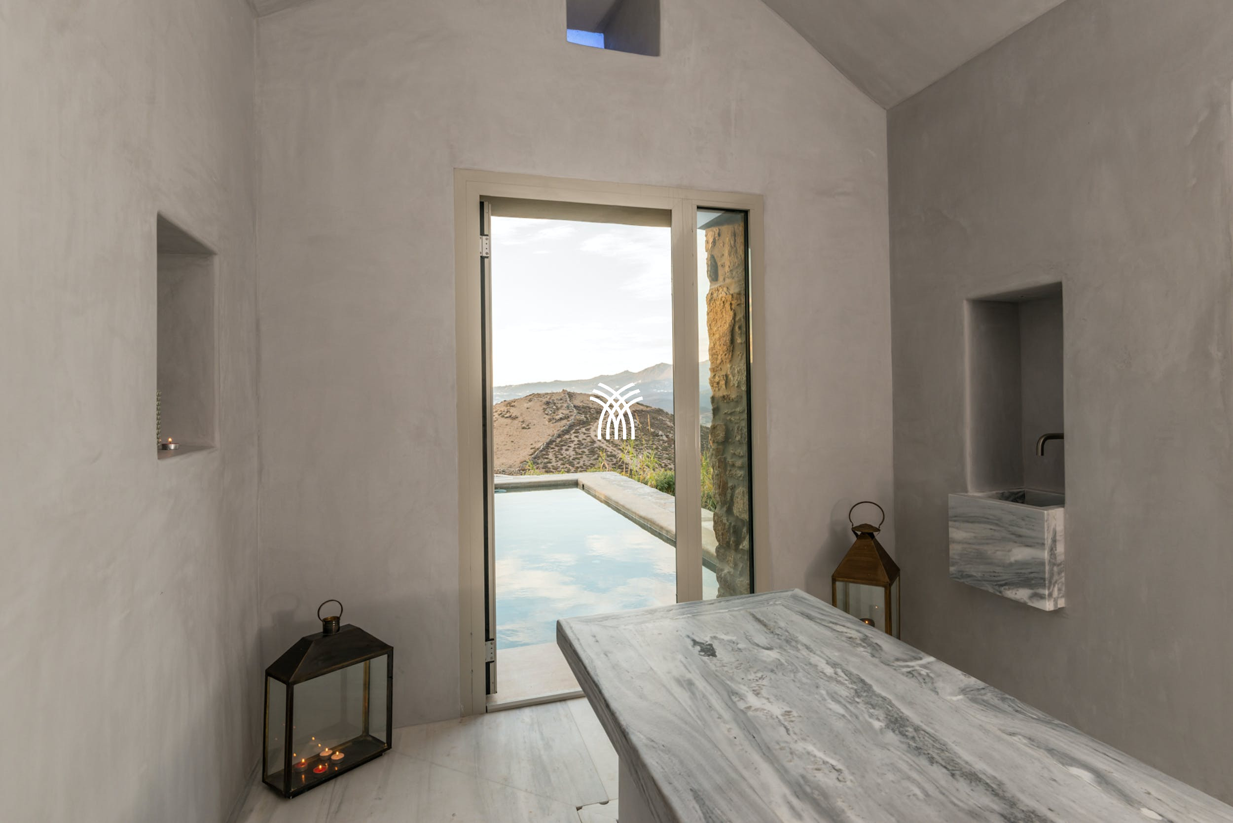 Complete with an infinity pool, hot tub, plunge pool, and a state-of-the-art gym boasting floor-to-ceiling windows, Villa Delano offers everything for a rejuvenating escape. Whether you're relaxing poolside or working out with a view, this is Luxury Villa Rental in Greece at its finest.
