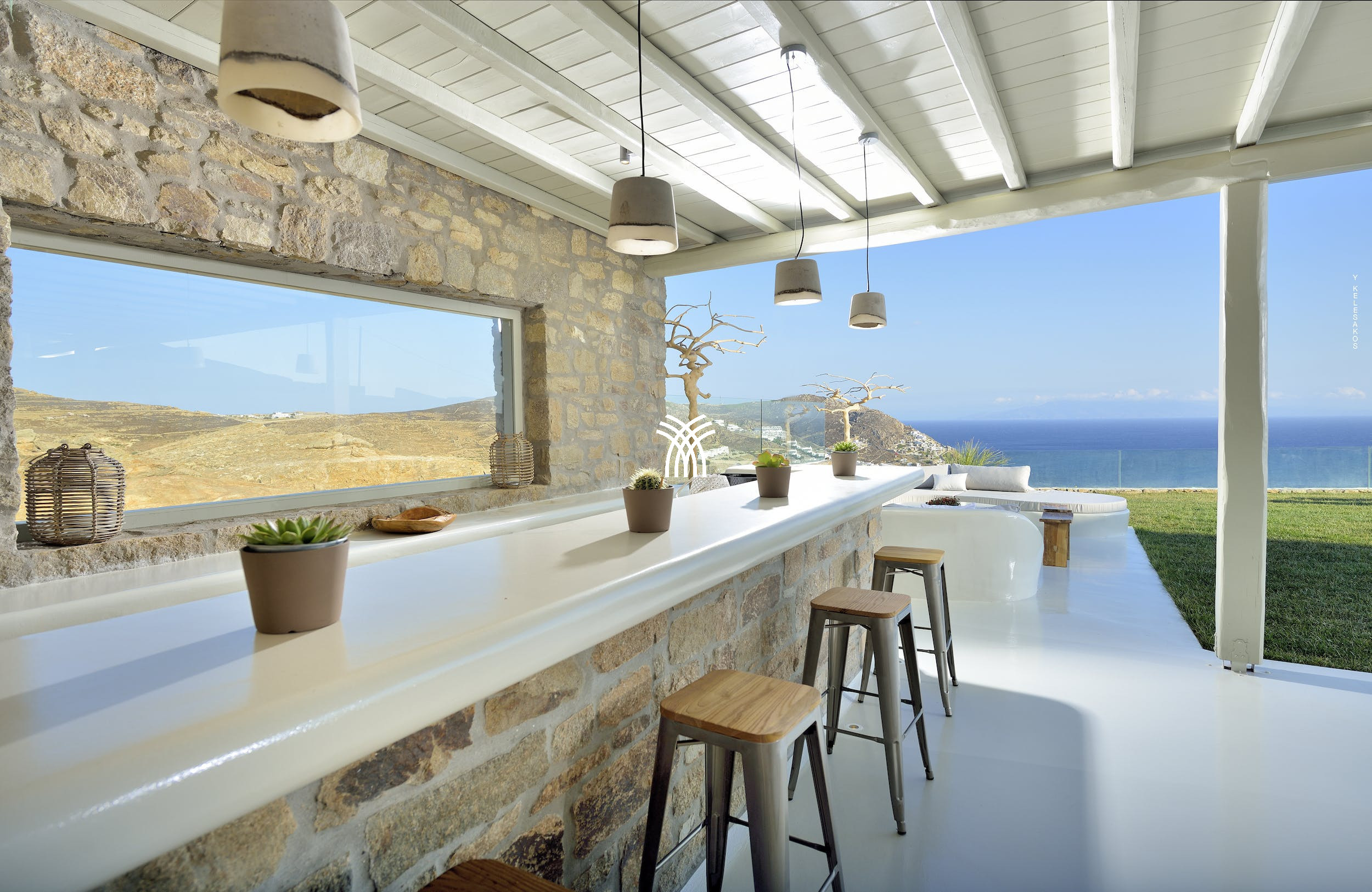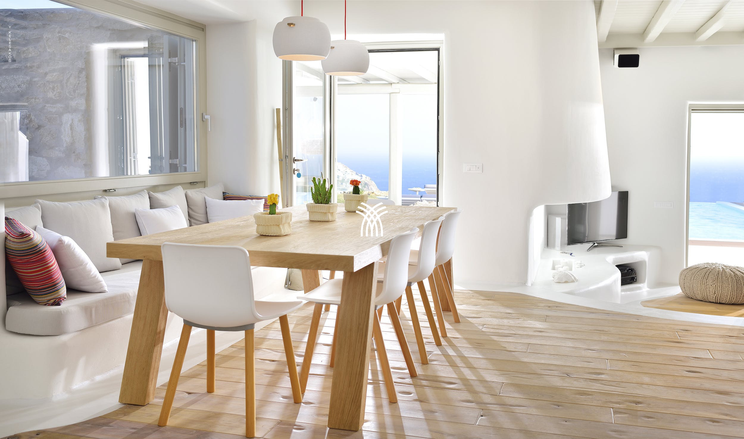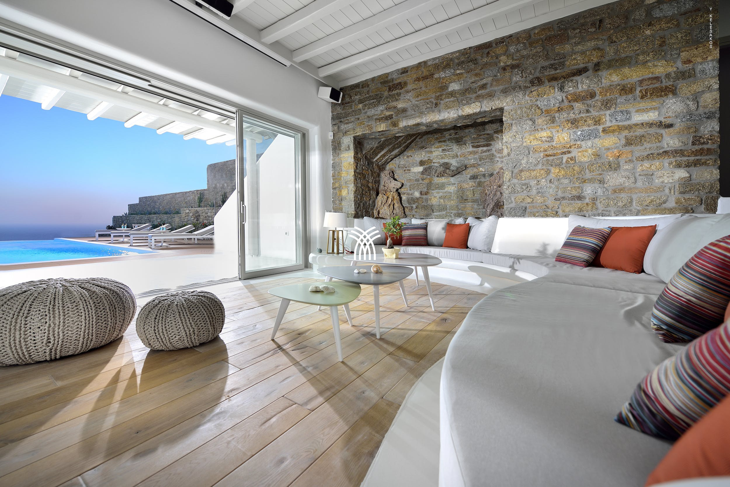 The interior exudes calm sophistication with natural textures and island charm. Exposed stone walls, soft white tones, and driftwood-colored floors create a peaceful, airy atmosphere. The living space features a stylish fireplace and flows seamlessly into the indoor dining area and fully equipped kitchen, all designed to maximize the spectacular sea views.