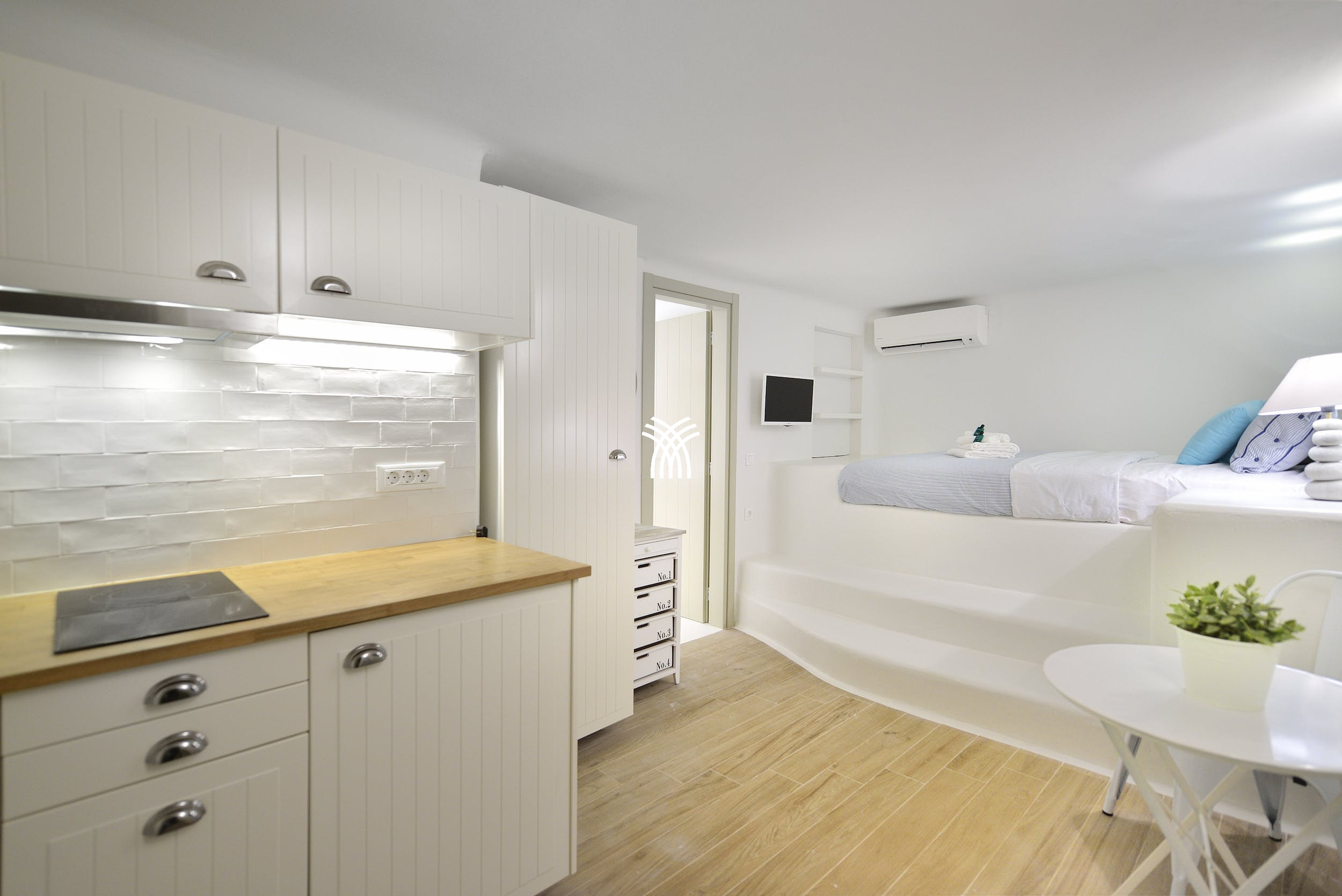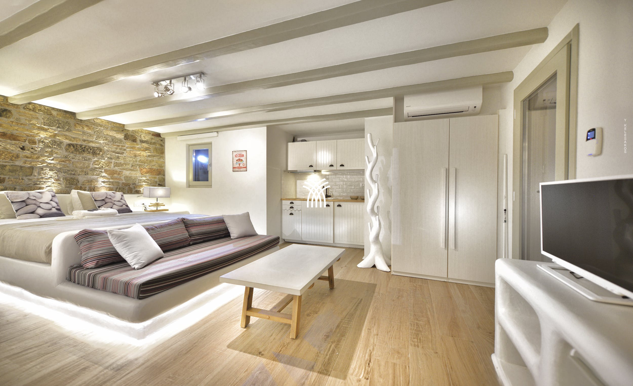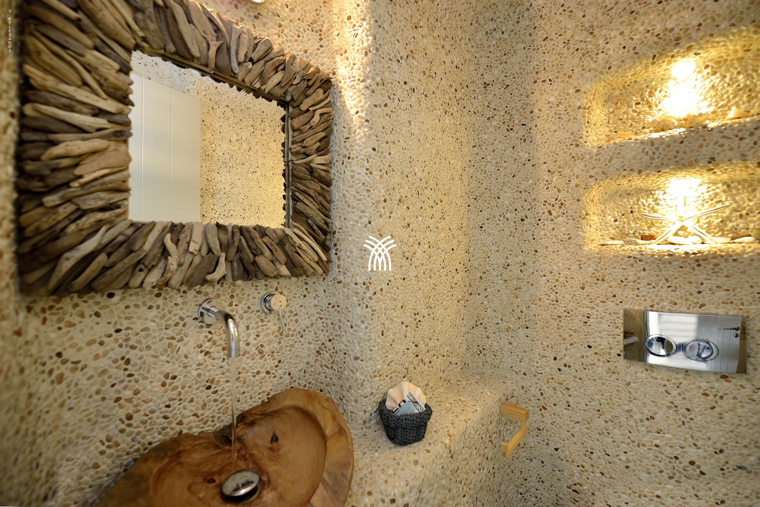 The interior exudes calm sophistication with natural textures and island charm. Exposed stone walls, soft white tones, and driftwood-colored floors create a peaceful, airy atmosphere. The living space features a stylish fireplace and flows seamlessly into the indoor dining area and fully equipped kitchen, all designed to maximize the spectacular sea views.