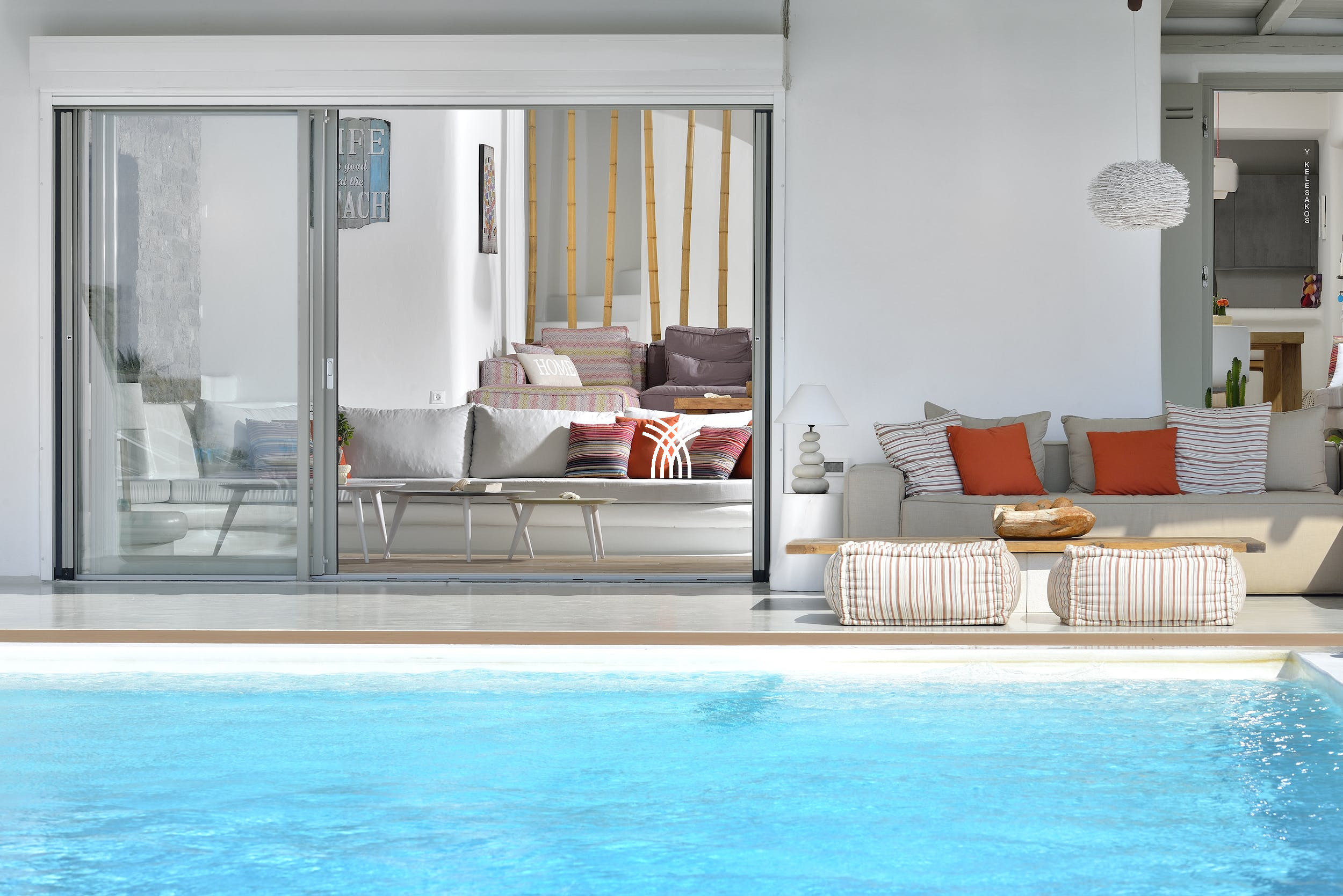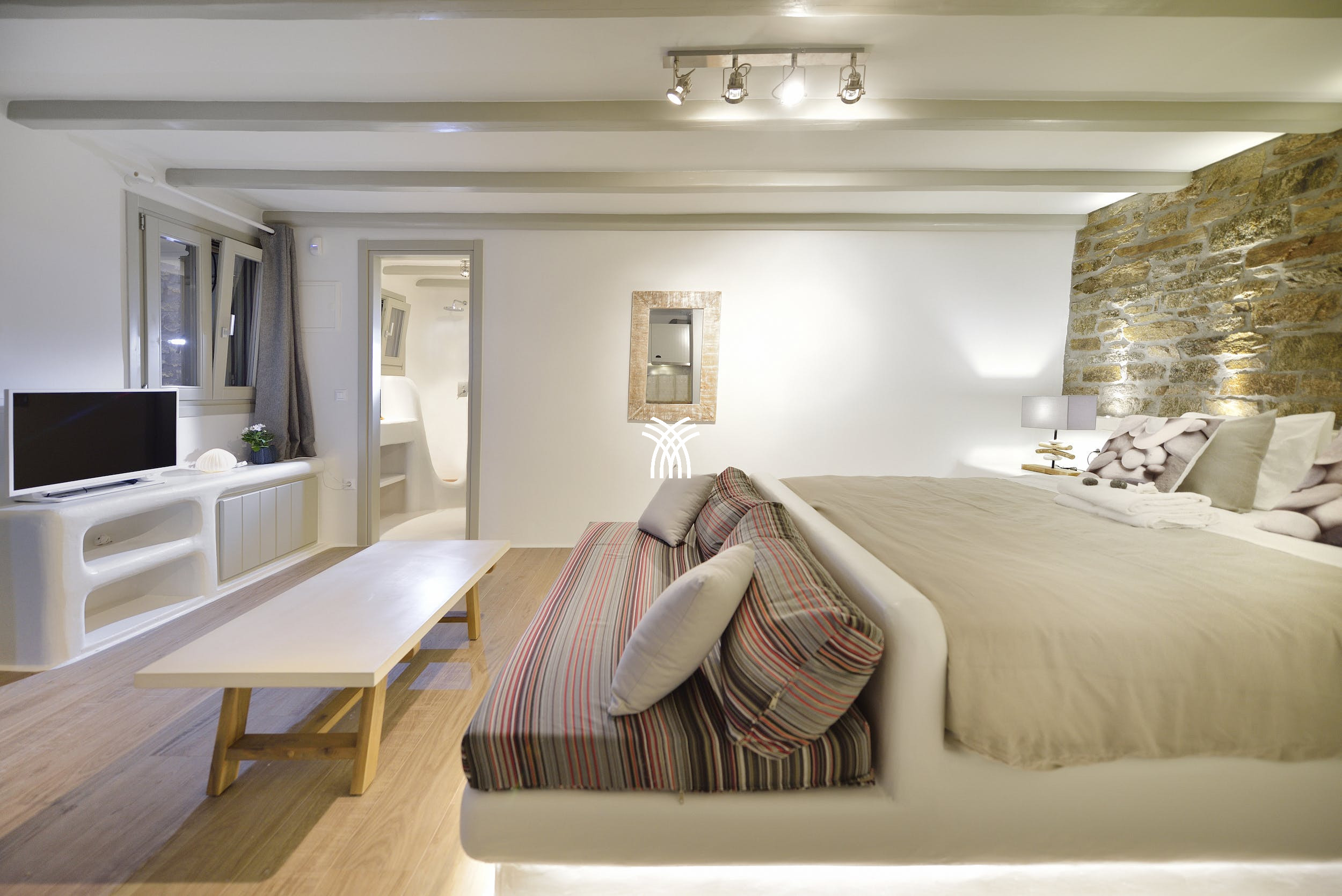 Outside, the villa boasts a private swimming pool, a barbecue area, and thoughtfully landscaped surroundings ideal for entertaining, relaxing, or enjoying the unforgettable Mykonian sunset. Whether you seek quiet moments or festive gatherings, this luxury villa rental in Greece promises a dream vacation filled with comfort, elegance, and unforgettable views.