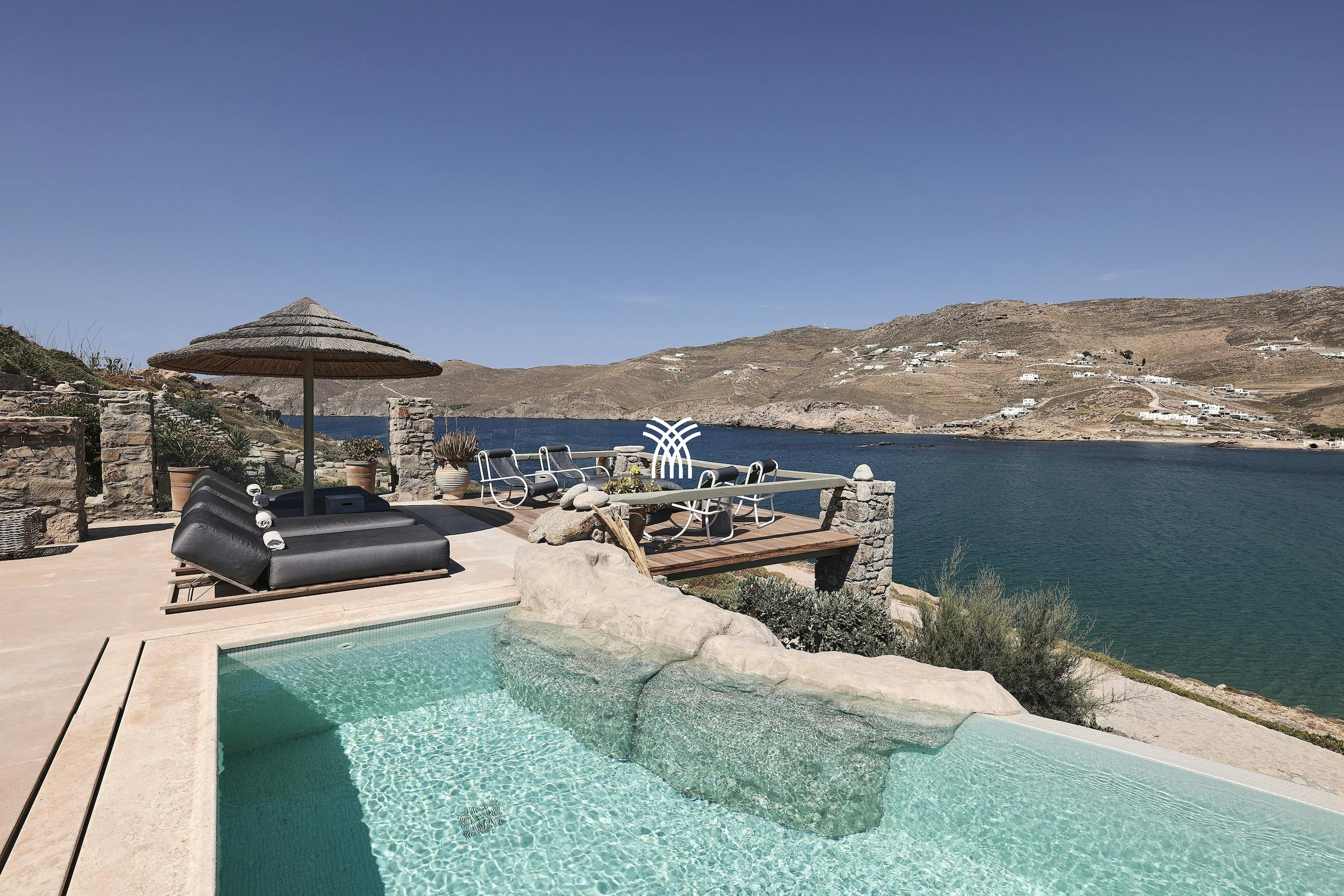 Discover a truly unforgettable island escape with a luxury villa rental in Greece at Villa Pergisos, an exceptional property perched on a 20 meter cliff on the southwest coast of Mykonos. Offering panoramic, unobstructed views of the shimmering Mediterranean Sea, this unique villa combines seclusion, elegance, and rare access to its very own private beach.