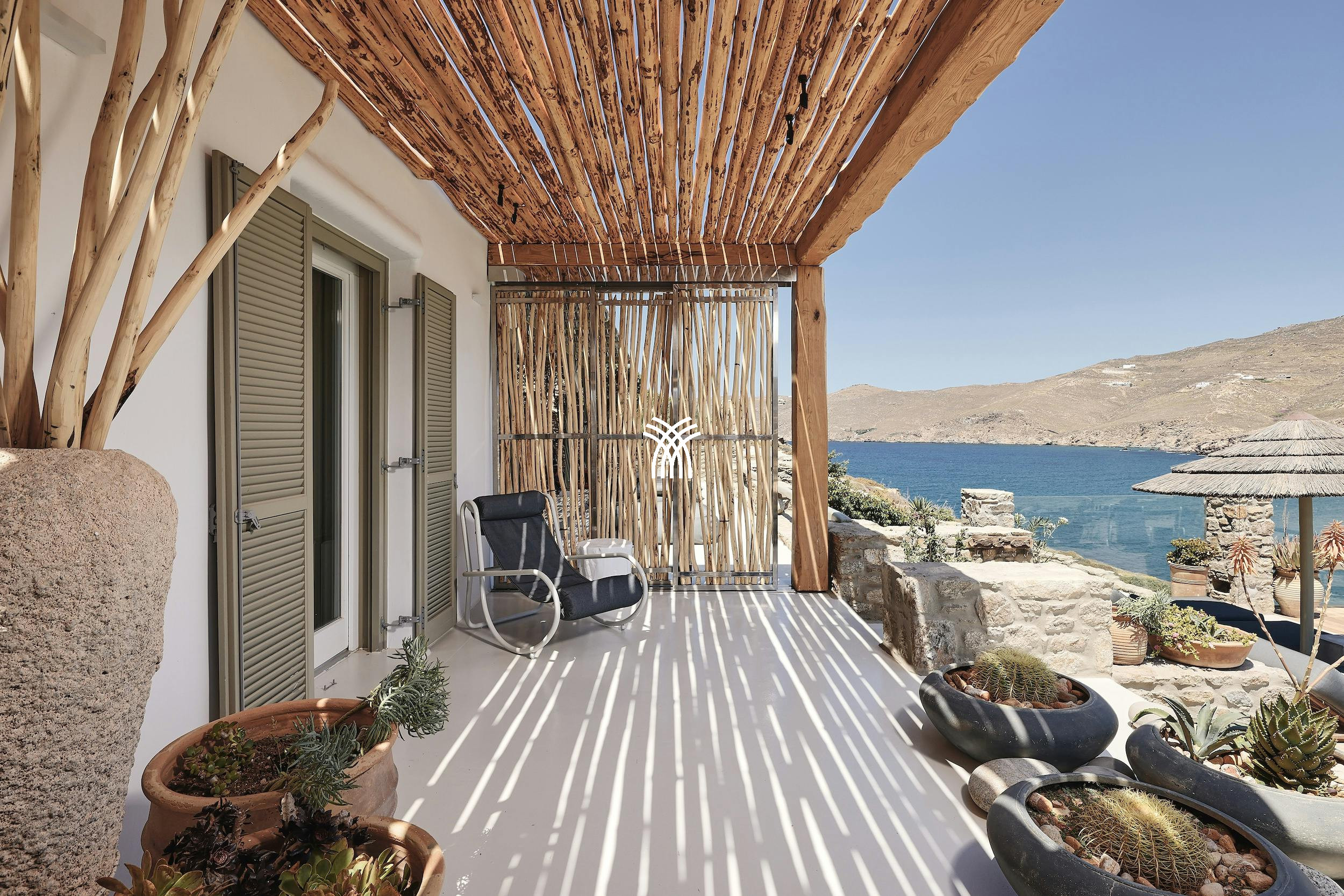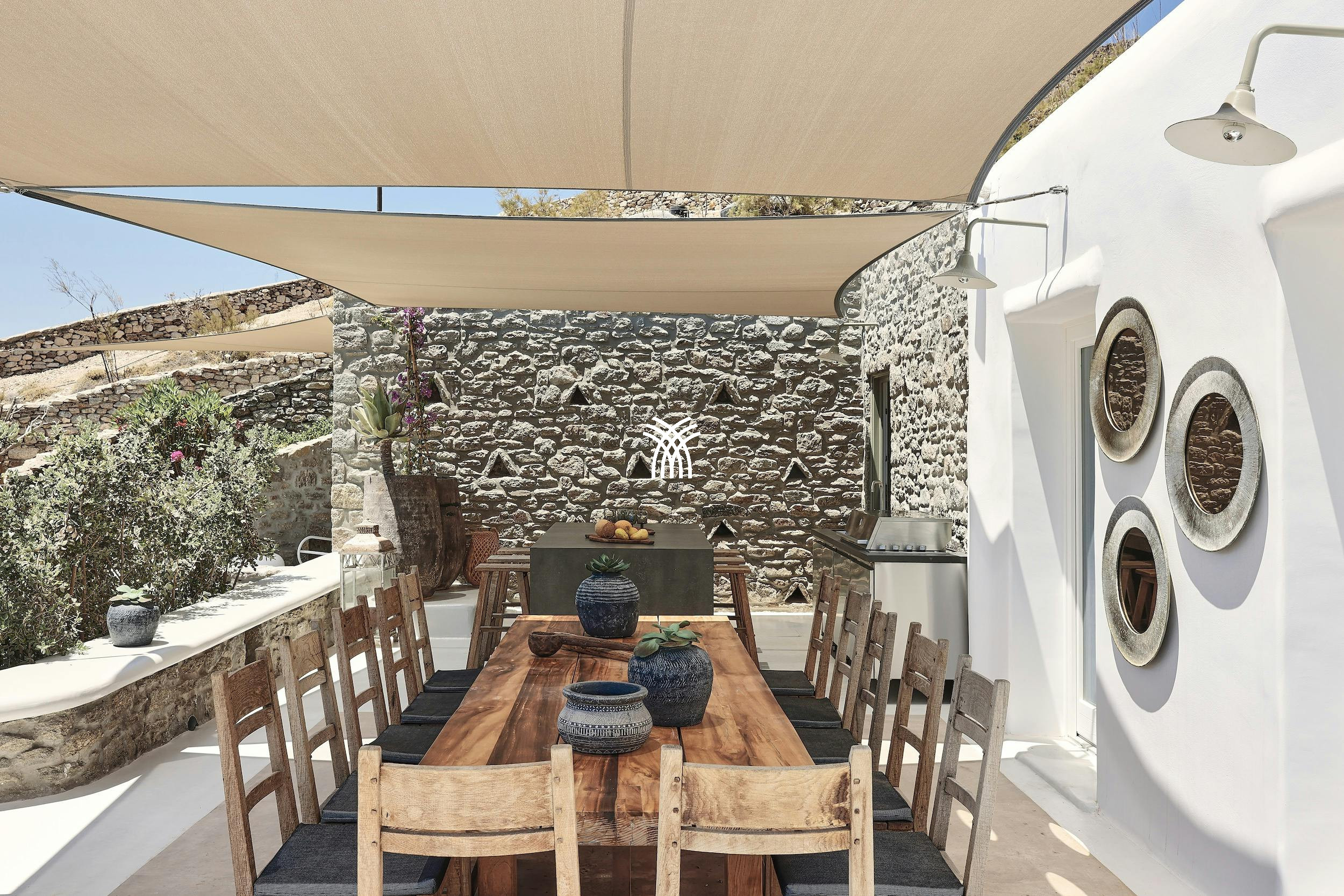 The upper terrace showcases traditional Mykonian architecture with clean white cubes and stylish outdoor living areas. A bamboo-shaded pergola covers an elegant lounge space, complete with a summer kitchen, barbecue, alfresco dining area, and a private gym—all set against the breathtaking backdrop of Ftelia Bay. The outdoor sound system enhances the experience, creating the perfect setting for unforgettable gatherings.