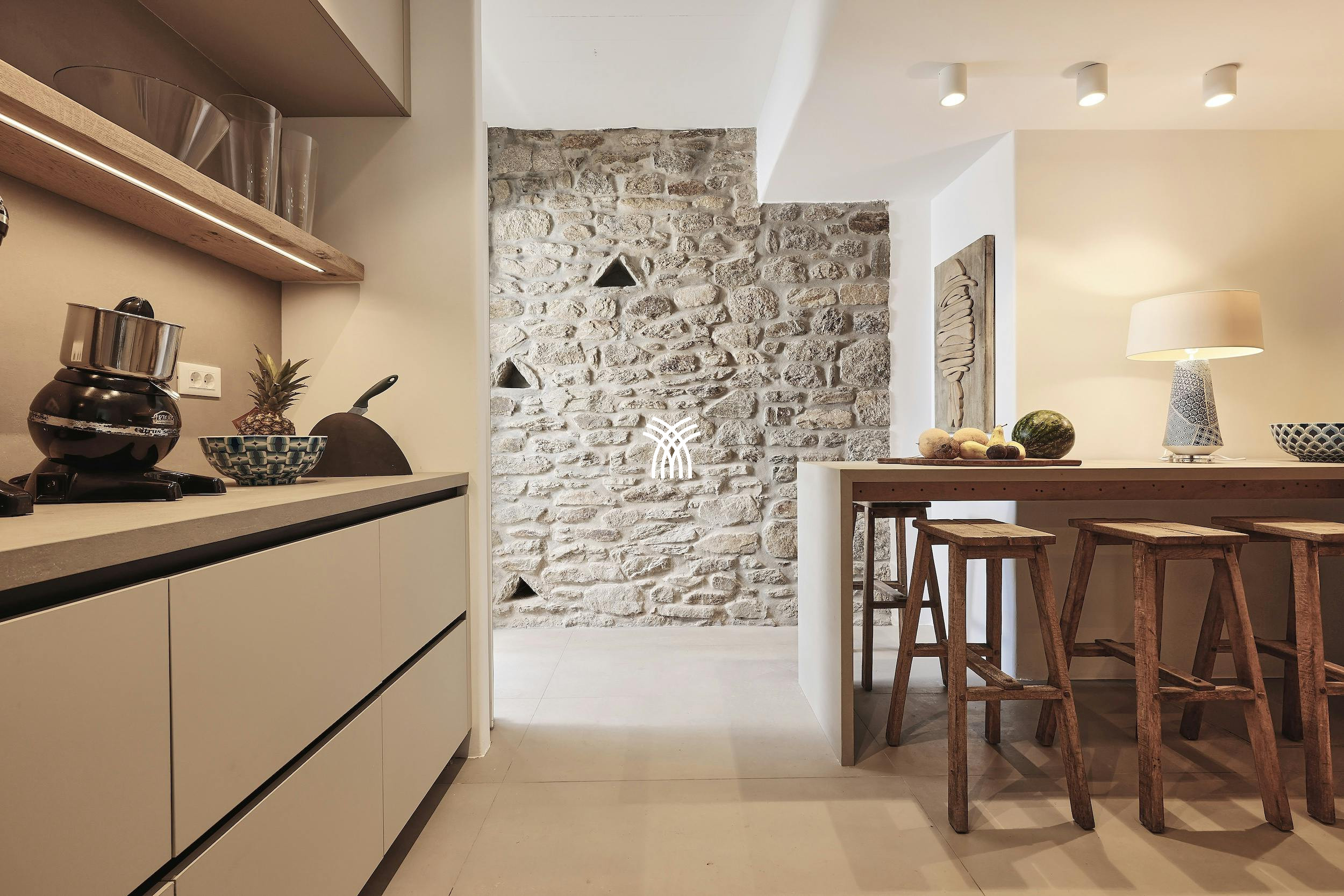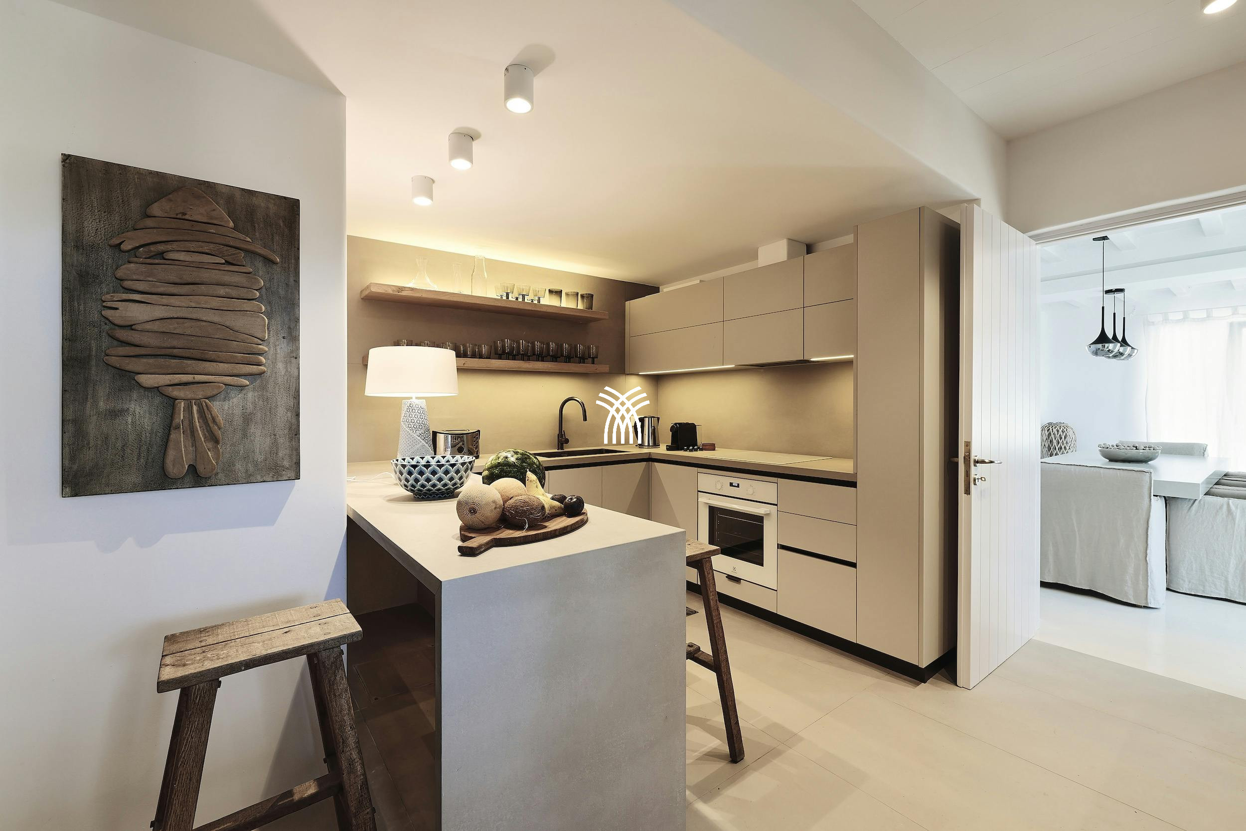 Inside, the villa is a haven of contemporary island style. Whitewashed walls, soft greys, and natural taupe tones create a serene ambiance, while expansive windows frame the dazzling sea views. The open-plan living space features a modern kitchen, indoor dining area, and a relaxed lounge that opens directly onto the terrace.