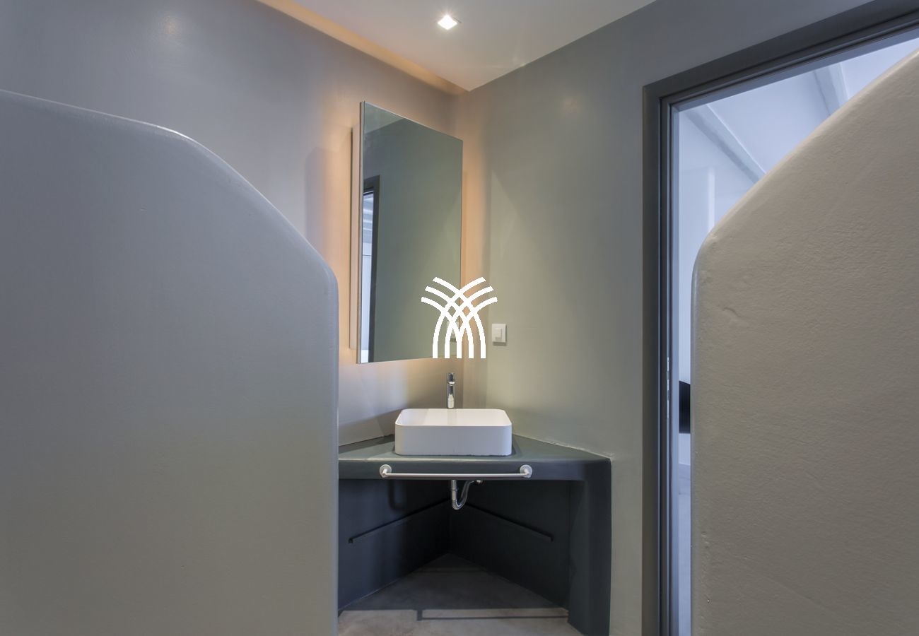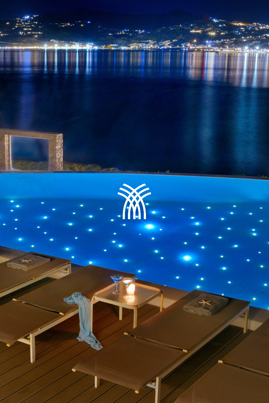 Step outside to immerse yourself in a true Mykonos experience. A heated infinity-edge pool invites you to relax while gazing at the island’s iconic windmills. A seven-seater heated jacuzzi offers the perfect spot for sunset views, while the expansive sun terraces and shaded lounges create inviting spaces for quiet reflection or lively gatherings. An outdoor dining area and fully equipped bar enhance the experience, making every meal a celebration under the open sky.
