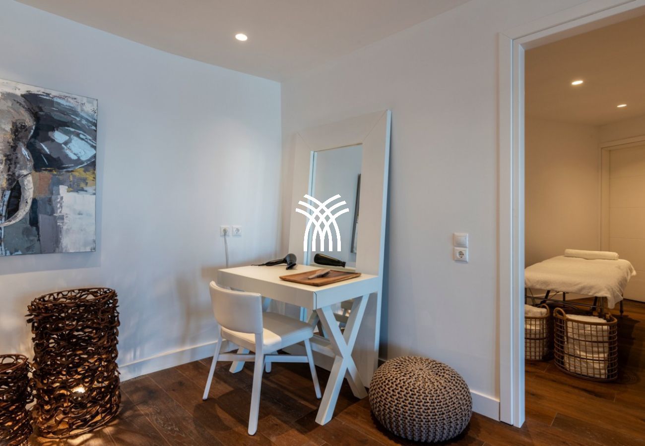The villa features ten master bedrooms spread across three beautifully designed levels. On the first level, two expansive 120 square meter suites each boast their own private outdoor areas. The second level showcases five master bedrooms, a stylish living room, a formal dining area, a fully equipped kitchen designed to serve up to 20 guests, a wine cellar, and a stunning second pool. The third level is home to a luxurious master suite and two separate guest houses, one of which is uniquely built into a natural cliff for an unforgettable architectural touch.