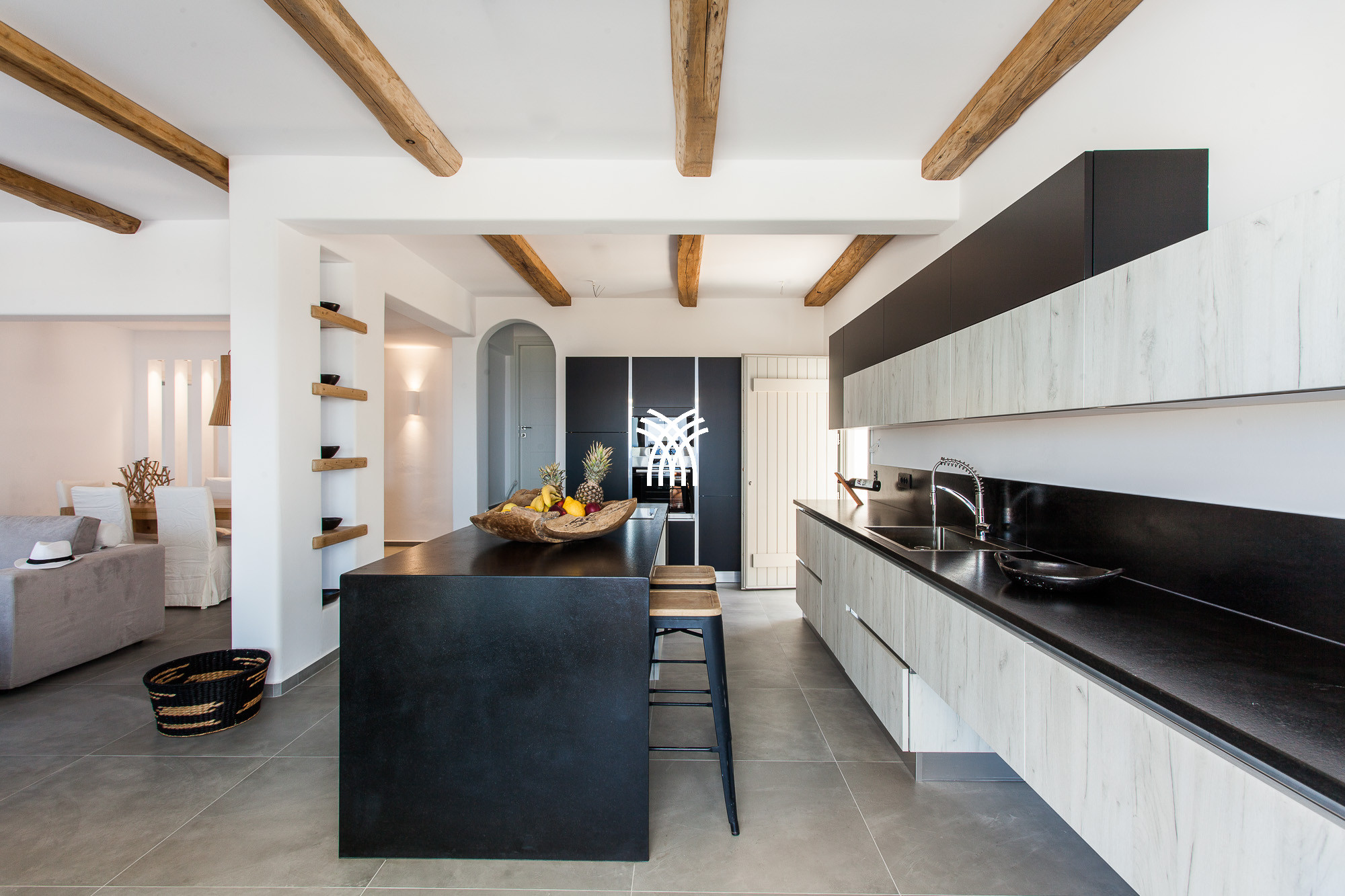 Inside, the villa boasts a spacious living room with plush seating and spectacular views of the pool and Aegean Sea. The fully equipped kitchen caters to all your culinary desires, complemented by a separate laundry and storage area for convenience.