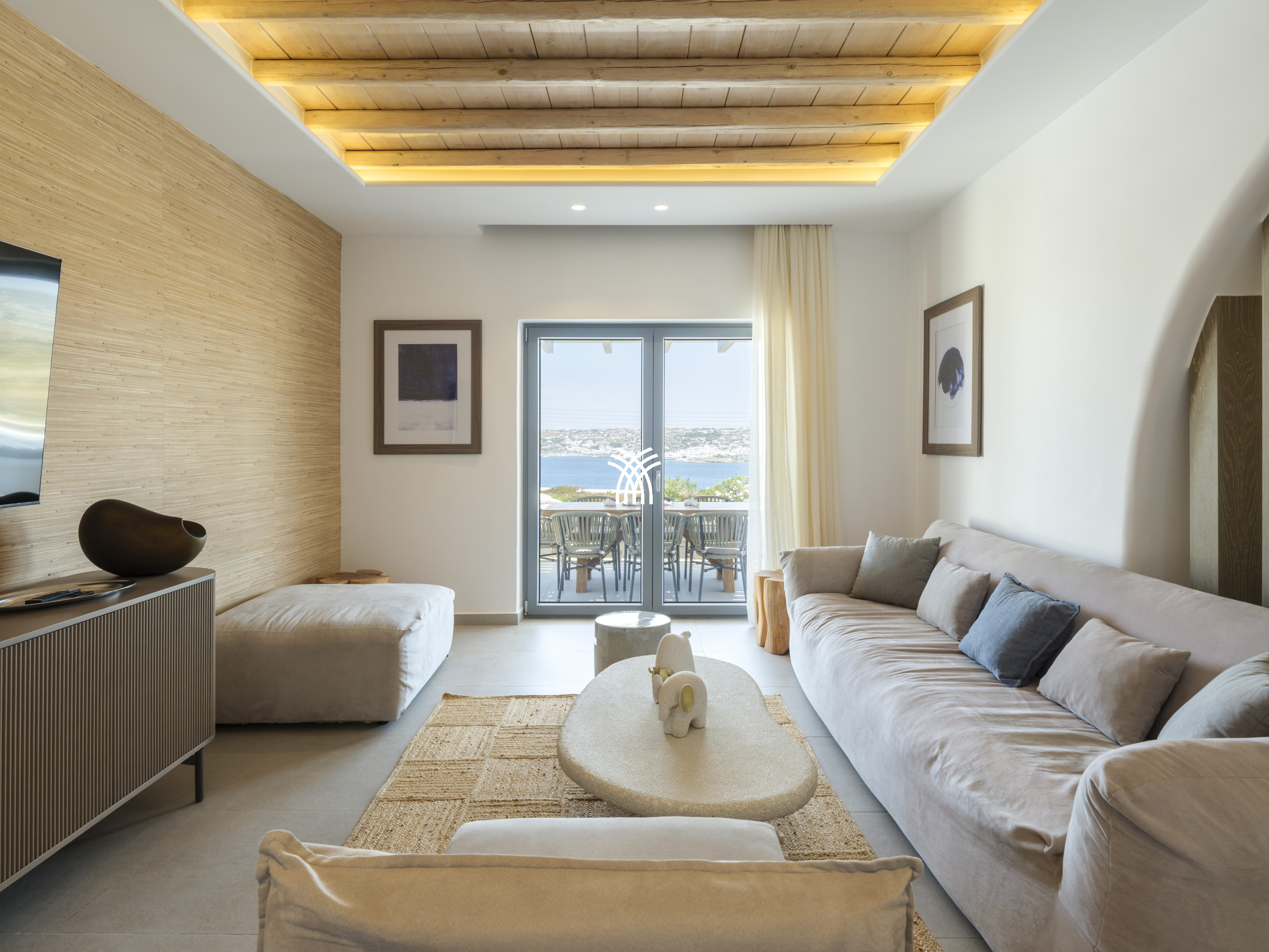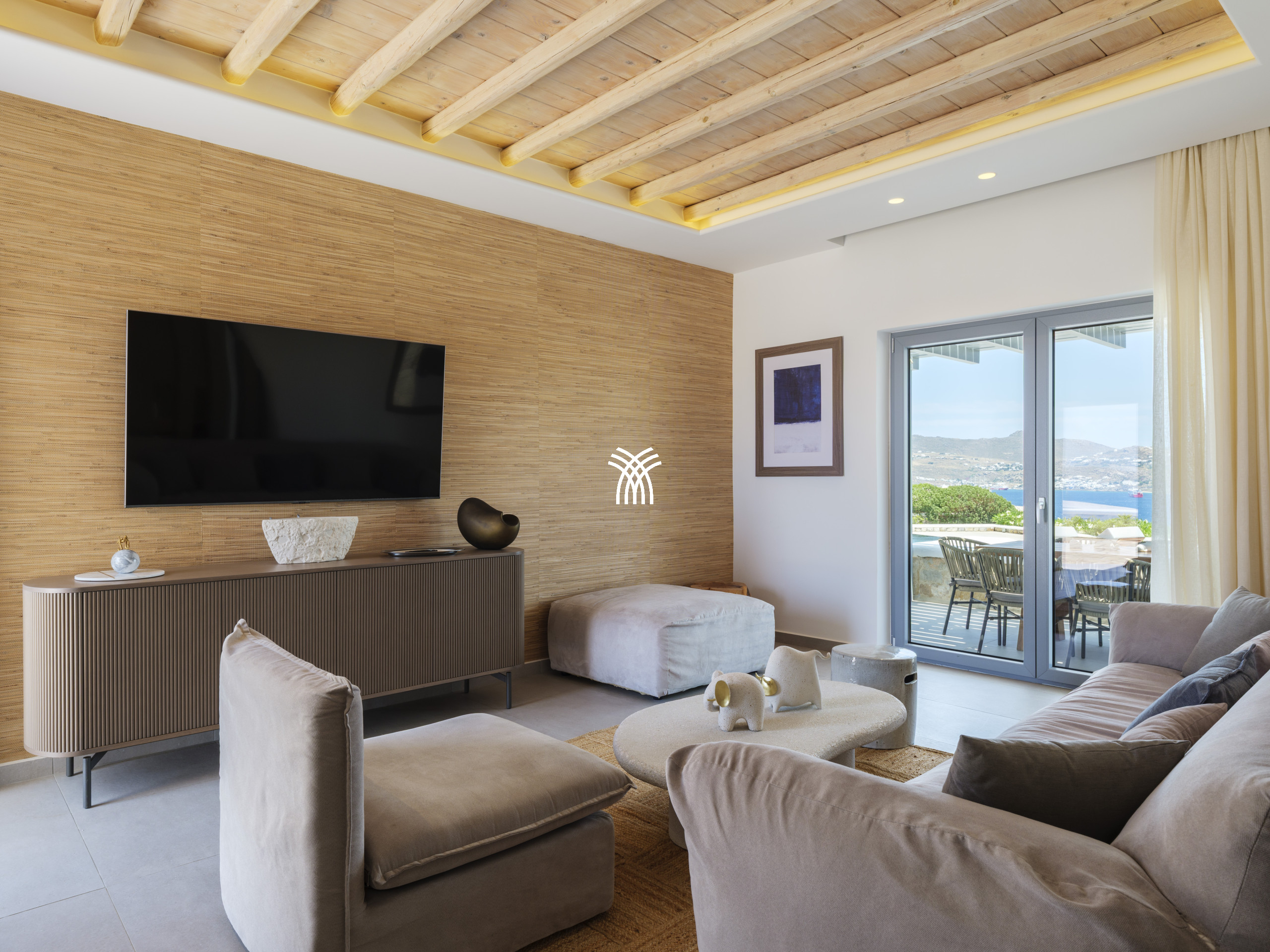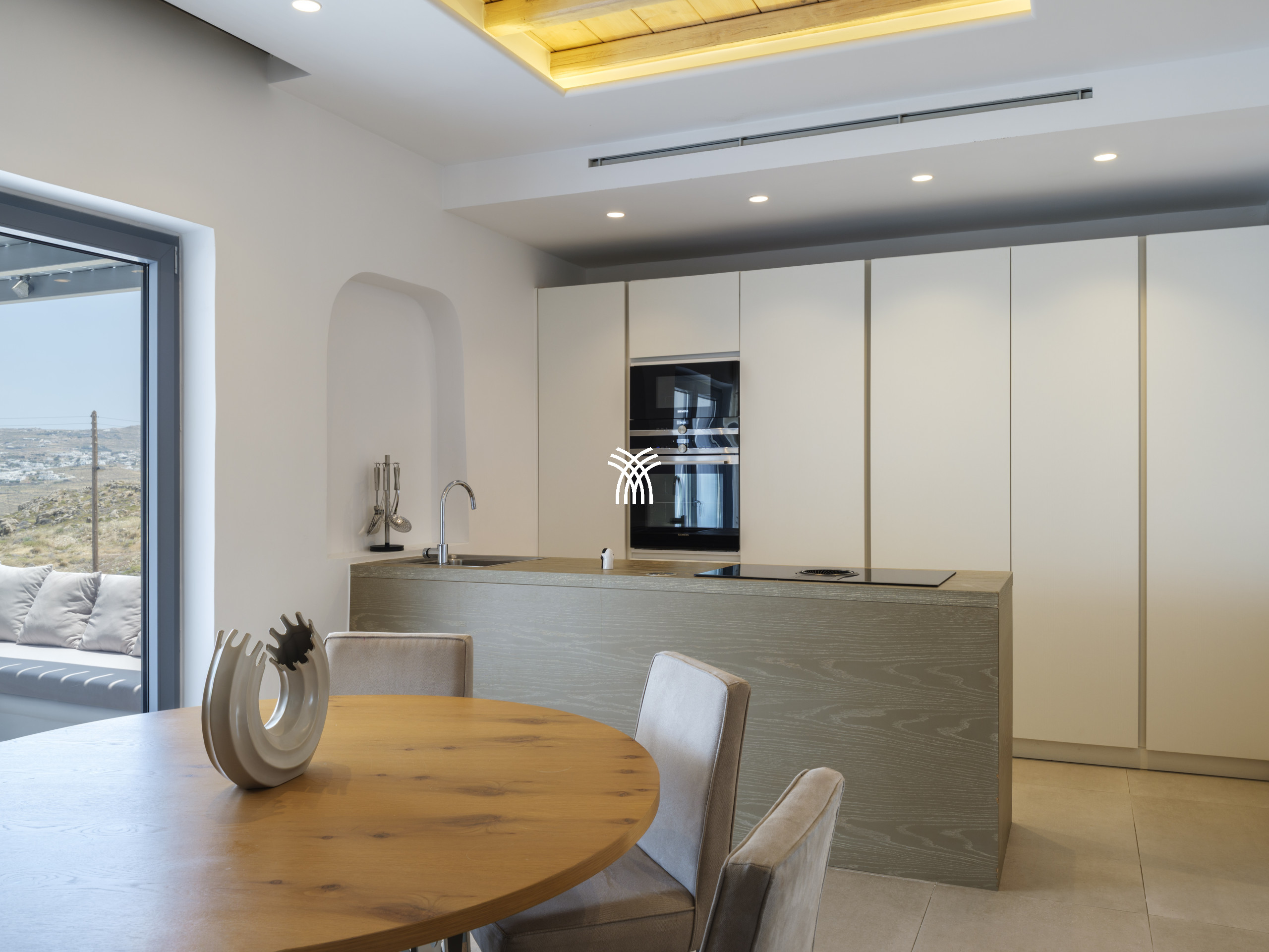 Blending contemporary Cycladic architecture with a minimalist Mediterranean aesthetic, the villa welcomes guests into a luminous open-plan living and dining space where natural light pours through expansive floor-to-ceiling windows, framing sweeping sea views and allowing the gentle island breeze to flow throughout the interiors. A fully equipped kitchen and stylish lounge area create a warm yet polished setting perfectly suited for shared meals, relaxed mornings, and elegant evening gatherings.