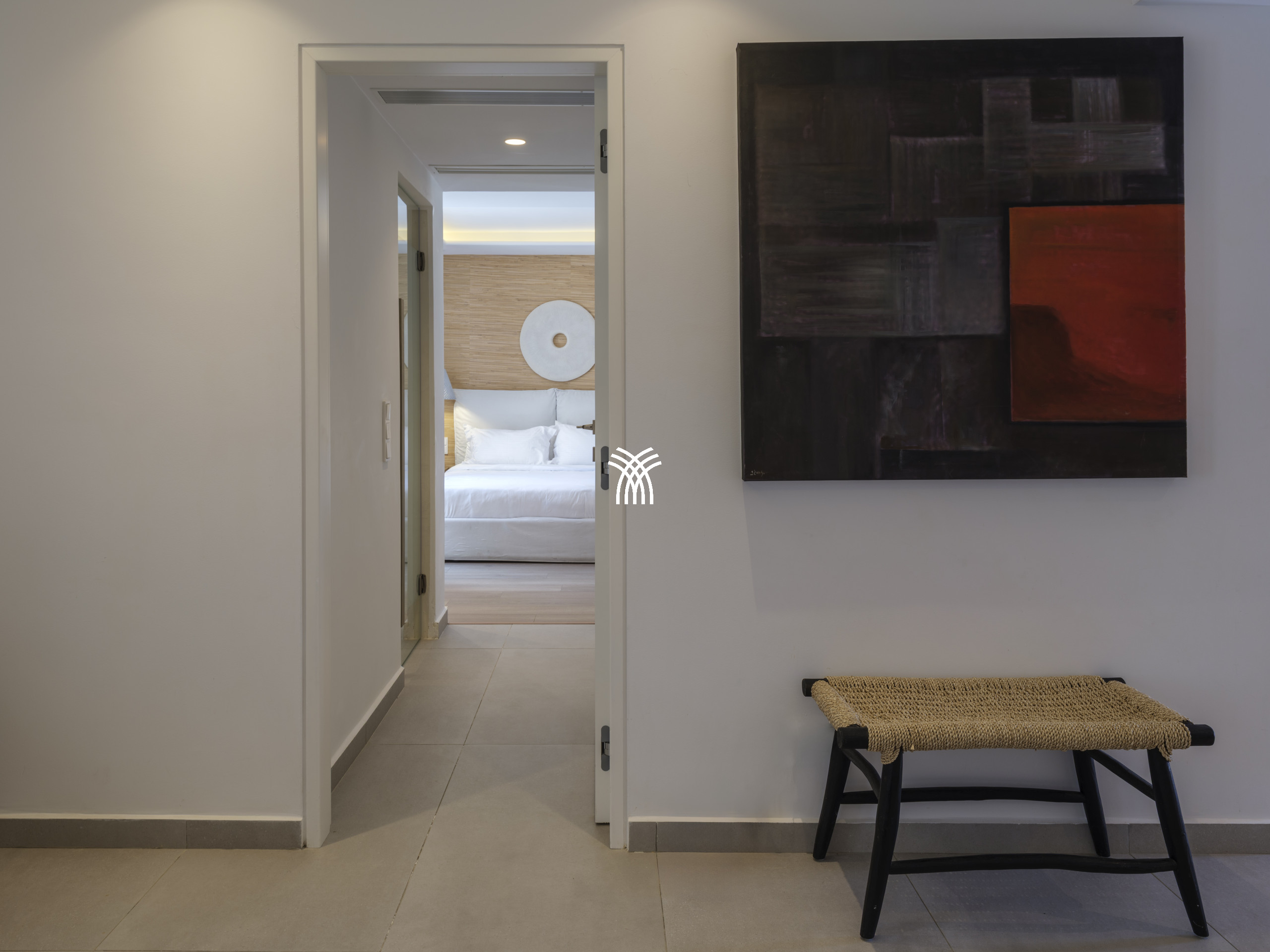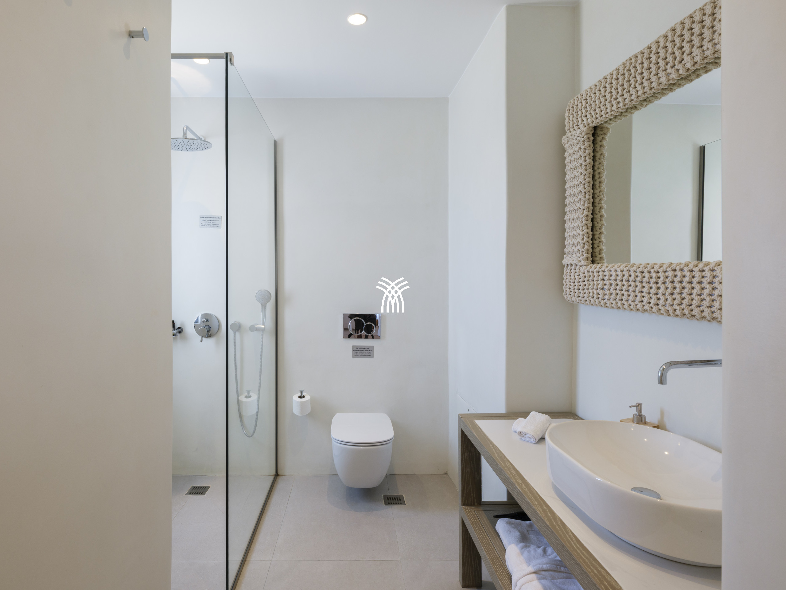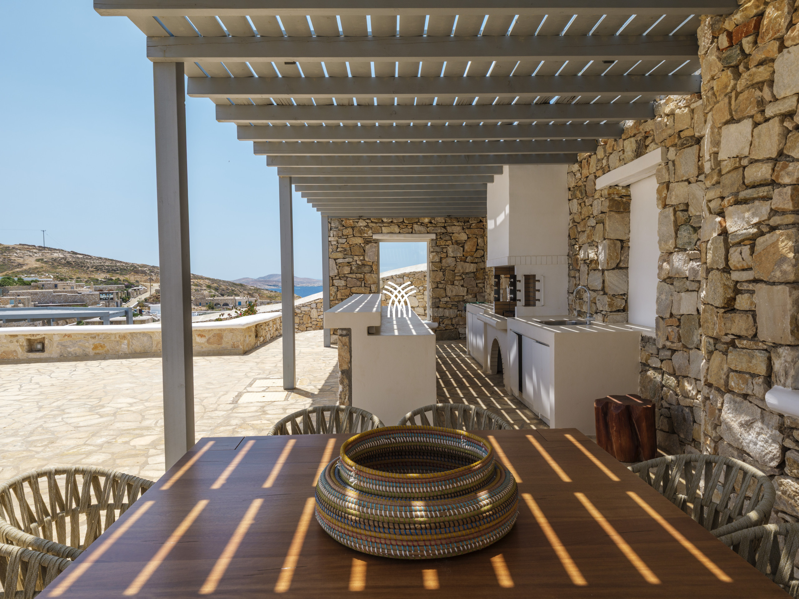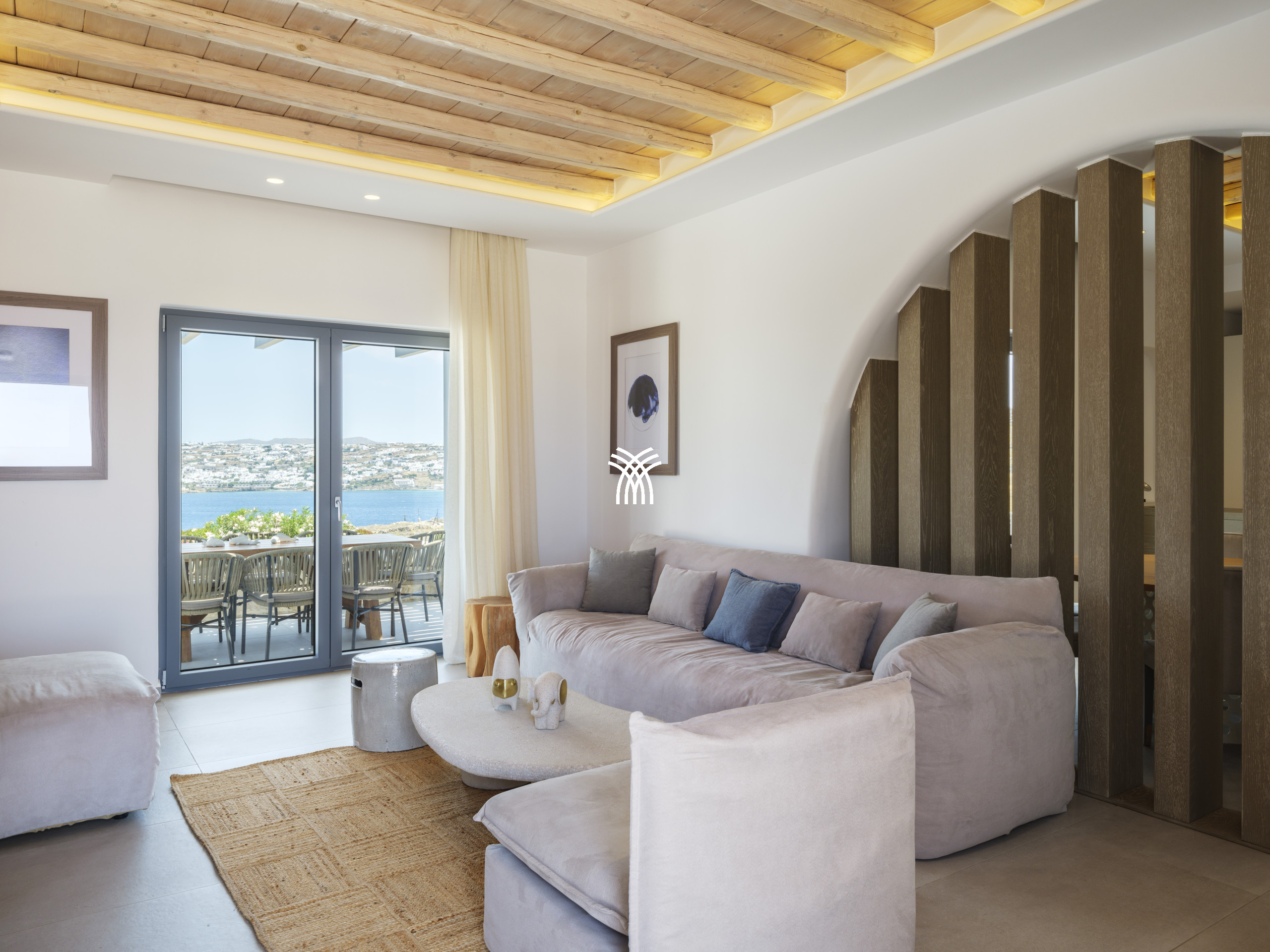 Blending contemporary Cycladic architecture with a minimalist Mediterranean aesthetic, the villa welcomes guests into a luminous open-plan living and dining space where natural light pours through expansive floor-to-ceiling windows, framing sweeping sea views and allowing the gentle island breeze to flow throughout the interiors. A fully equipped kitchen and stylish lounge area create a warm yet polished setting perfectly suited for shared meals, relaxed mornings, and elegant evening gatherings.