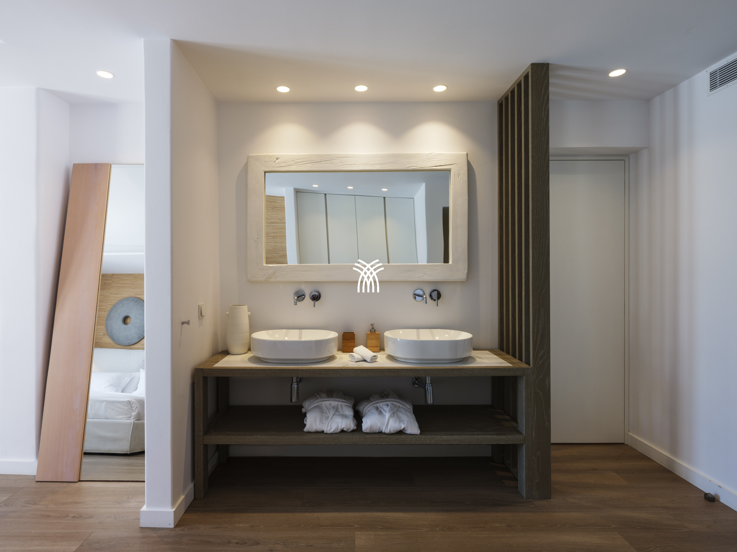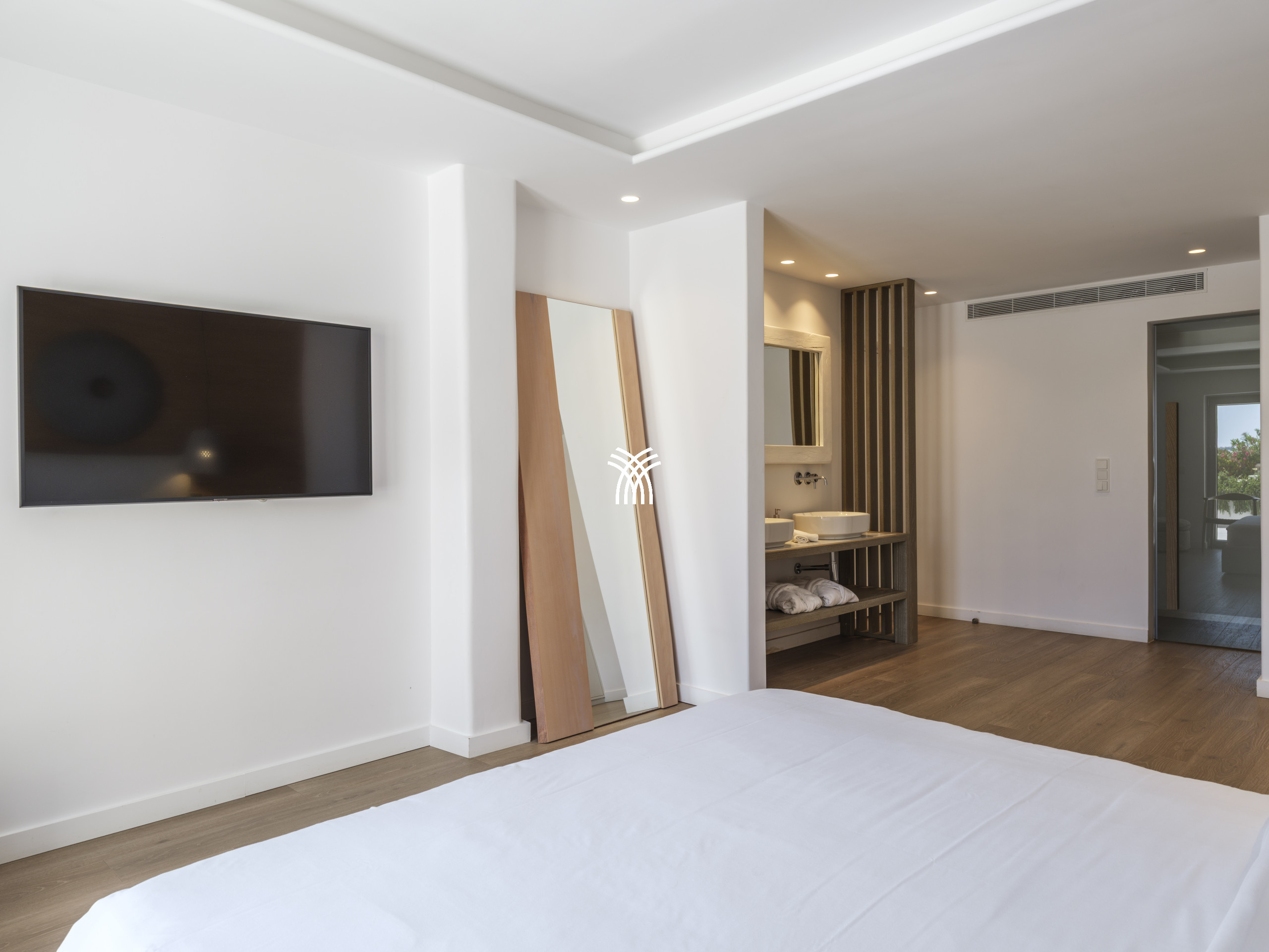 The property features seven beautifully appointed bedrooms, each with its own en-suite bathroom and generous storage, designed as serene private retreats defined by soft textures, calming neutral palettes, and thoughtful detailing that ensures both comfort and refined simplicity. Outdoors, sun-drenched terraces unfold toward a private infinity pool, while multiple lounging and dining spaces invite long afternoons beneath the Mediterranean sun and unforgettable sunset moments with uninterrupted views across the horizon.
