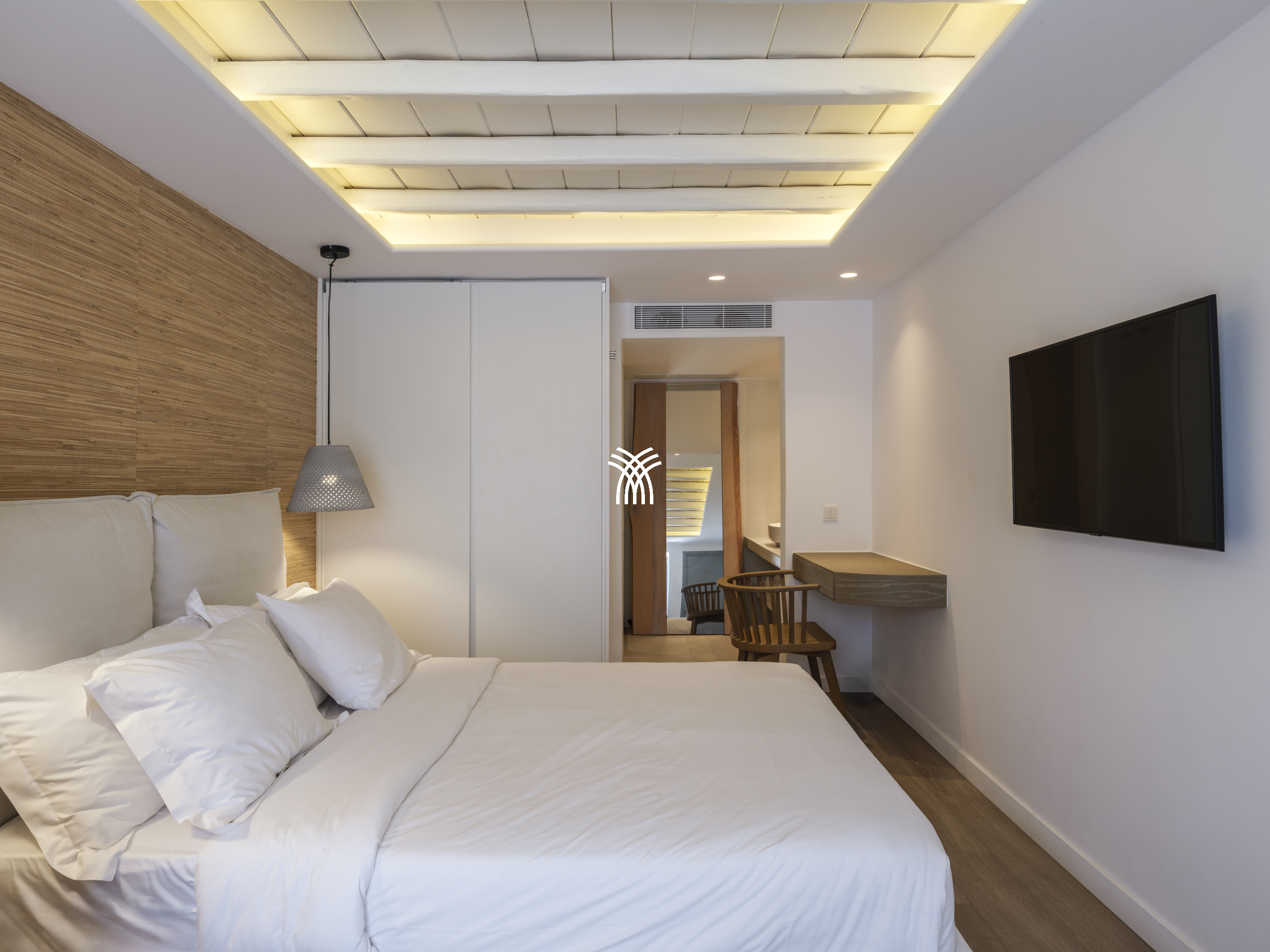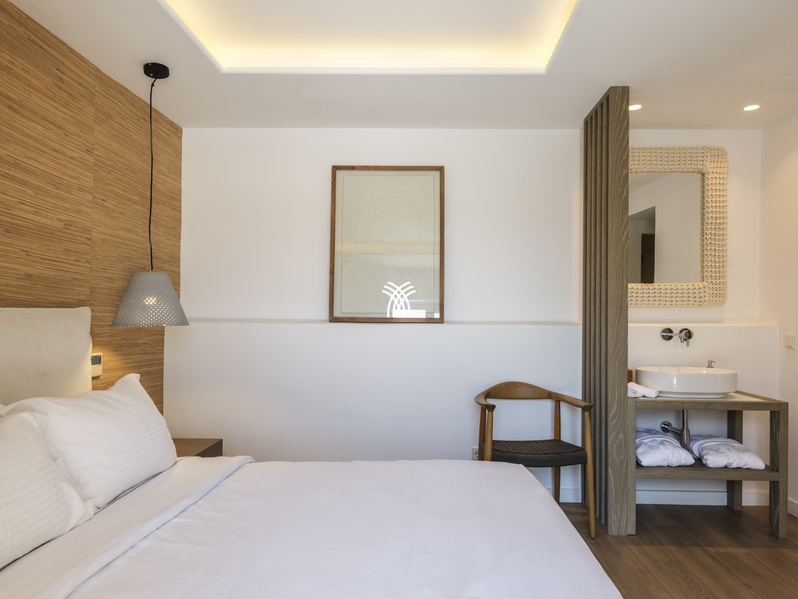 This expansive 400 square meter villa is built across three levels and features seven master bedrooms, each with plush beds and en suite bathrooms, along with an additional guest WC. The sophisticated living room and fully equipped kitchen provide ample space for relaxation and entertaining, while the design reflects the timeless elegance of Cycladic architecture. Outside, a 100 square meter infinity pool anchors the generous private terrace, perfectly sheltered from Mykonos’ famous winds and offering breathtaking views of the Aegean Sea and the charming Mykonos skyline.