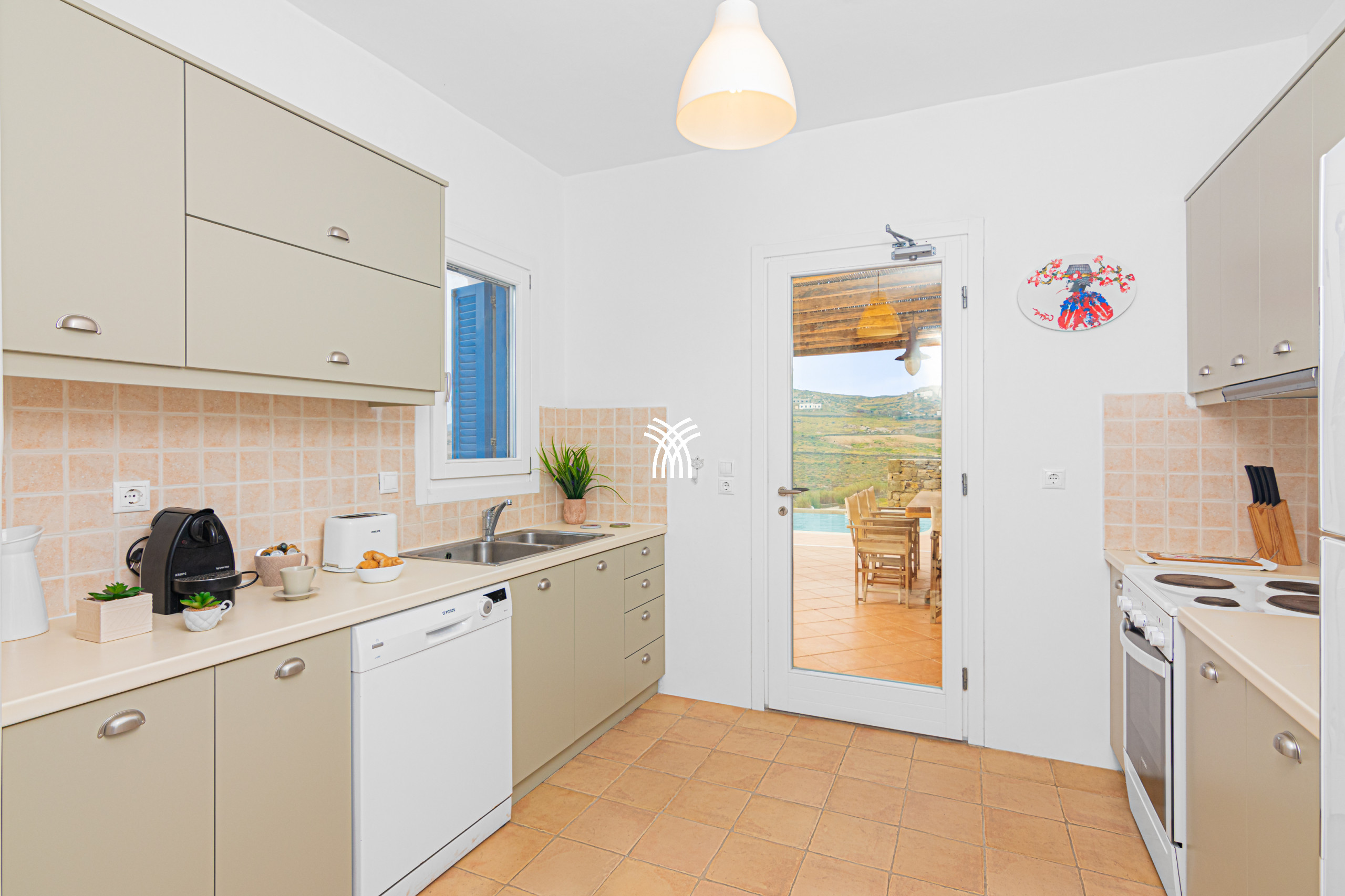 The fully equipped kitchen and open-plan living room lead to a generous veranda with a shaded dining area under a wooden pergola, creating the perfect space for al fresco meals and entertaining. A private swimming pool completes the outdoor oasis, inviting you to relax in total comfort. Whether you seek quiet moments or memorable gatherings, this luxury villa rental in Greece offers the ideal blend of elegance, privacy, and natural beauty.