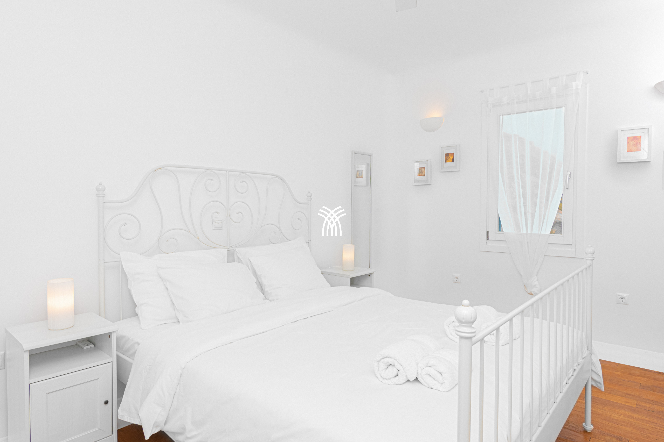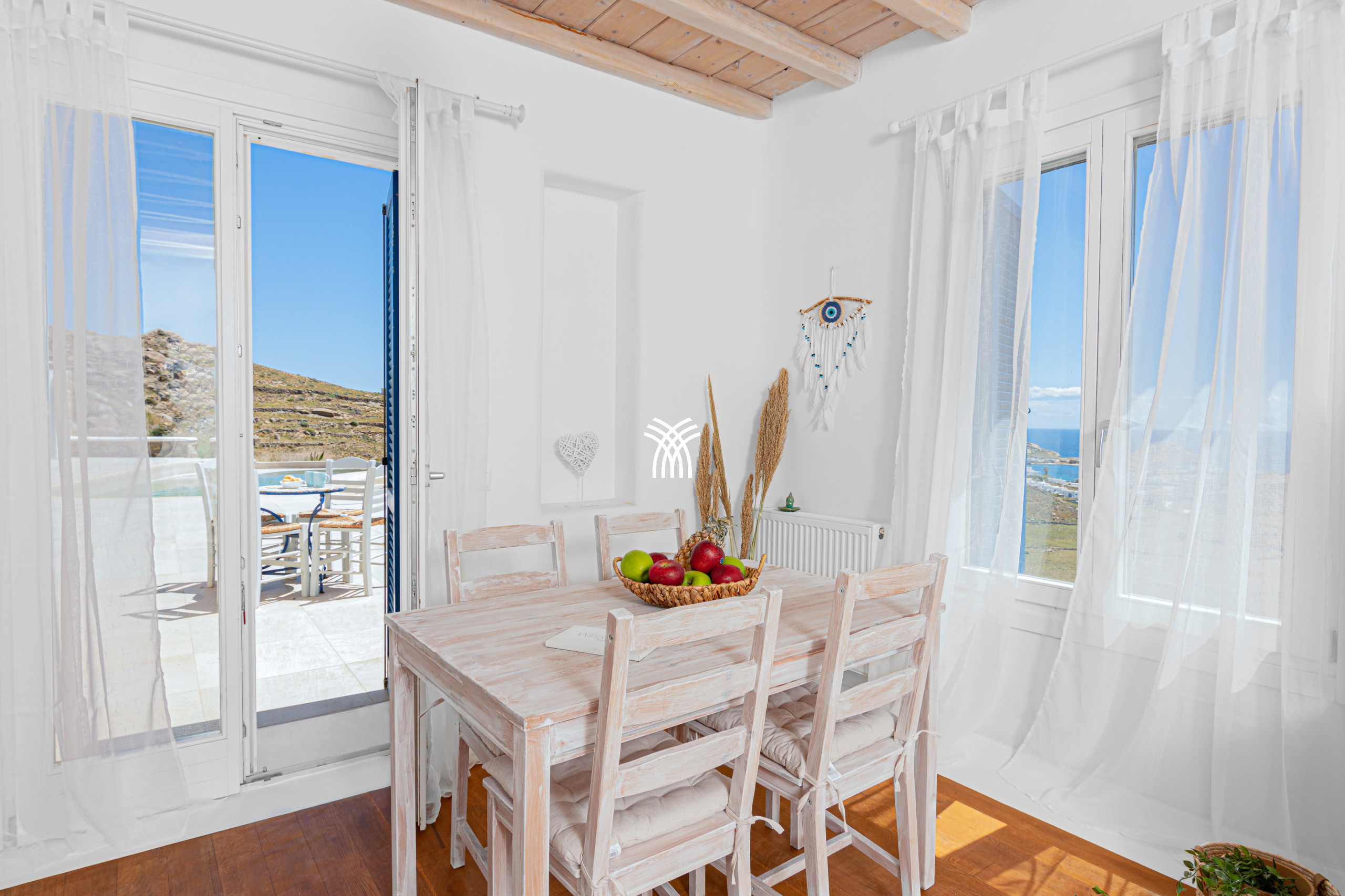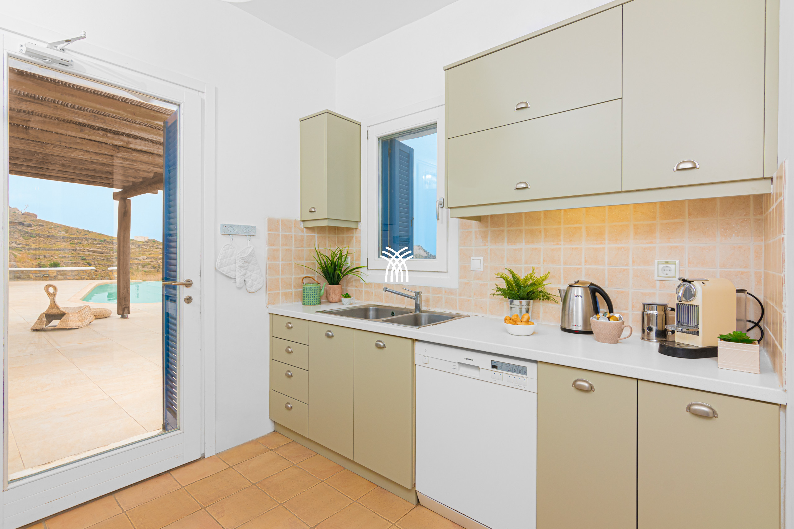 Inside, the villa boasts a spacious living room with plush seating and spectacular views of the pool and Aegean Sea. The fully equipped kitchen caters to all your culinary desires, complemented by a separate laundry and storage area for convenience.