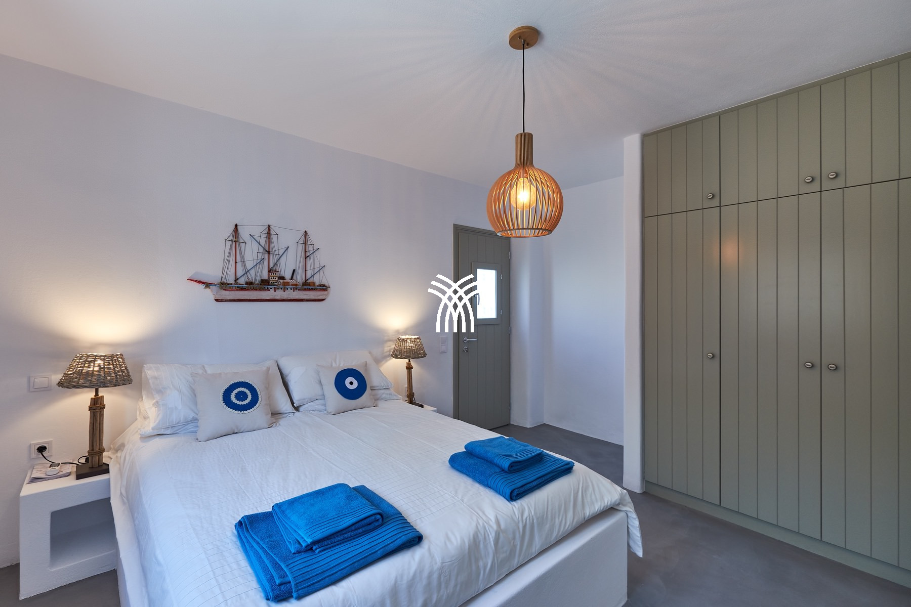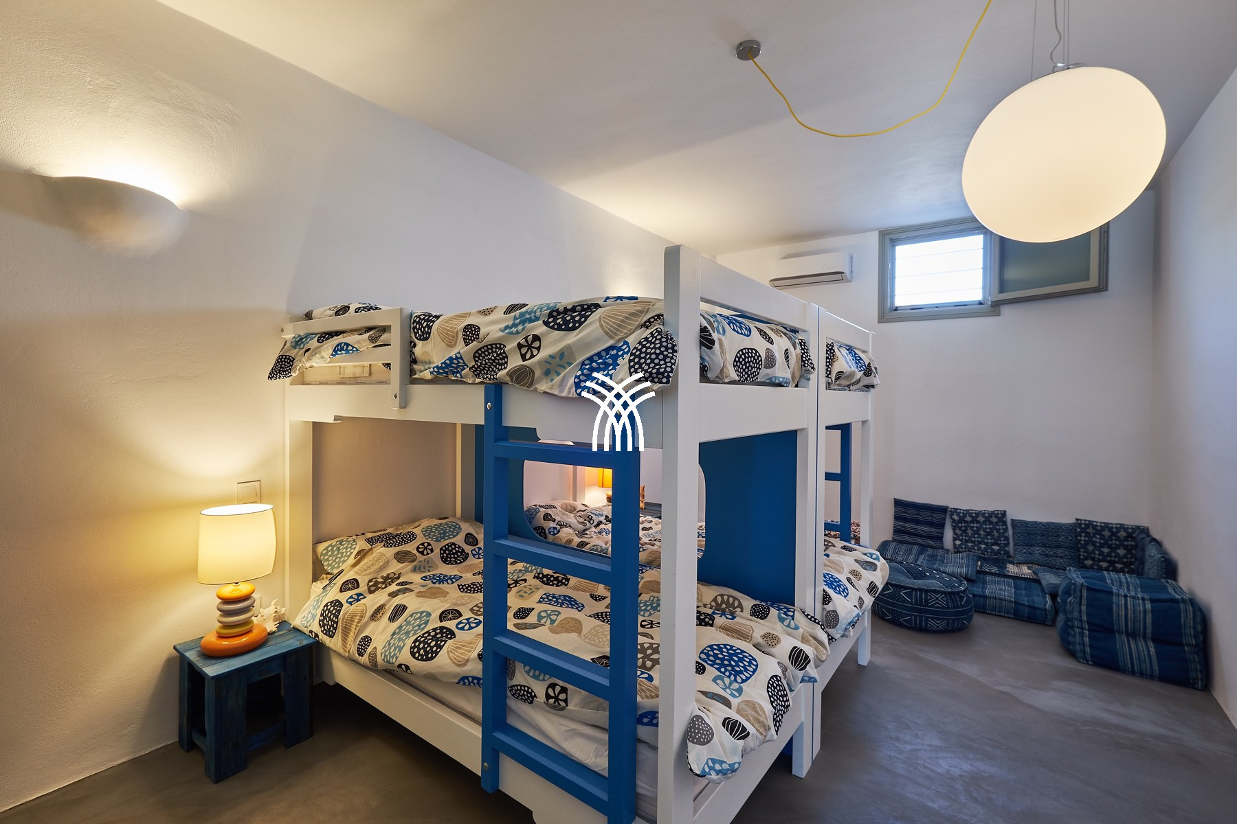 Fully air-conditioned and thoughtfully equipped, the residence unfolds into luminous, open-plan living spaces where modern design harmonizes with subtle Greek influences. The spacious living area flows naturally into a fully equipped kitchen, ideal for convivial moments and relaxed gatherings, while every detail has been carefully curated to elevate daily living into a refined lifestyle. The villa features five generously proportioned bedrooms, including four double en-suite rooms and one double-bunk bedroom, complemented by an additional family bathroom that enhances comfort and convenience for families and groups.