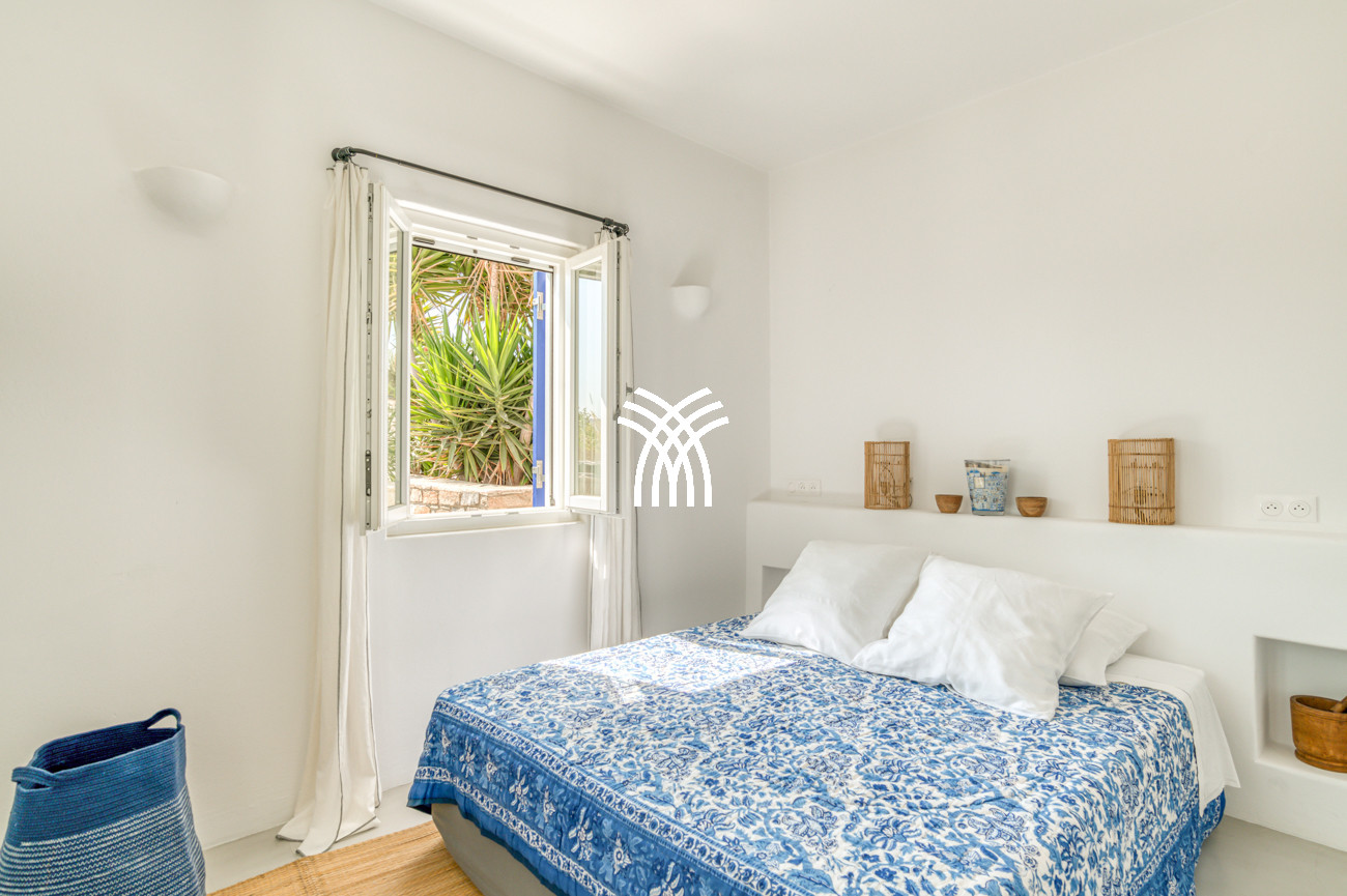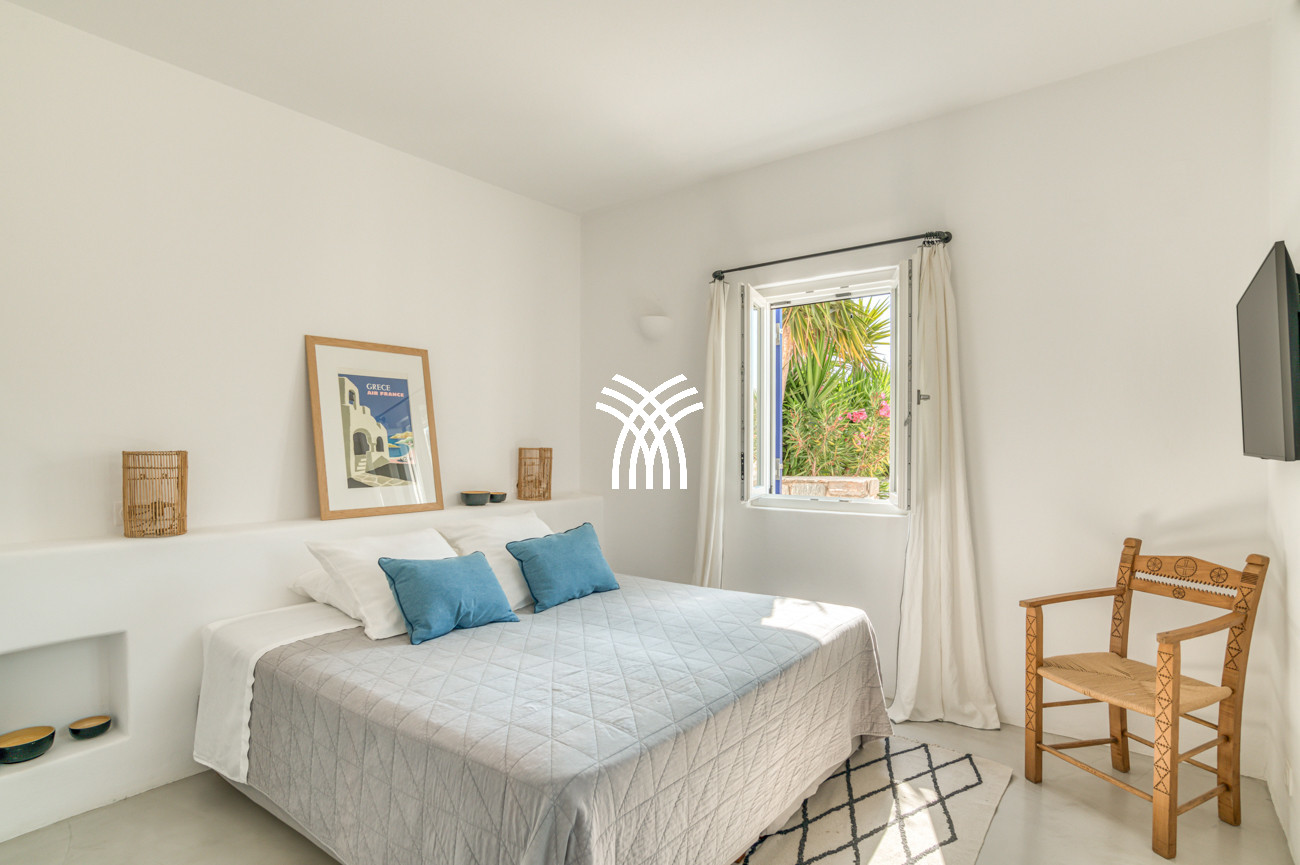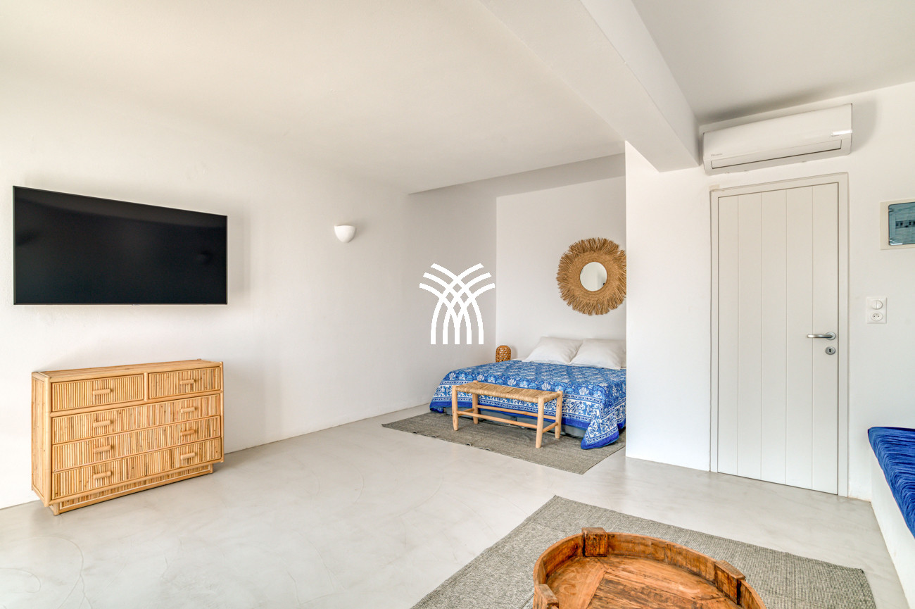 The interior reveals five elegantly appointed bedrooms, each with its own en-suite bathroom, offering privacy and comfort in perfect balance. Throughout the villa, the subtle dialogue between traditional Cycladic architecture and modern design elevates every space, while the timeless palette of blue and white infuses the residence with an authentic Mediterranean identity and a refined aesthetic that invites effortless relaxation.