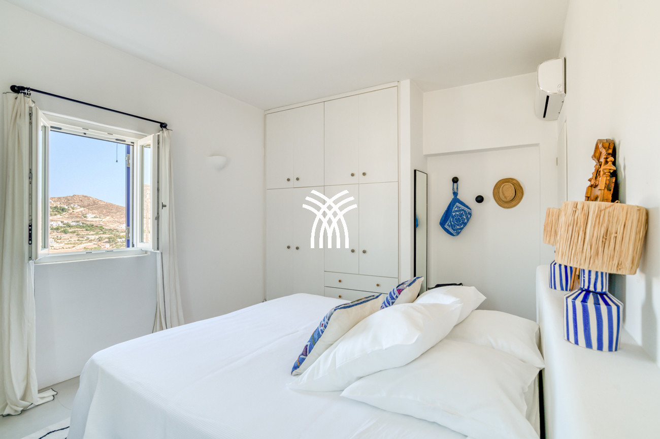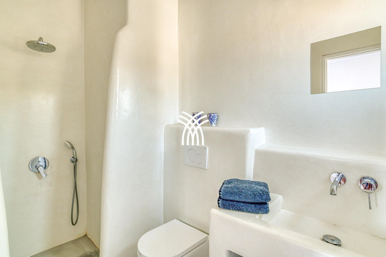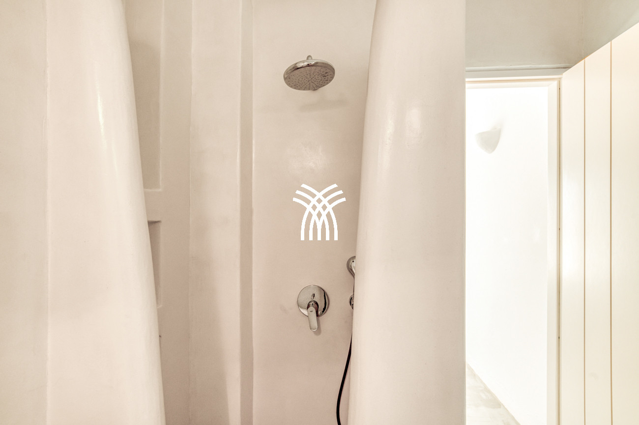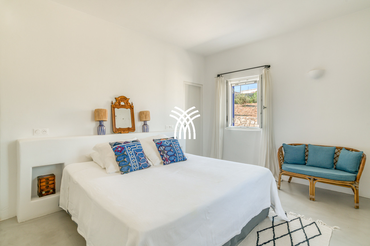 The interior reveals five elegantly appointed bedrooms, each with its own en-suite bathroom, offering privacy and comfort in perfect balance. Throughout the villa, the subtle dialogue between traditional Cycladic architecture and modern design elevates every space, while the timeless palette of blue and white infuses the residence with an authentic Mediterranean identity and a refined aesthetic that invites effortless relaxation.