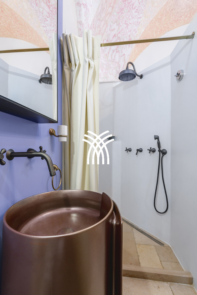 Other rooms, such as Maria Antonietta, a true nod to French boudoirs, or Viola, with its outdoor shower under a wisteria pergola, cultivate a delicate and poetic luxury. The Camera Bianca, located on the terrace, embodies the serenity of the crown chakra and offers a soothing view, ideal for contemplation. Finally, the immersive experience culminates with the La mia Africa and Mexico a Novoli suites, with generous volumes, steeped in culture, symbols, and ethnic elegance.