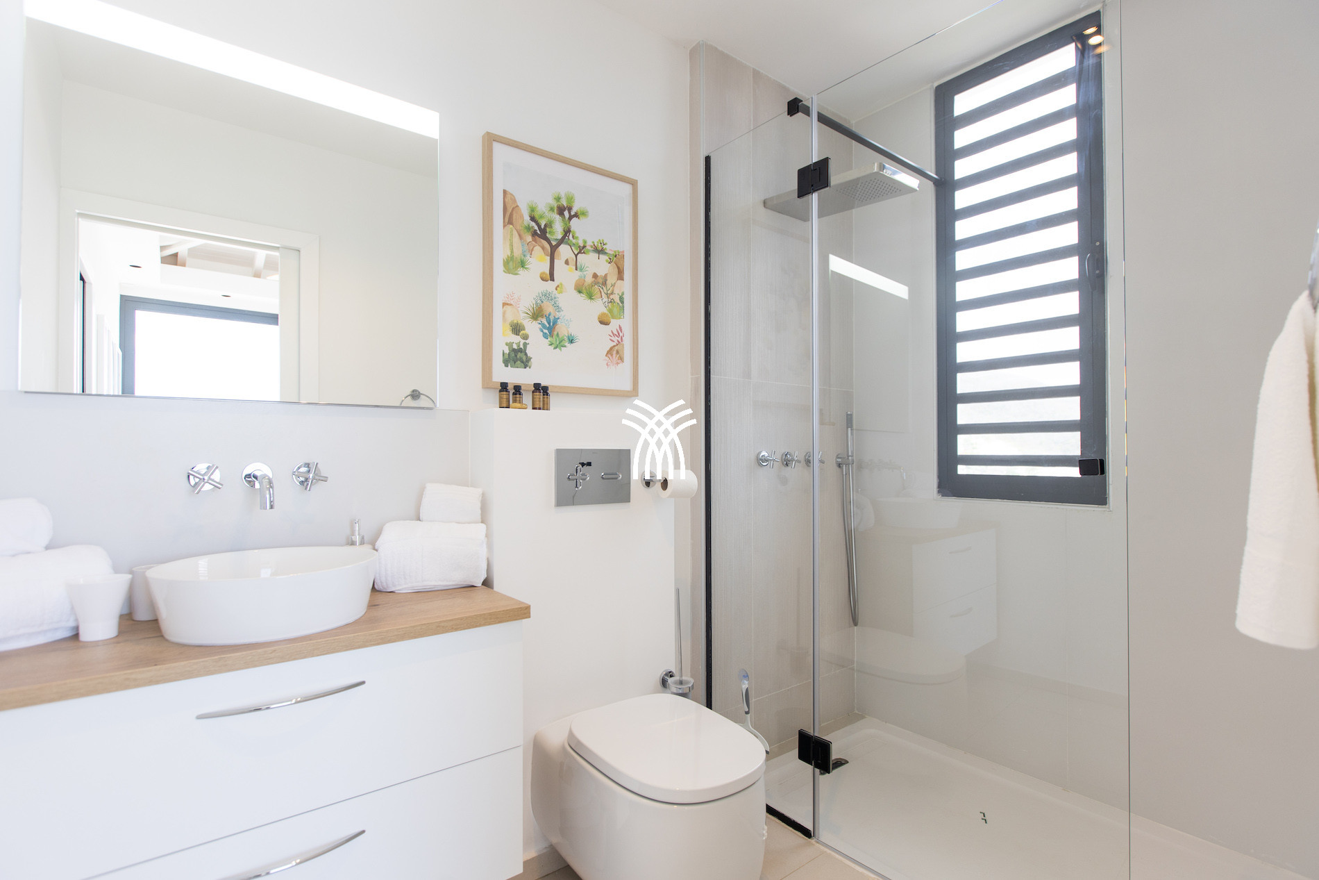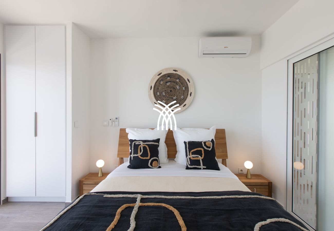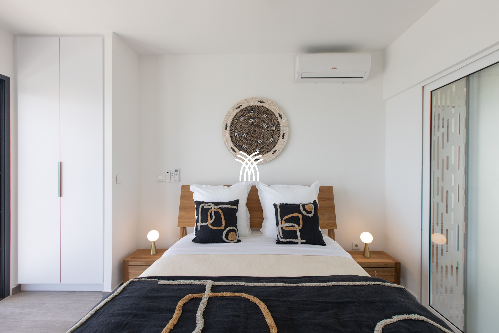 Inside the villa, you will find 4 elegantly decorated bedrooms, accessible from the interior space. Each bedroom is fully air-conditioned and has its own en-suite bathroom, ensuring privacy and comfort. Three of the bedrooms offer panoramic views of the pool and the ocean, while the fourth bedroom overlooks the garden and has its own private terrace, perfect for moments of tranquility.