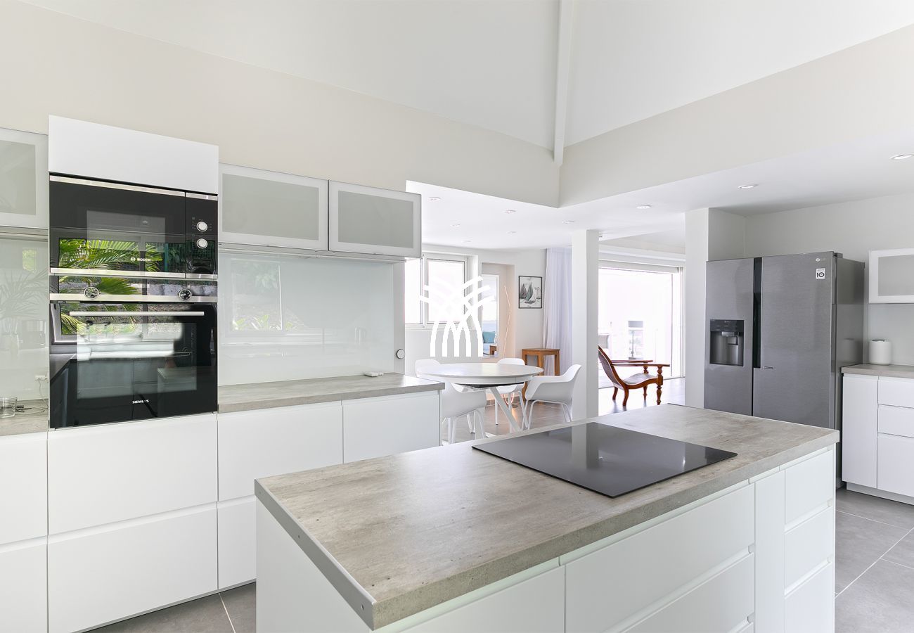 The living space, spacious and welcoming, opens onto a sunny terrace and a heated private pool (heating available from December 16 to April 15), offering an idyllic setting to relax facing the ocean. The high-end kitchen is fully equipped to prepare delicious meals in a chic and modern environment.