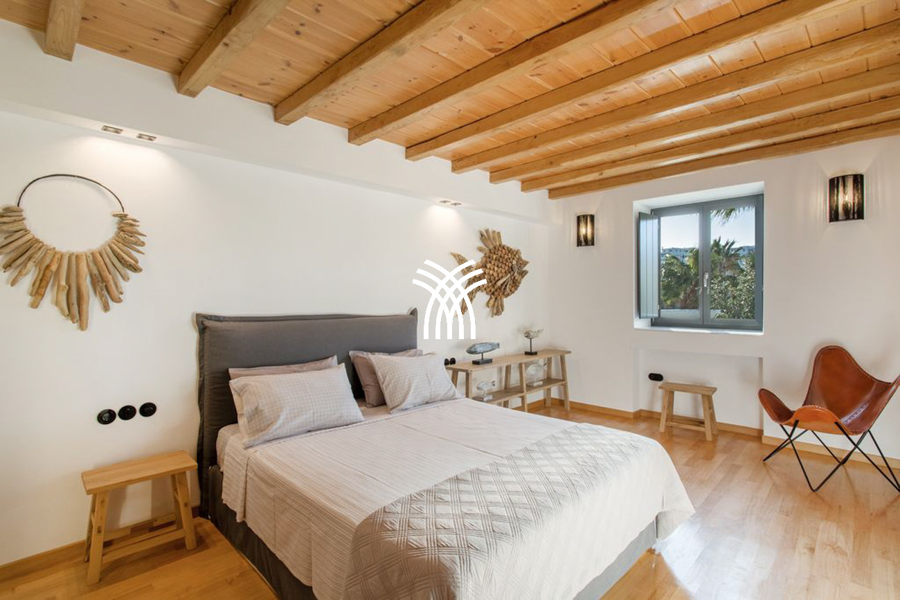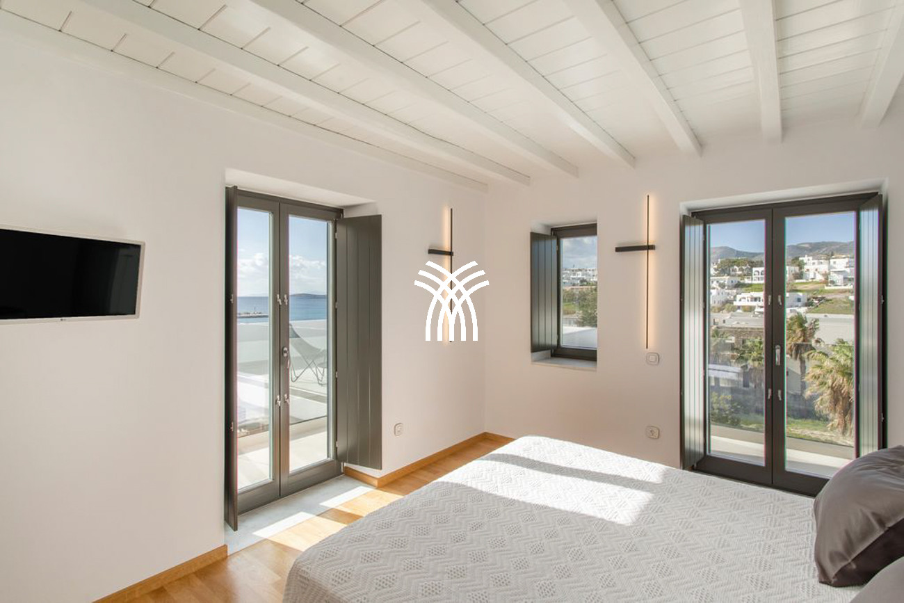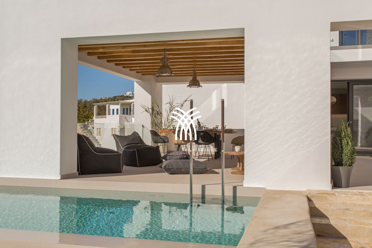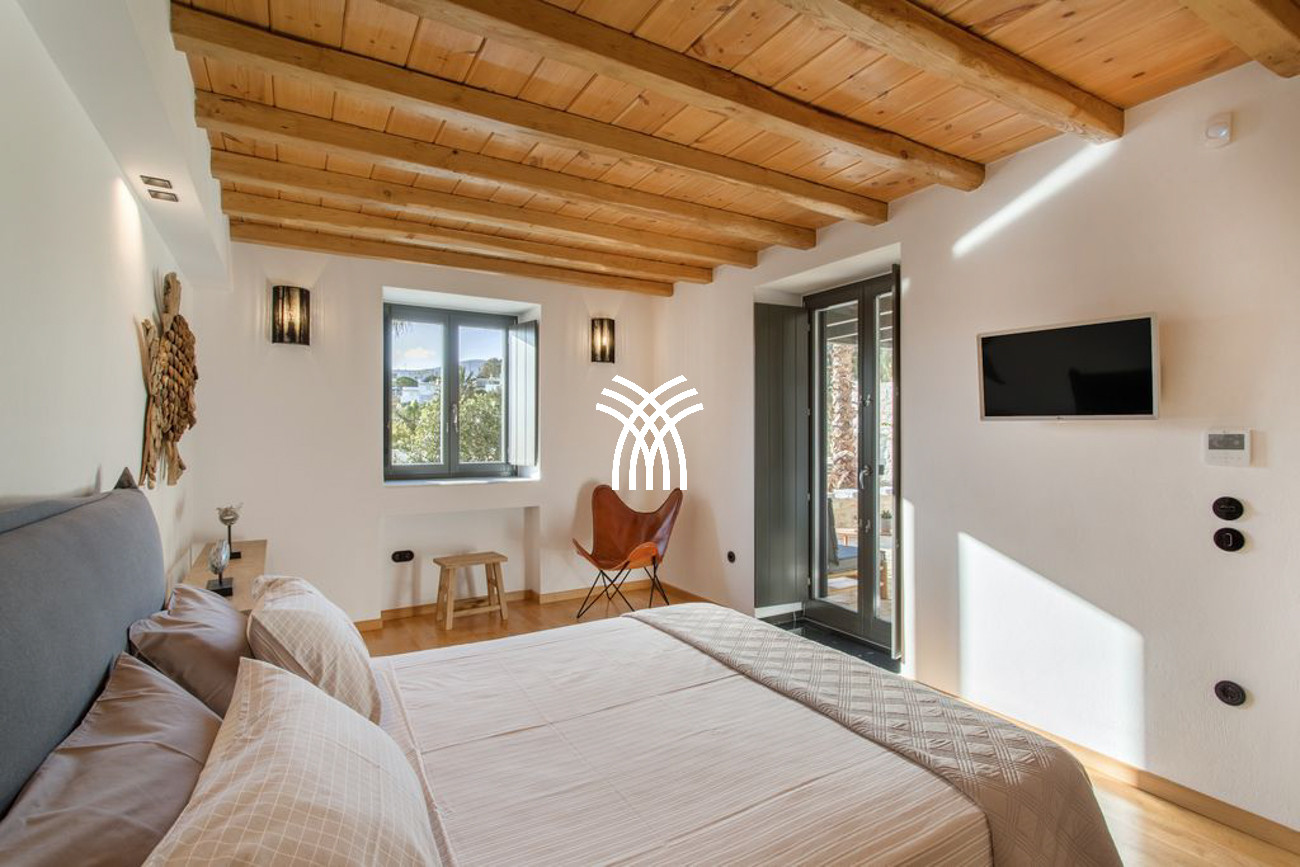 The villa’s expansive outdoor spaces unfold toward sweeping views of Piso Livadi’s tranquil bay, where the changing light of dusk creates a mesmerizing panorama over the sea. At the heart of the exterior lies a stunning swimming pool surrounded by elegant built-in sun loungers, inviting moments of relaxation under the Mediterranean sun. A pergola-shaded dining area beside the pool sets the stage for memorable gatherings, whether beneath the bright Cycladic sky or the soft glow of evening. Upstairs, refined bedrooms reflect the understated elegance and authentic character of Piso Livadi, each designed to offer privacy and spectacular sea views.