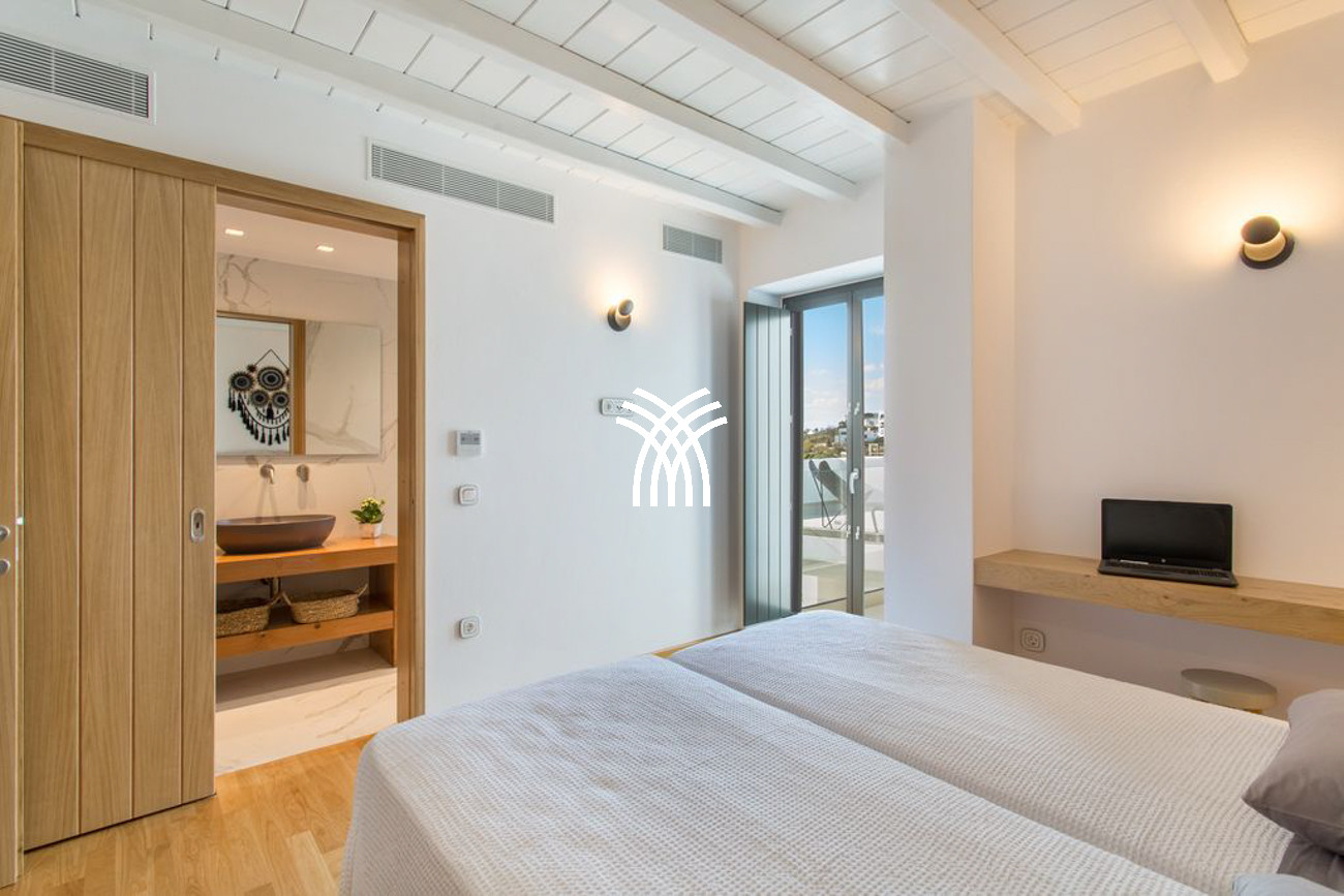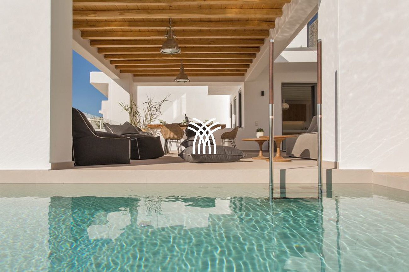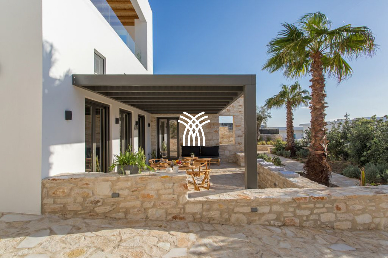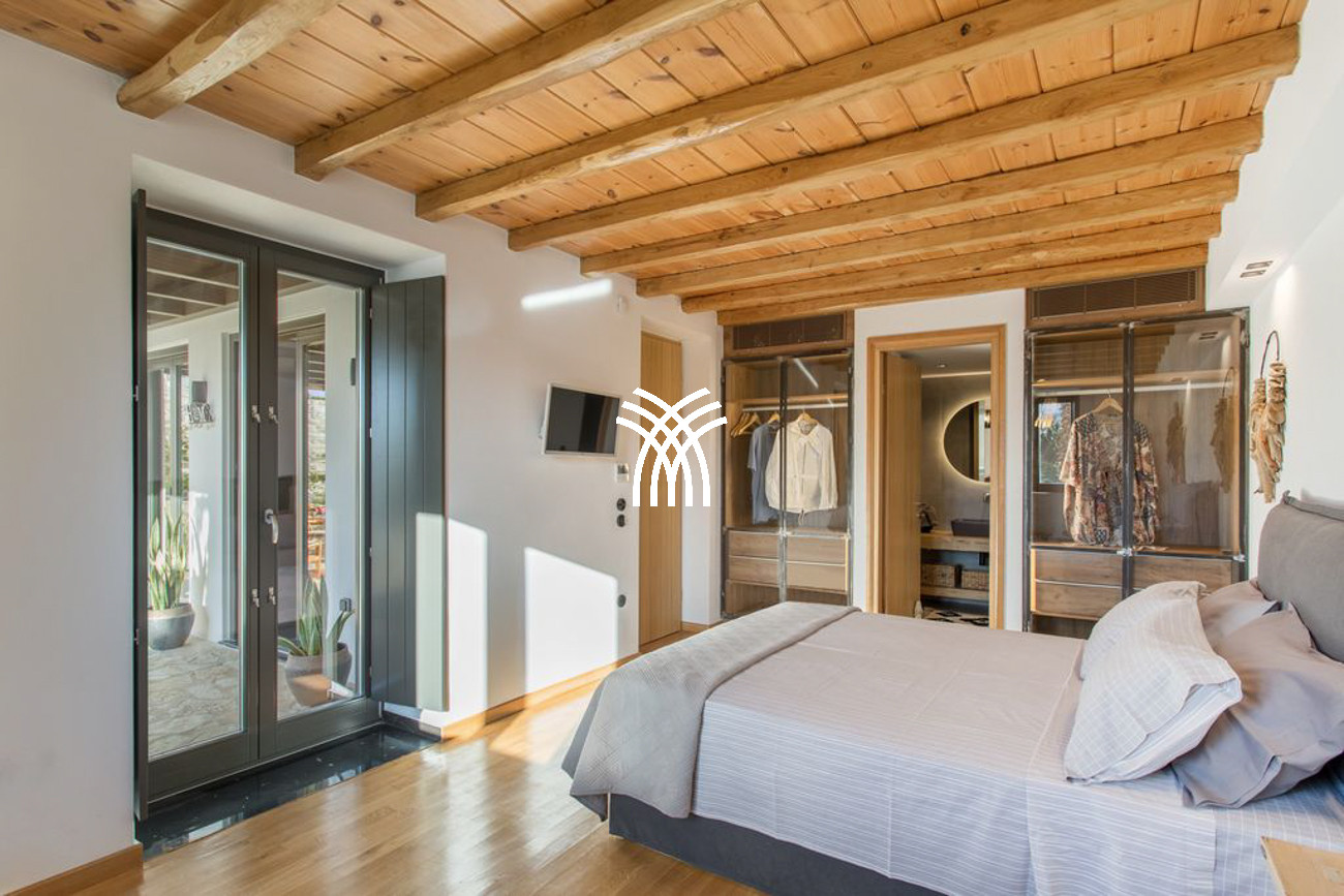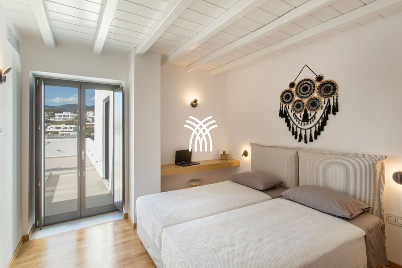 The villa’s expansive outdoor spaces unfold toward sweeping views of Piso Livadi’s tranquil bay, where the changing light of dusk creates a mesmerizing panorama over the sea. At the heart of the exterior lies a stunning swimming pool surrounded by elegant built-in sun loungers, inviting moments of relaxation under the Mediterranean sun. A pergola-shaded dining area beside the pool sets the stage for memorable gatherings, whether beneath the bright Cycladic sky or the soft glow of evening. Upstairs, refined bedrooms reflect the understated elegance and authentic character of Piso Livadi, each designed to offer privacy and spectacular sea views.