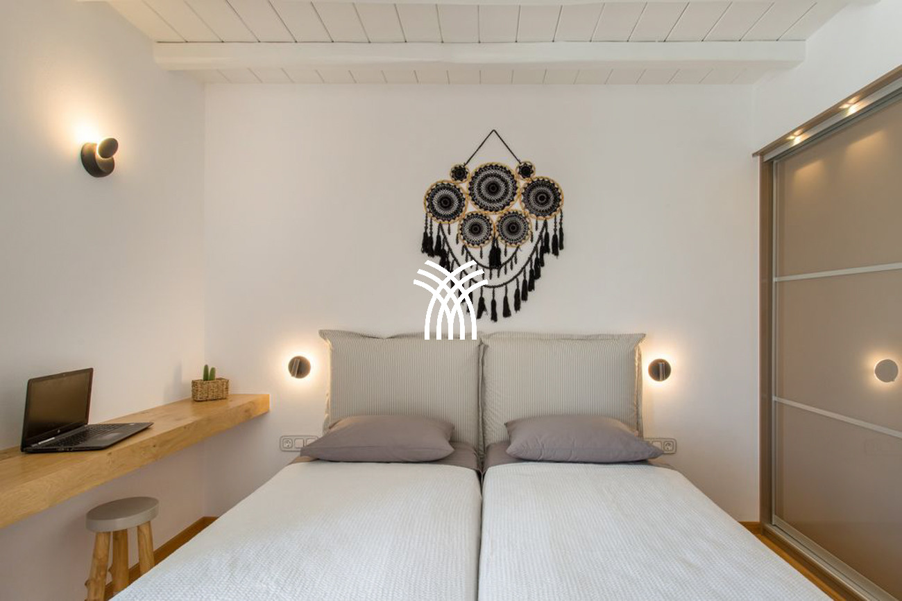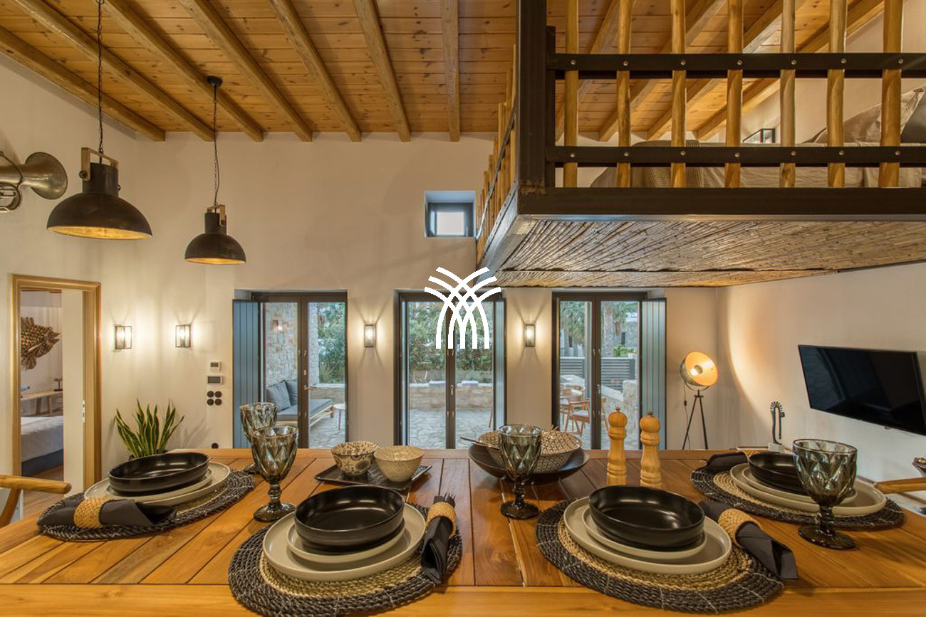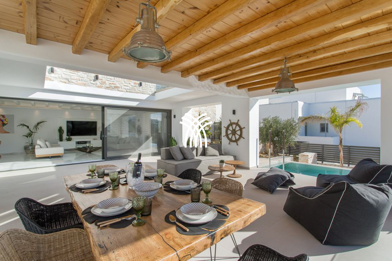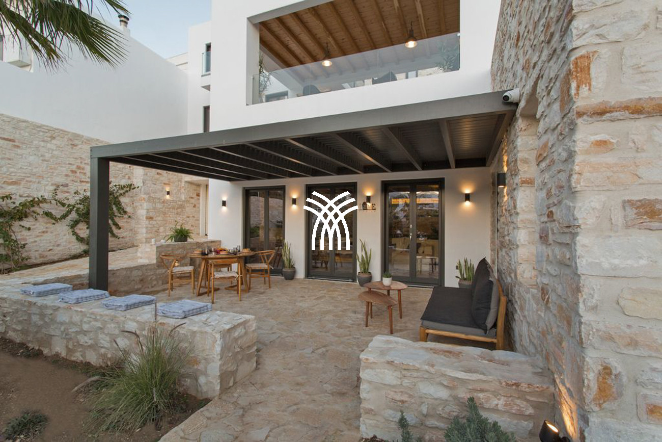 The villa’s expansive outdoor spaces unfold toward sweeping views of Piso Livadi’s tranquil bay, where the changing light of dusk creates a mesmerizing panorama over the sea. At the heart of the exterior lies a stunning swimming pool surrounded by elegant built-in sun loungers, inviting moments of relaxation under the Mediterranean sun. A pergola-shaded dining area beside the pool sets the stage for memorable gatherings, whether beneath the bright Cycladic sky or the soft glow of evening. Upstairs, refined bedrooms reflect the understated elegance and authentic character of Piso Livadi, each designed to offer privacy and spectacular sea views.