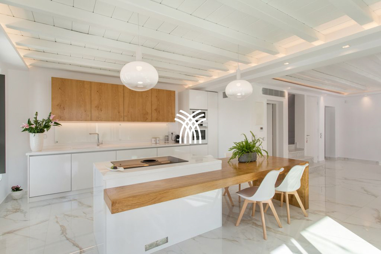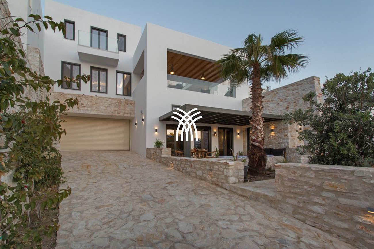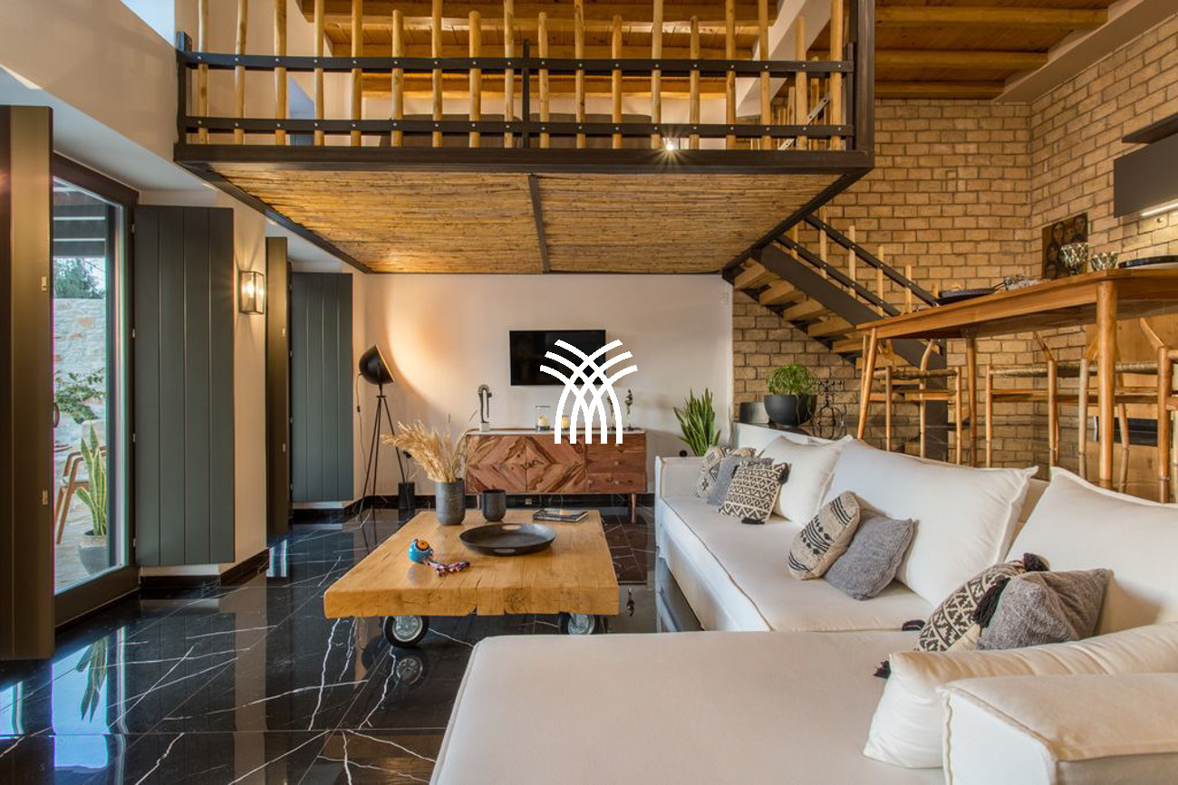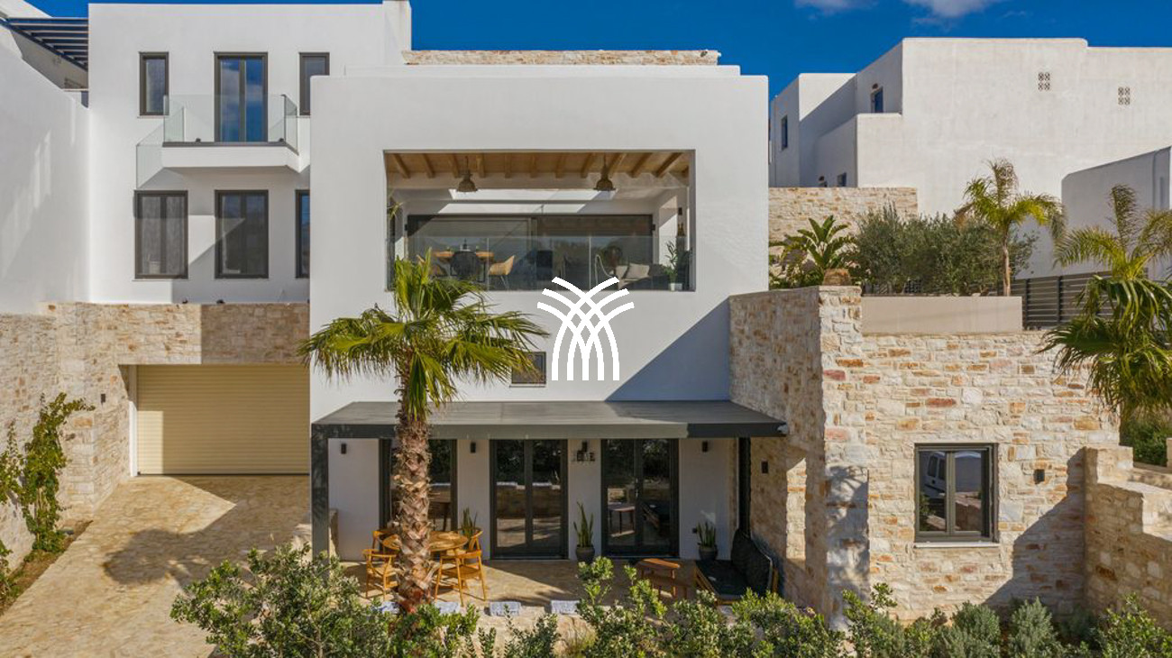 Inside, Casa Aloe reveals an atmosphere of minimalist sophistication, where bright white tones blend harmoniously with warm wooden accents to create a refined yet welcoming ambiance. The spacious living room and indoor dining area are bathed in natural light through expansive windows that frame captivating Mediterranean vistas. A fully equipped modern kitchen with elegant finishes and a cozy lounge area completes the main living space, while a staircase and private elevator connect all levels of the residence. Three luxurious bedrooms on the upper floors feature plush double beds, private bathrooms, and balconies overlooking the Aegean Sea, offering an elevated standard of comfort and style.