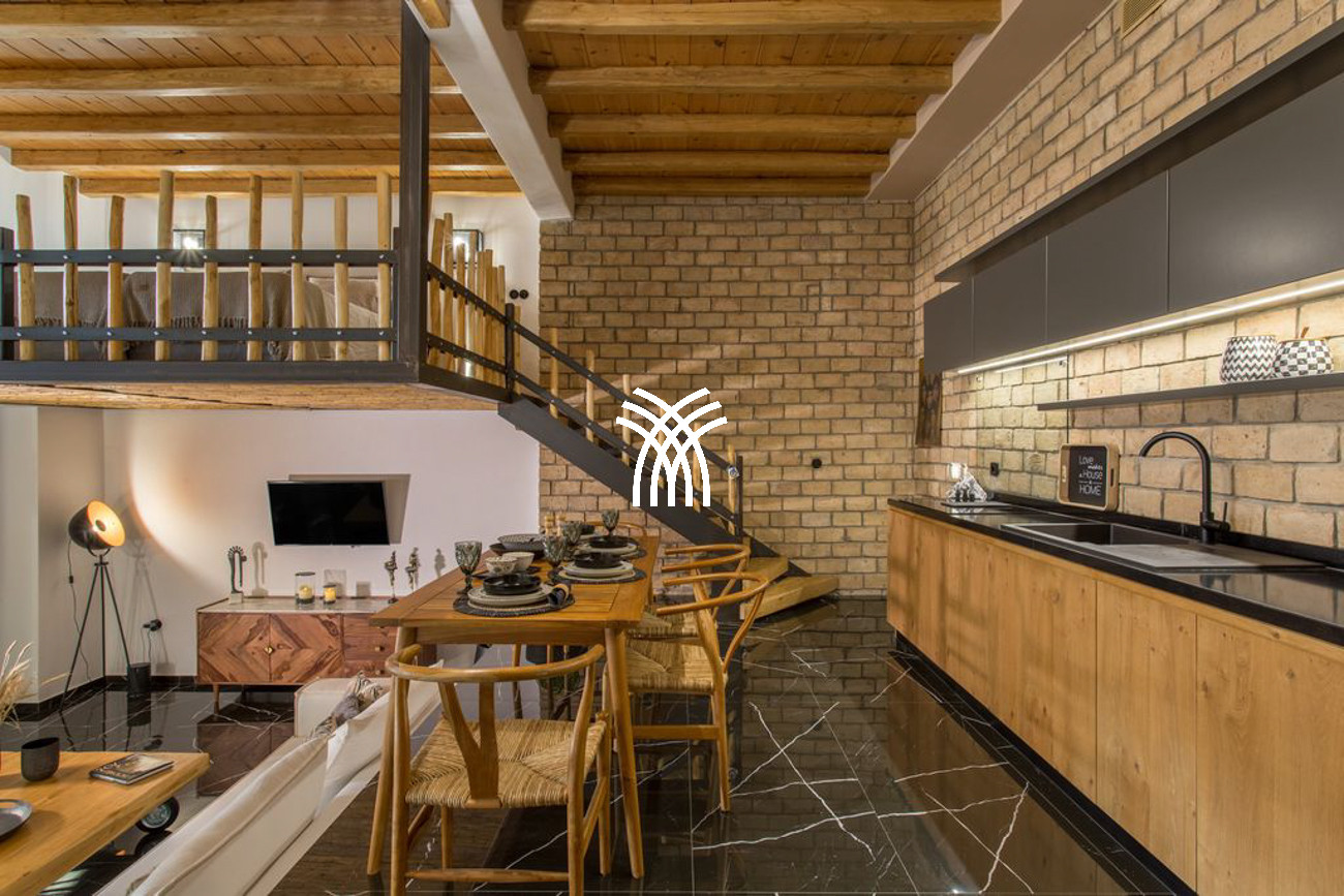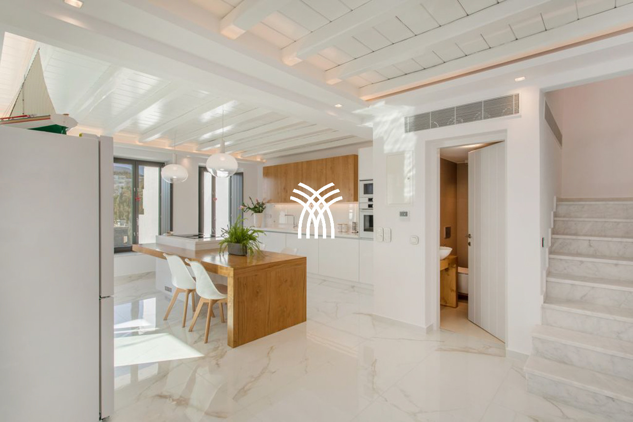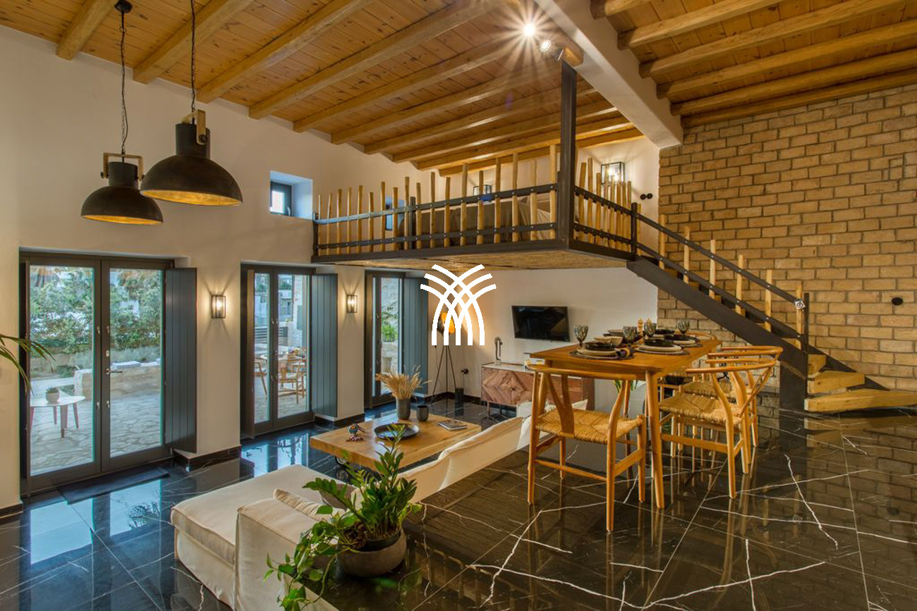 Inside, Casa Aloe reveals an atmosphere of minimalist sophistication, where bright white tones blend harmoniously with warm wooden accents to create a refined yet welcoming ambiance. The spacious living room and indoor dining area are bathed in natural light through expansive windows that frame captivating Mediterranean vistas. A fully equipped modern kitchen with elegant finishes and a cozy lounge area completes the main living space, while a staircase and private elevator connect all levels of the residence. Three luxurious bedrooms on the upper floors feature plush double beds, private bathrooms, and balconies overlooking the Aegean Sea, offering an elevated standard of comfort and style.