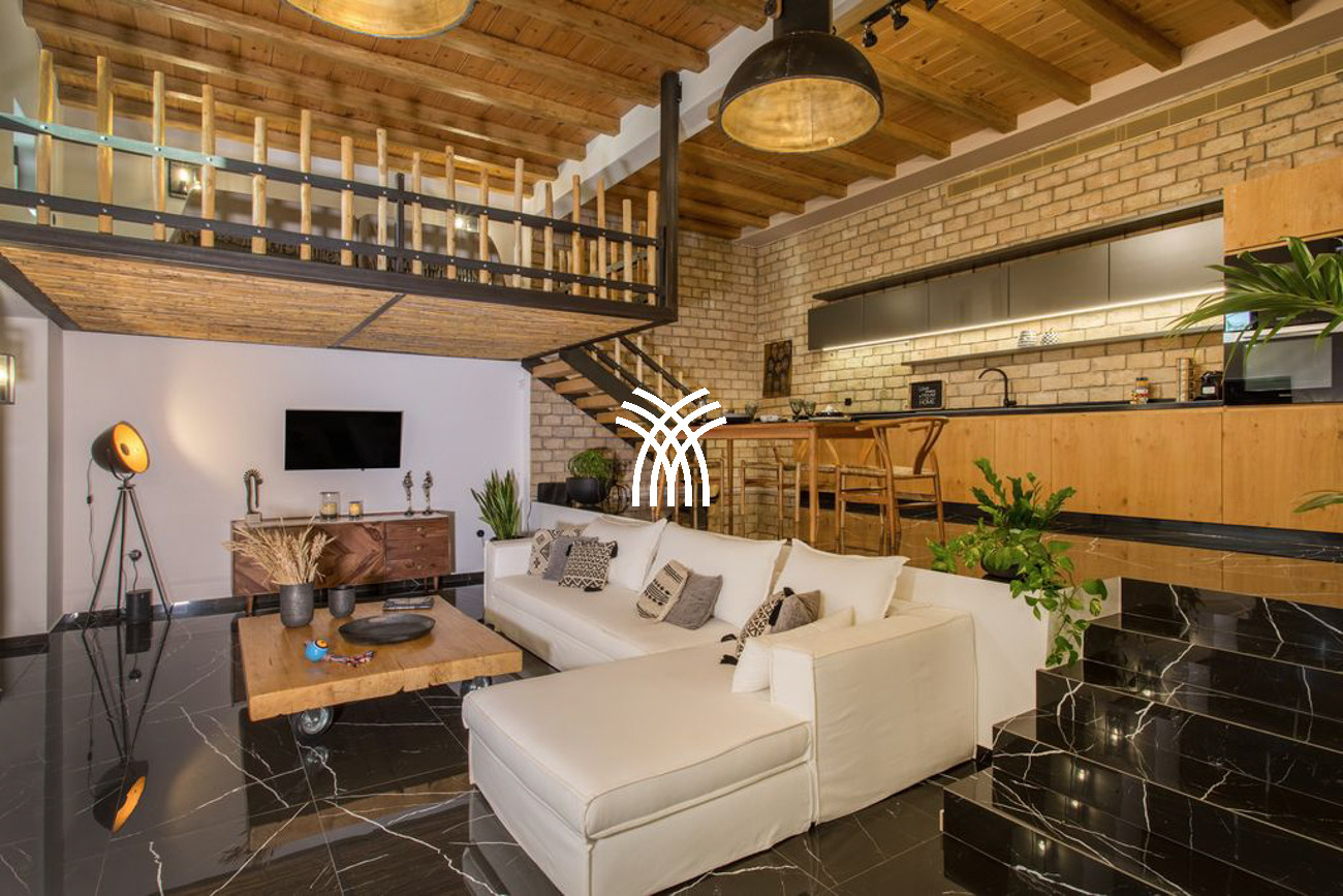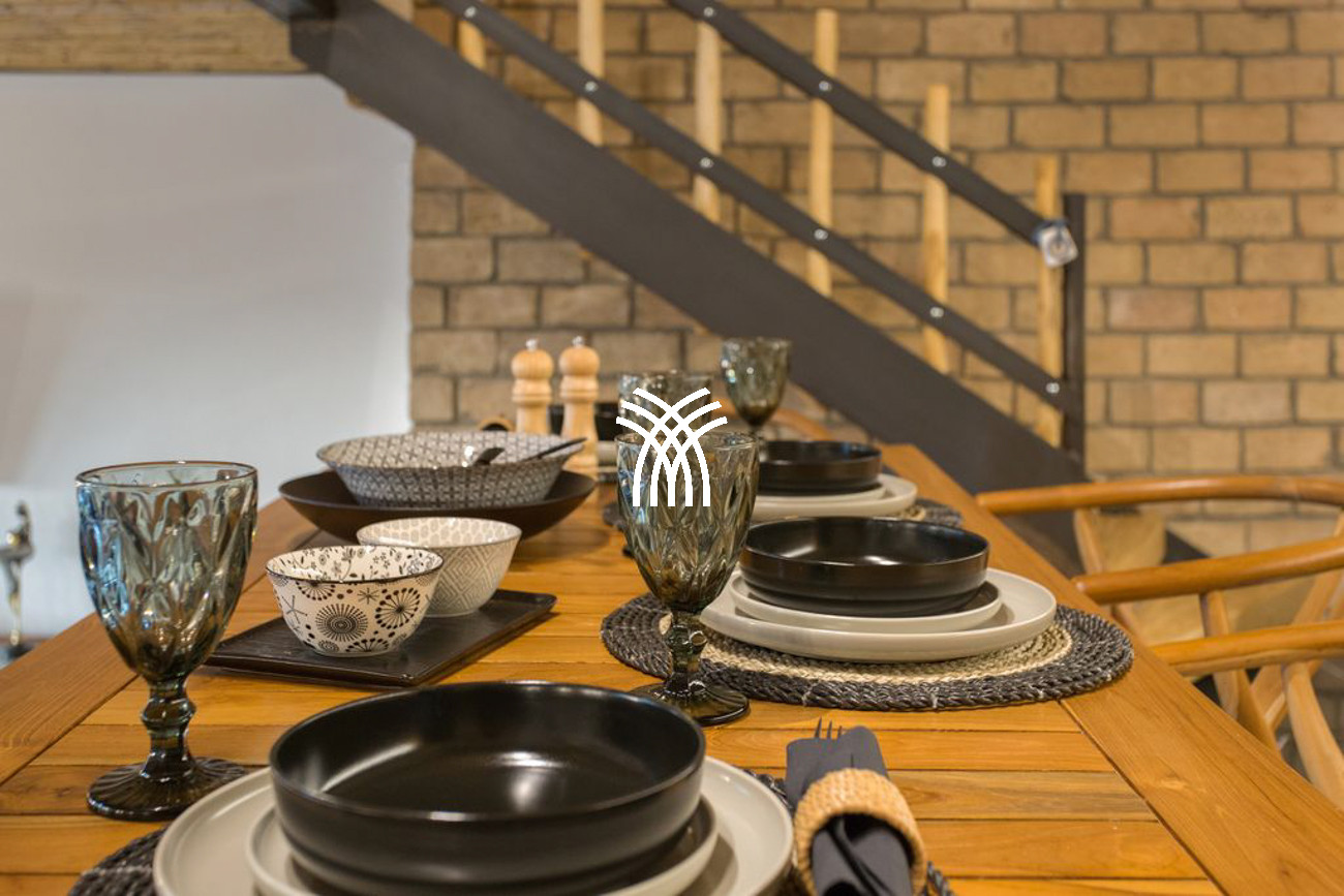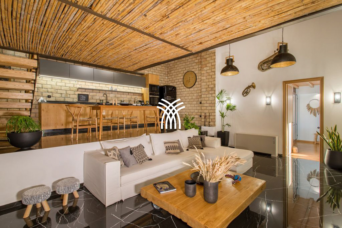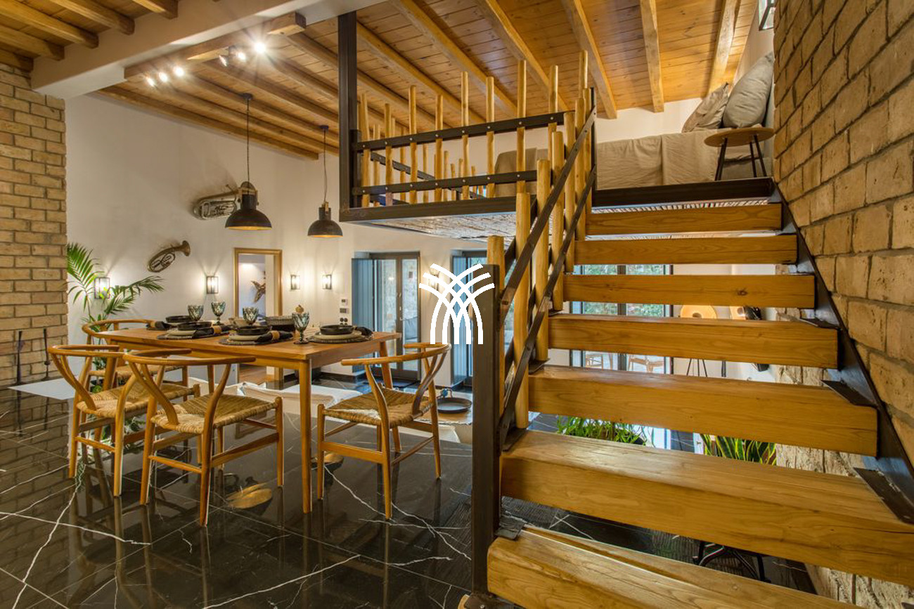 An additional independent unit, known as Akoya Pearl 2, is a 65 m² apartment located in the basement of the villa. It is connected internally by a staircase with a double door and lock to ensure privacy and separation, and it can also be accessed through a dedicated external gate near the main entrance. This apartment includes a fully equipped kitchen opening onto a spacious living and dining area, a corridor leading to a small storage room ideal for beach items and accessories, and a bedroom with twin beds that can be separated, complemented by a convertible sofa bed for a third guest and a private bathroom.
