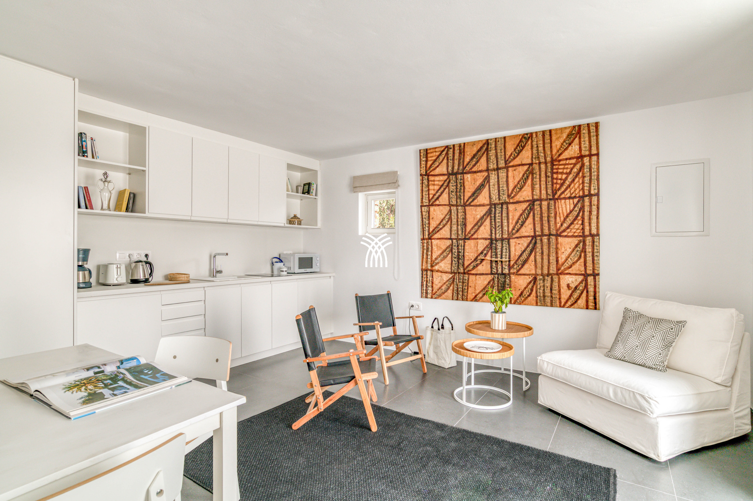 An additional independent unit, known as Akoya Pearl 2, is a 65 m² apartment located in the basement of the villa. It is connected internally by a staircase with a double door and lock to ensure privacy and separation, and it can also be accessed through a dedicated external gate near the main entrance. This apartment includes a fully equipped kitchen opening onto a spacious living and dining area, a corridor leading to a small storage room ideal for beach items and accessories, and a bedroom with twin beds that can be separated, complemented by a convertible sofa bed for a third guest and a private bathroom.