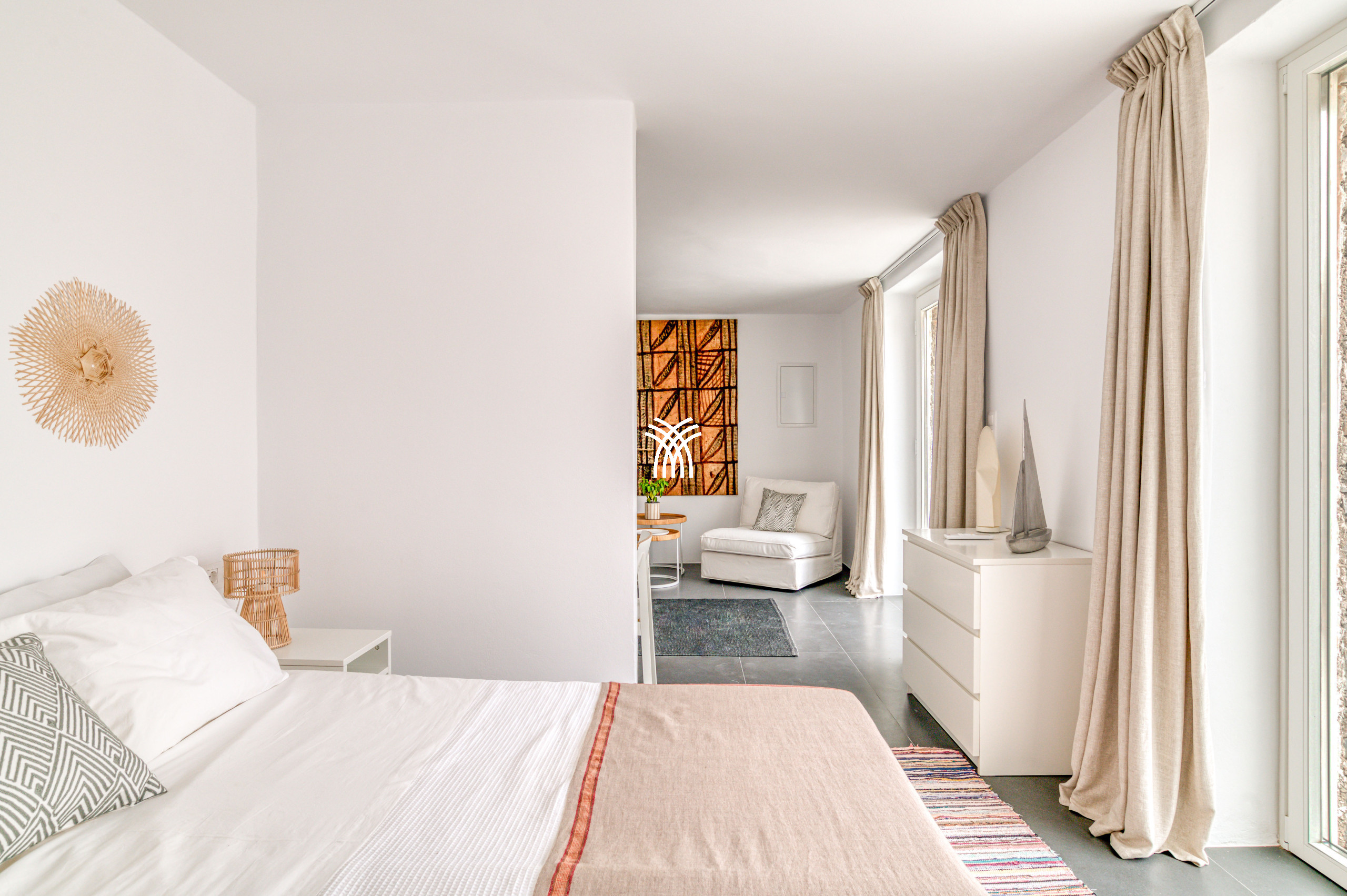 Throughout the residence, central cooling, an alarm system, and a safe box in the master bedroom ensure comfort and security. Guests enjoy a high level of service, including daily cleaning, sheet changes three times per week, daily towel changes, pool and beach towels, laundry service managed by the housekeeper, premium bathroom amenities featuring renowned Greek herbal products Korres, and slippers, all curated to elevate the experience of refined living.