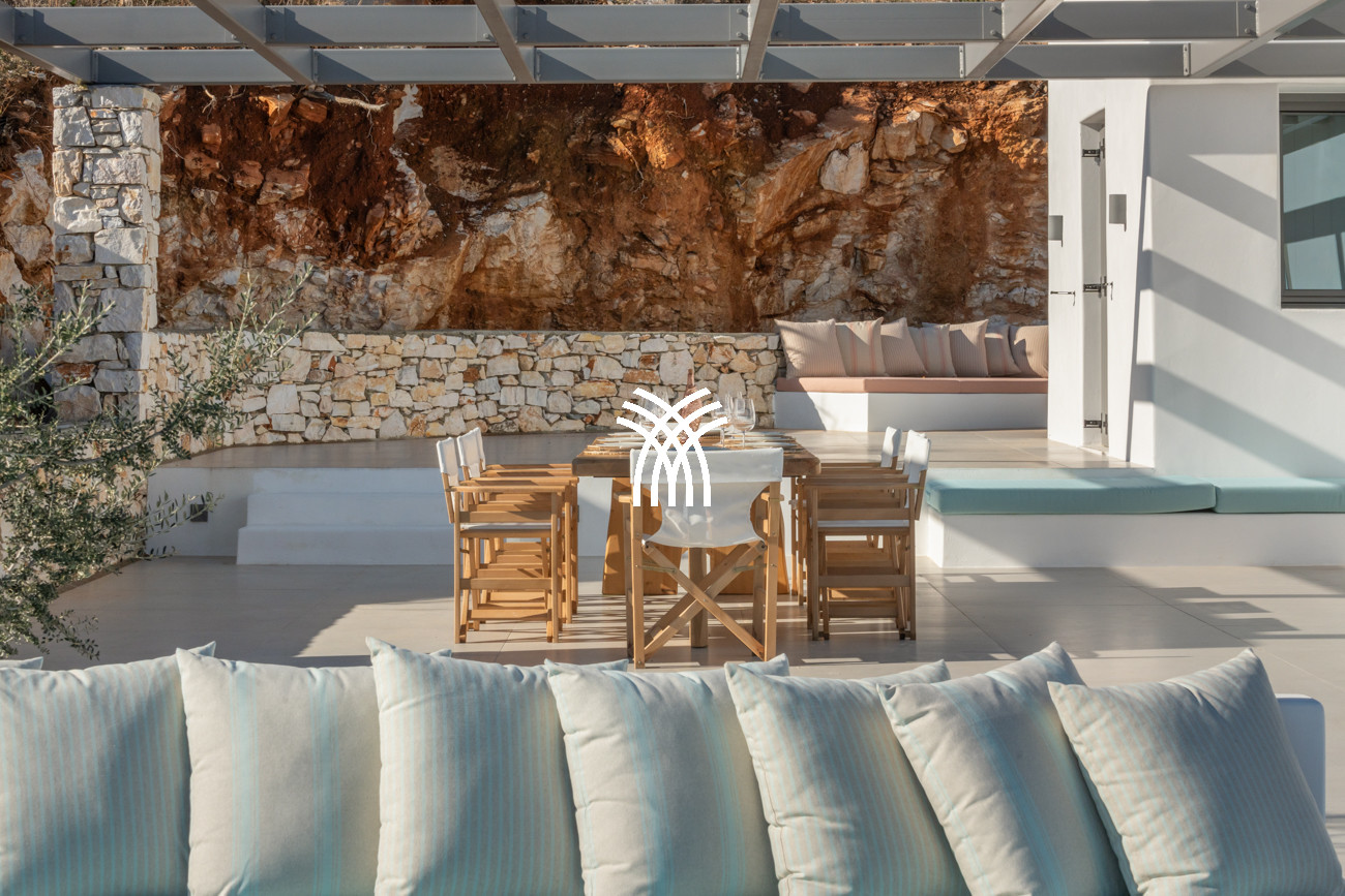 Expansive indoor spaces extend naturally onto generous terraces, inviting you to embrace the rhythm of island life from sunrise to sunset. The outdoor areas reveal an infinity pool and inviting lounge spaces that inspire moments of relaxation, convivial gatherings and quiet contemplation as the Aegean horizon unfolds before you. Whether enjoying a morning coffee bathed in golden light or an evening aperitif under the Parian sky, each moment becomes a celebration of beauty and serenity.