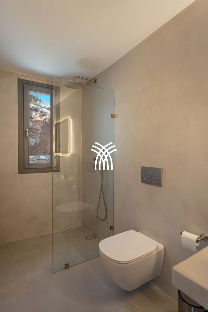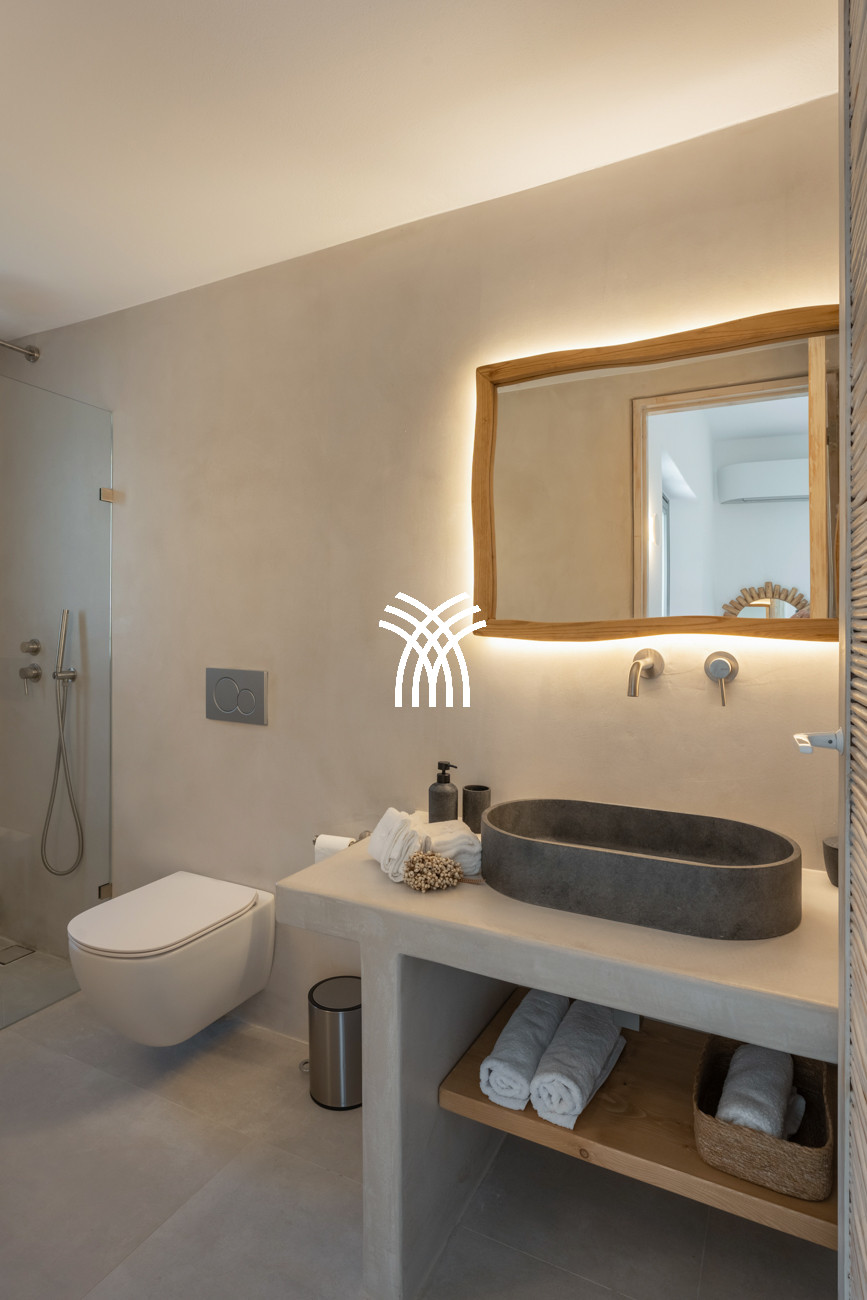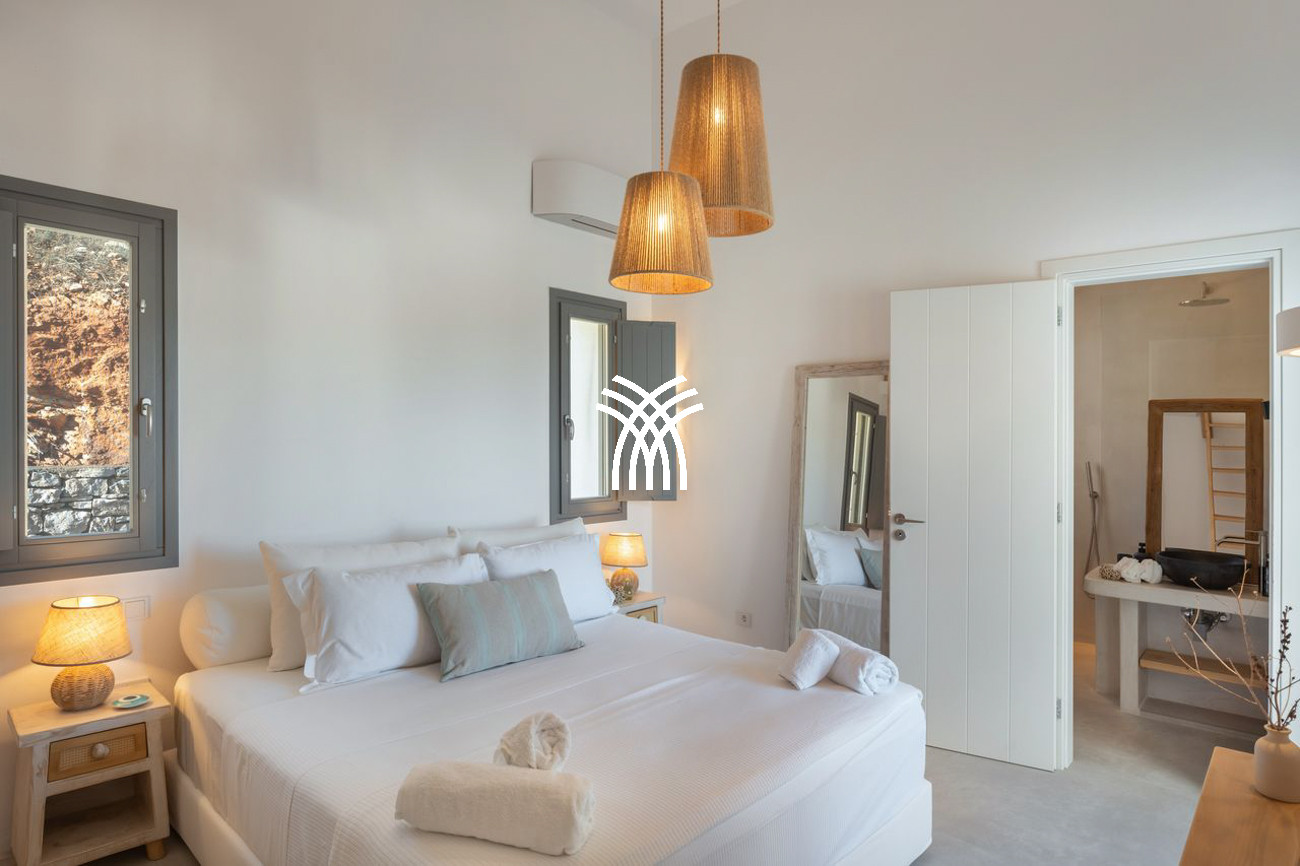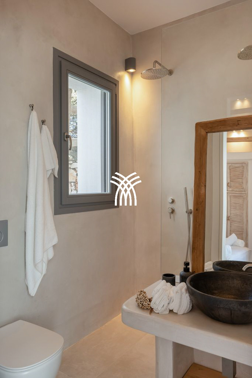 The estate features six spacious bedrooms, each with its own private bathroom, including two enhanced by mezzanines, creating an atmosphere of comfort and privacy for guests. Tailor-made furniture and carefully curated design details bring character and sophistication to the interiors, while modern amenities blend seamlessly with subtle Greek influences to form a warm and elegant ambiance. A fully equipped kitchen, Smart TV and high-speed Starlink Wi-Fi ensure effortless convenience, enhancing the refined lifestyle of a luxury villa rental Paros where every detail is conceived for comfort and aesthetic harmony.