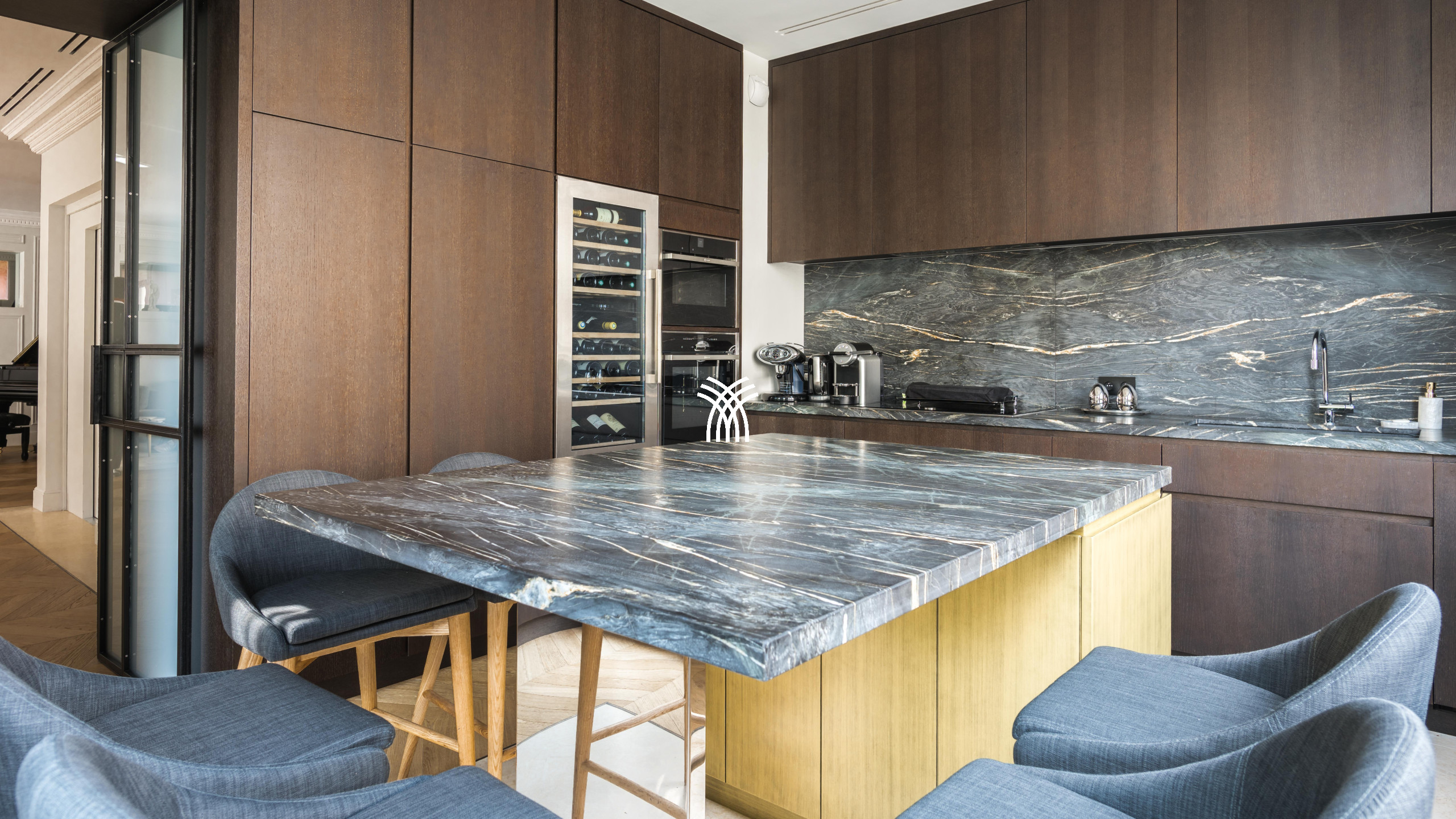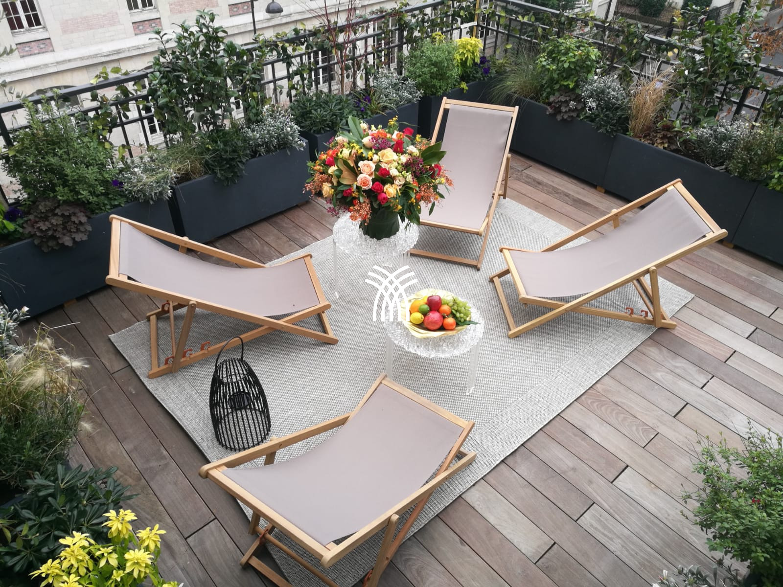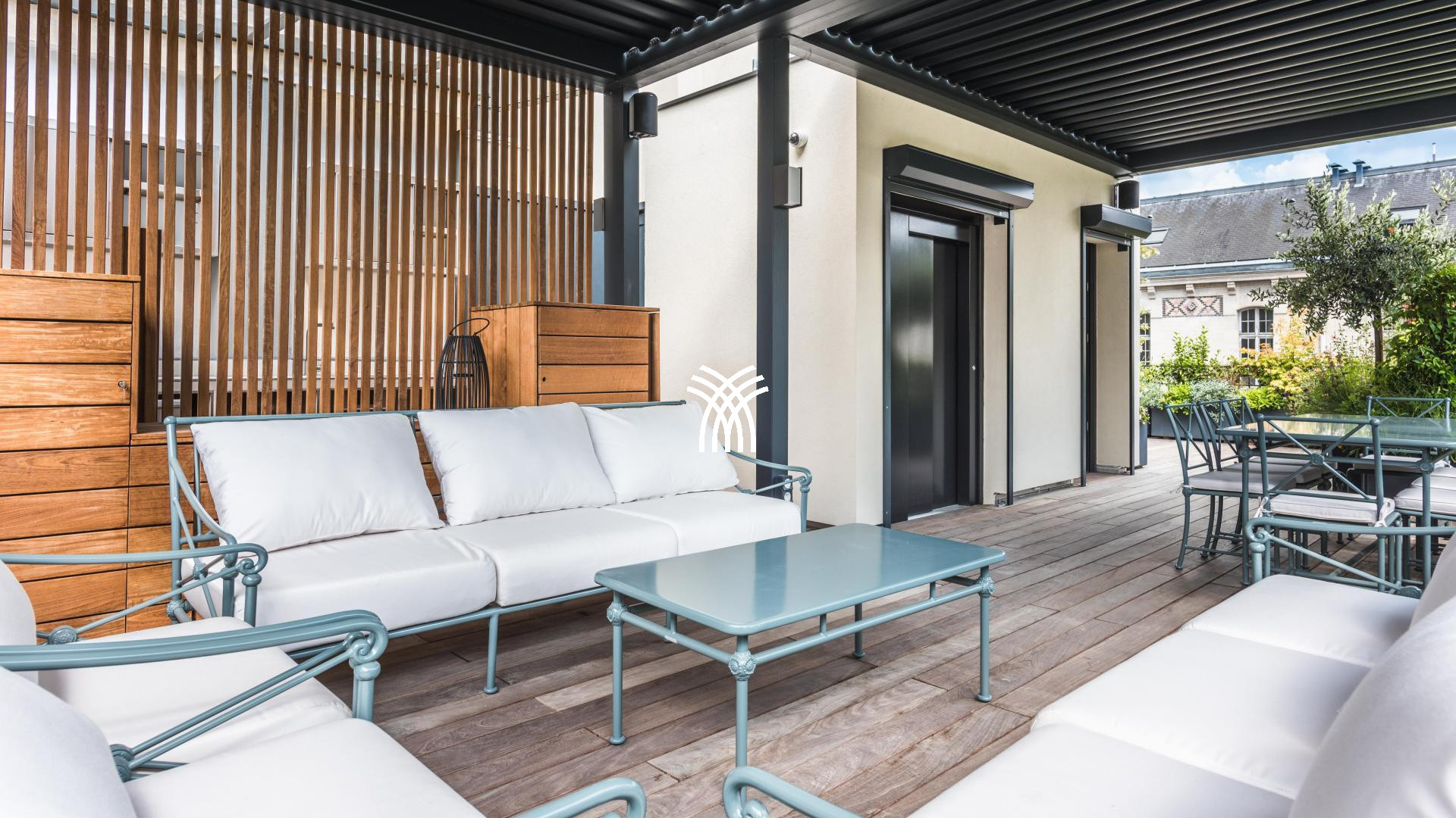 Outside, the 70 m2 rooftop terrace, fitted with a bioclimatic pergola, a summer kitchen and refined furniture, offers a spectacular setting to enjoy a dinner, organise a private concert or share an exceptional moment with loved ones with an unobstructed view of the Parisian rooftops.