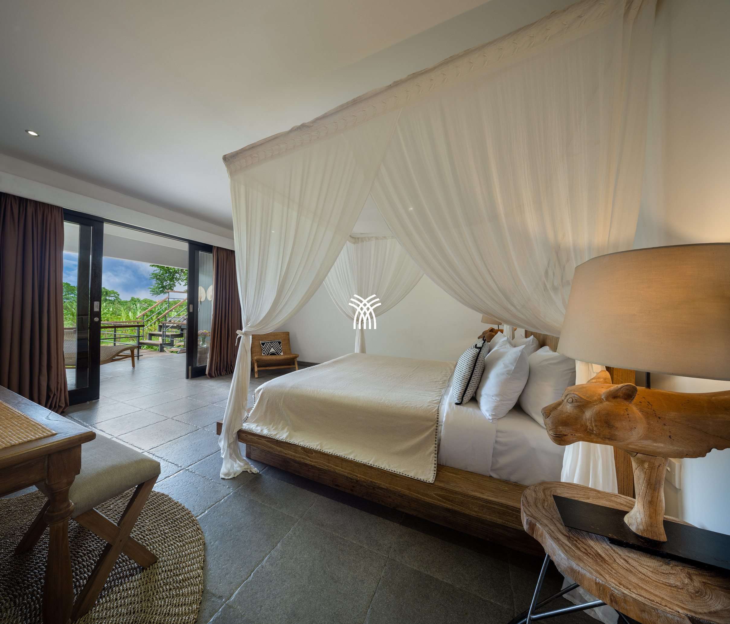 At the center of the villa, a spectacular 16 by 6-meter swimming pool invites moments of pure relaxation, whether enjoying a refreshing swim or unwinding beneath the gentle shade of traditional Balinese ‘Payung’ parasols. The open-plan living space rises with an airy sense of volume, naturally cooled by soft rice field breezes that flow effortlessly throughout the day, creating a harmonious indoor-outdoor ambiance.
