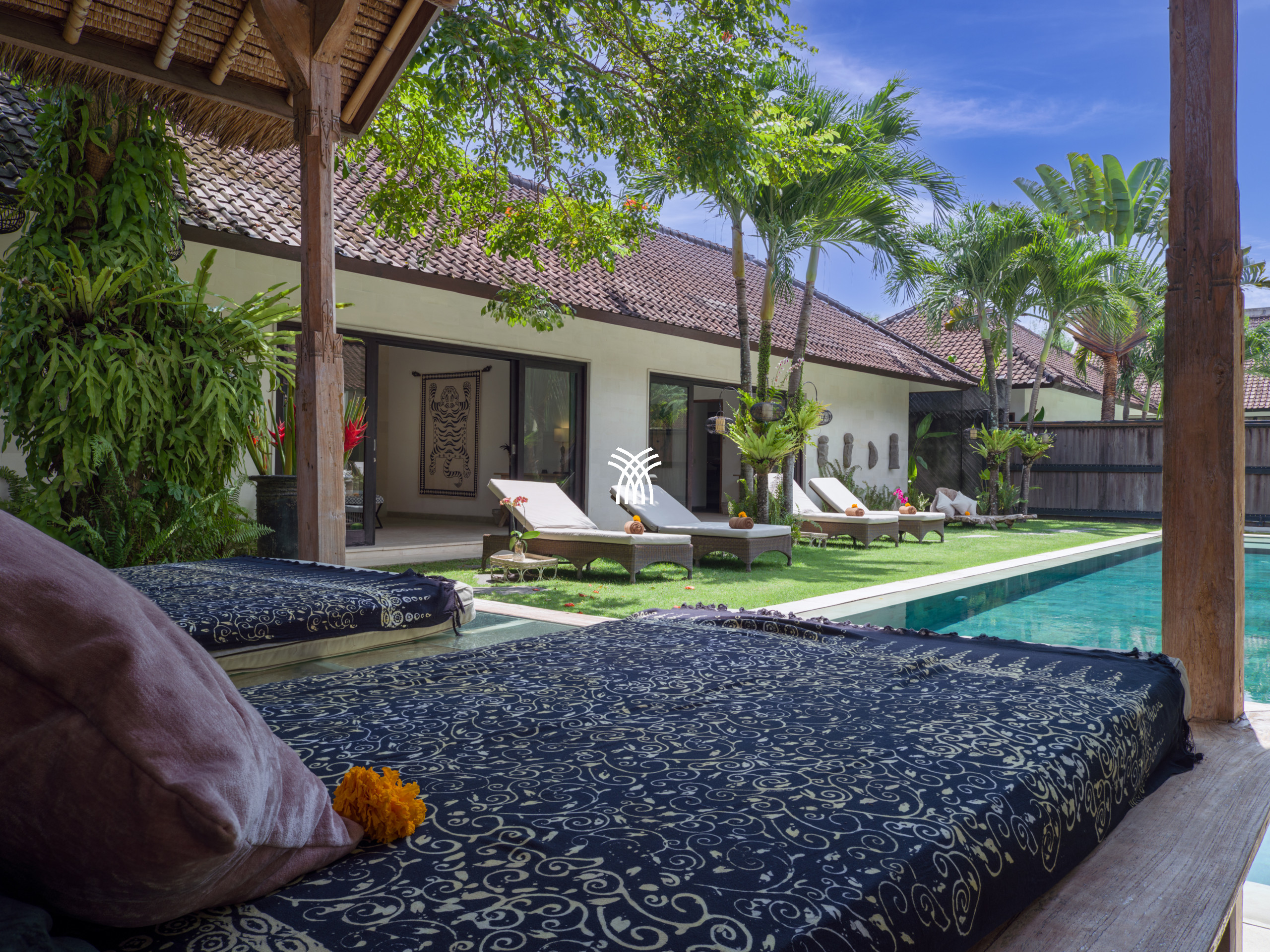 Villa Simprana is a spacious four-bedroom sanctuary nestled in the peaceful Bidadari area of Seminyak, offering an inviting escape for those seeking a luxury villa rental Indonesia and a serene yet well-connected luxury villa rental Bali. Surrounded by a large tropical garden, the villa creates a tranquil atmosphere where a private swimming pool and sunbeds invite long, unhurried days under the island sun.