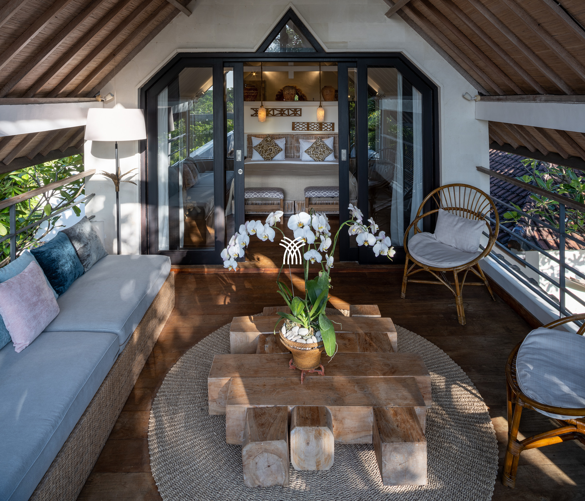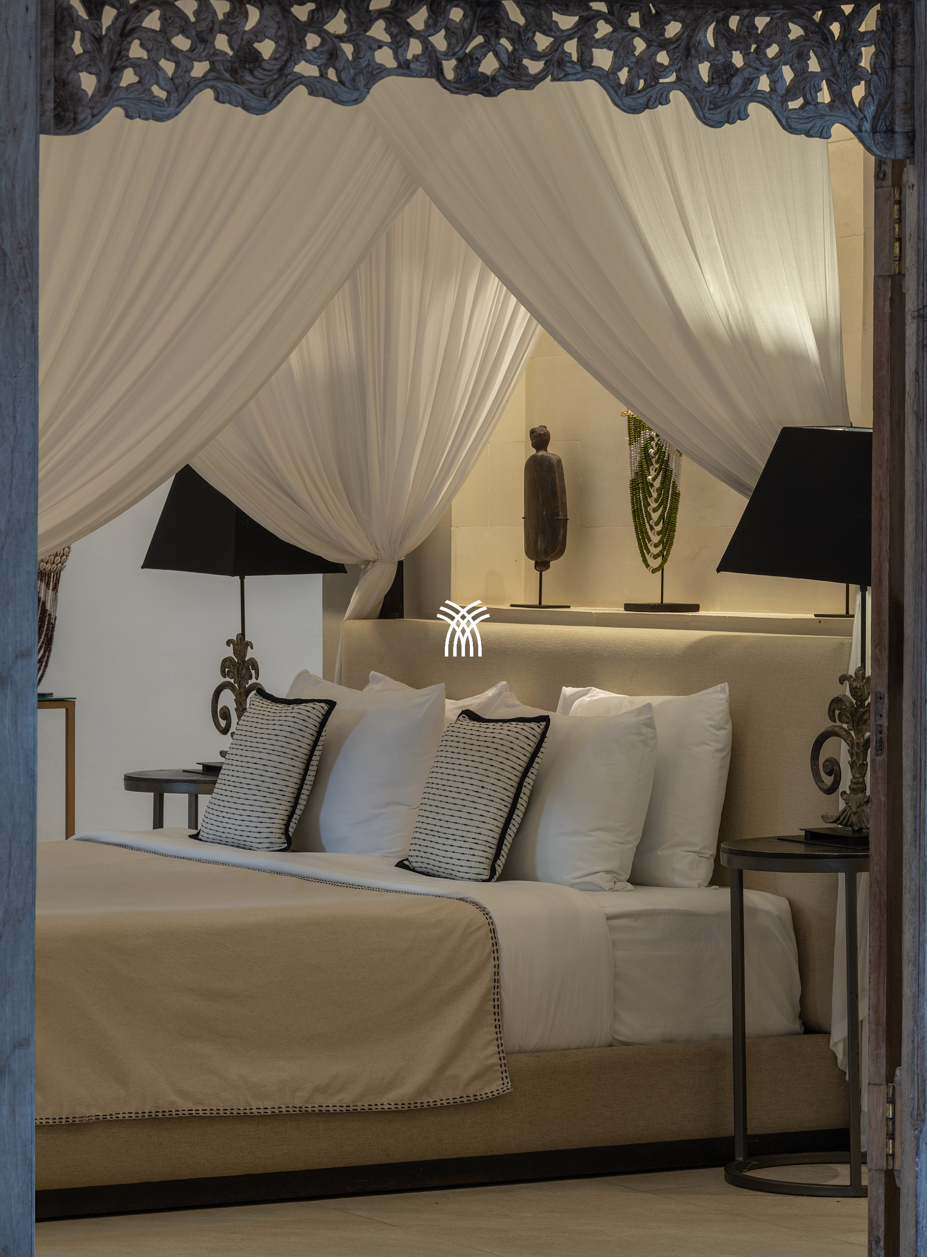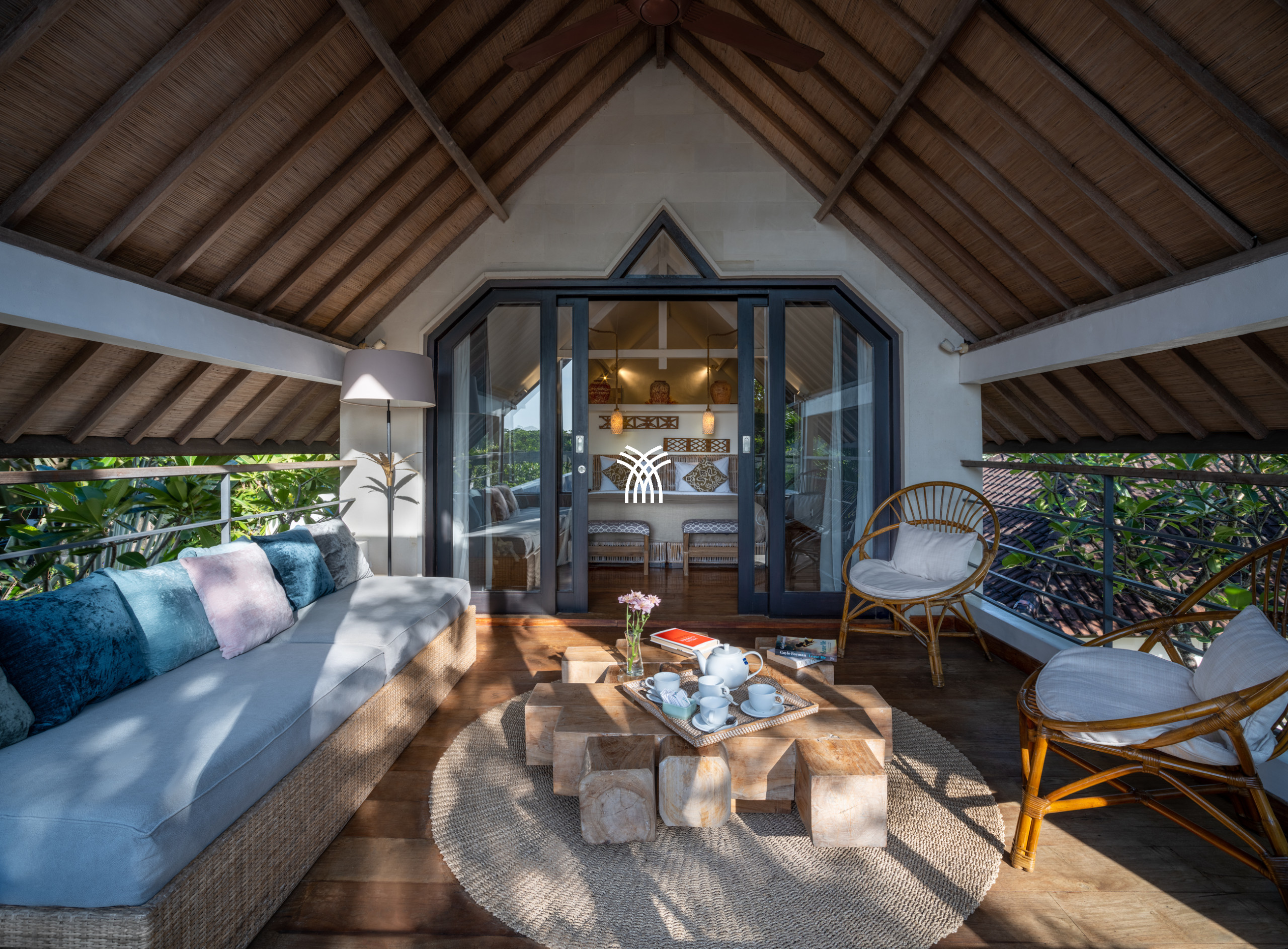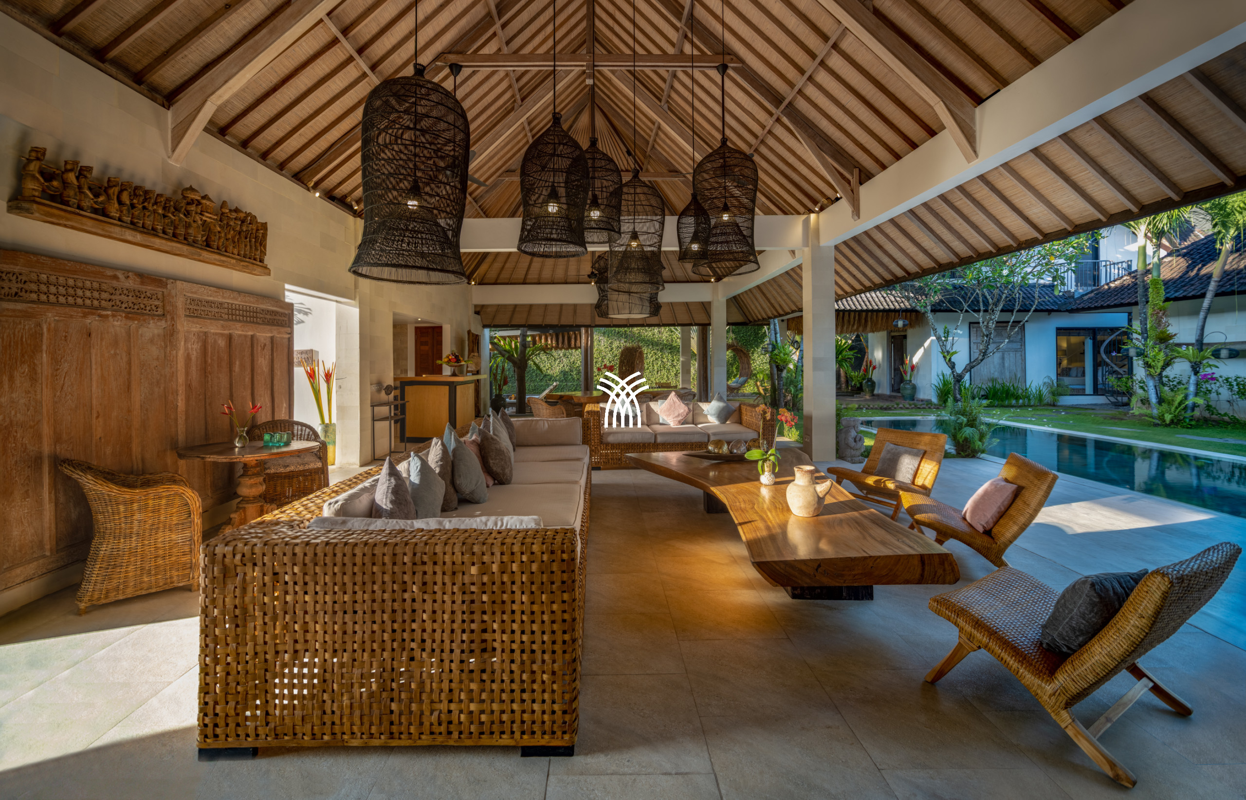 The interiors celebrate a contemporary Balinese aesthetic, enriched with warm Javanese wooden accents and a curated collection of tribal-inspired artwork that lends depth and cultural character to the space. Every detail has been thoughtfully considered to balance authenticity with modern living, including a fully equipped kitchen and advanced entertainment features such as a family-size television and surround sound system.