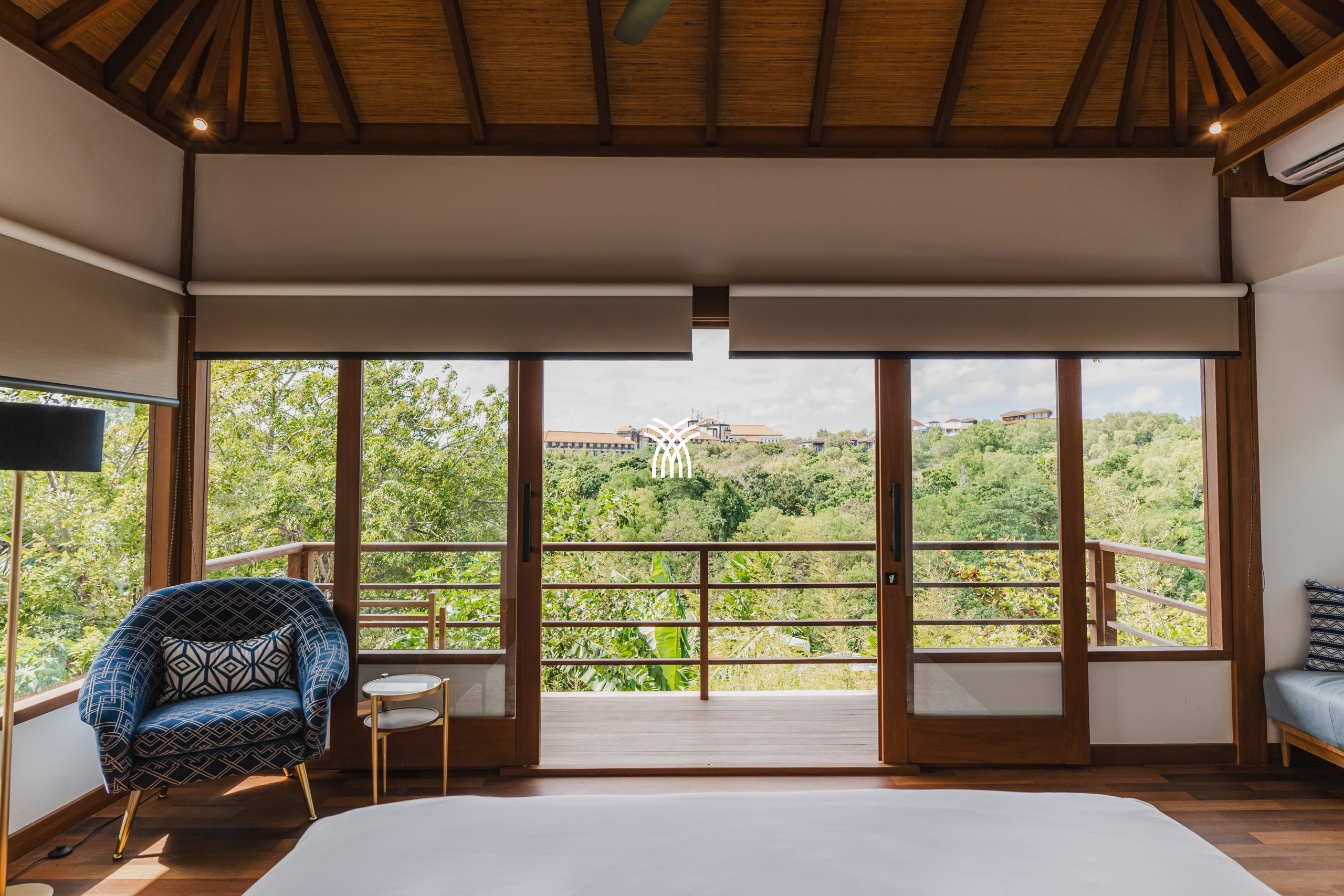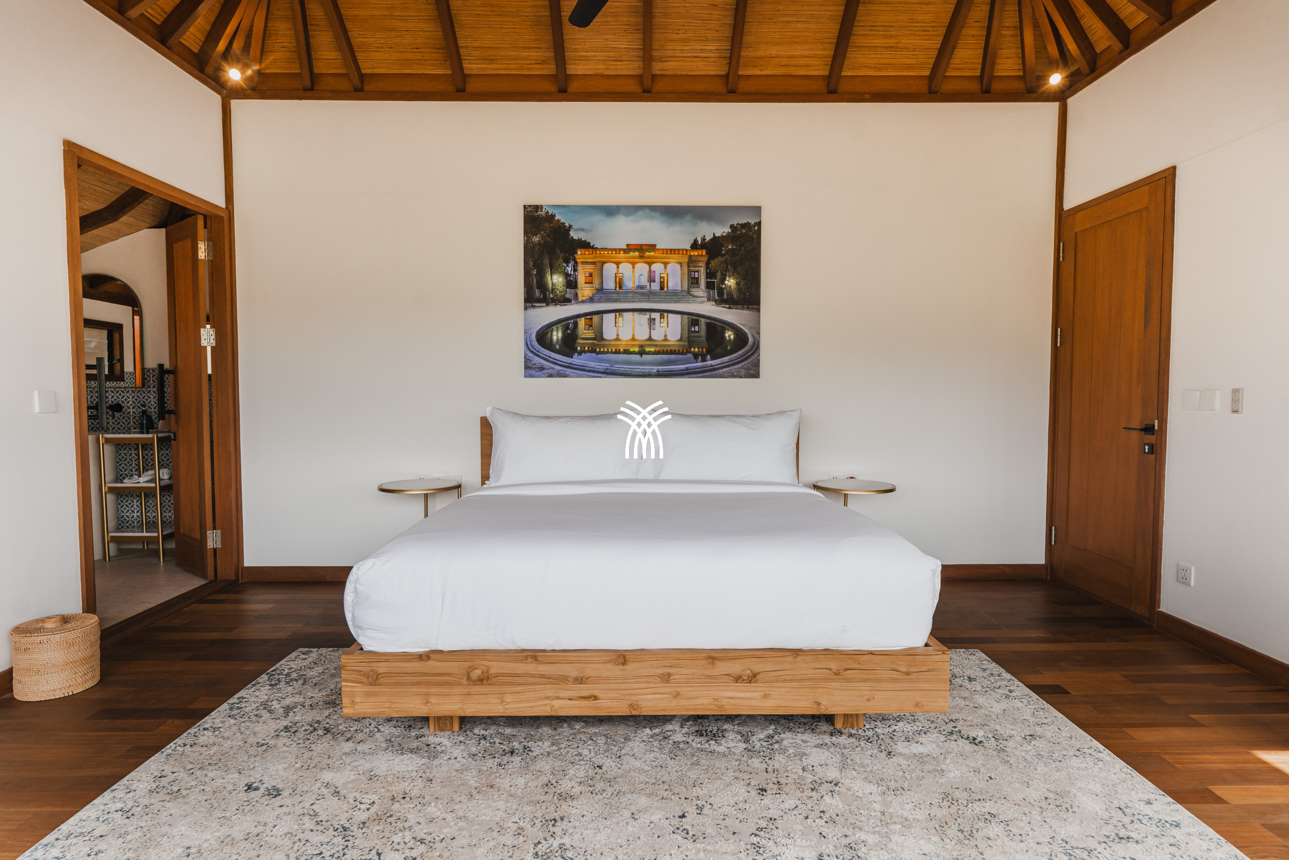 The villa’s layout enhances both privacy and connection with nature. Two bedrooms on the first level offer serene vistas, generous volumes, and high ceilings, while the ground-floor bedroom opens directly onto the pool and gardens, allowing guests to wake up immersed in greenery and sea breezes. The expansive lawn and gardens invite barefoot strolls, moments of contemplation beneath towering teak trees, and a gentle immersion into Bali’s natural rhythms, making every stay deeply restorative and emotionally enriching.